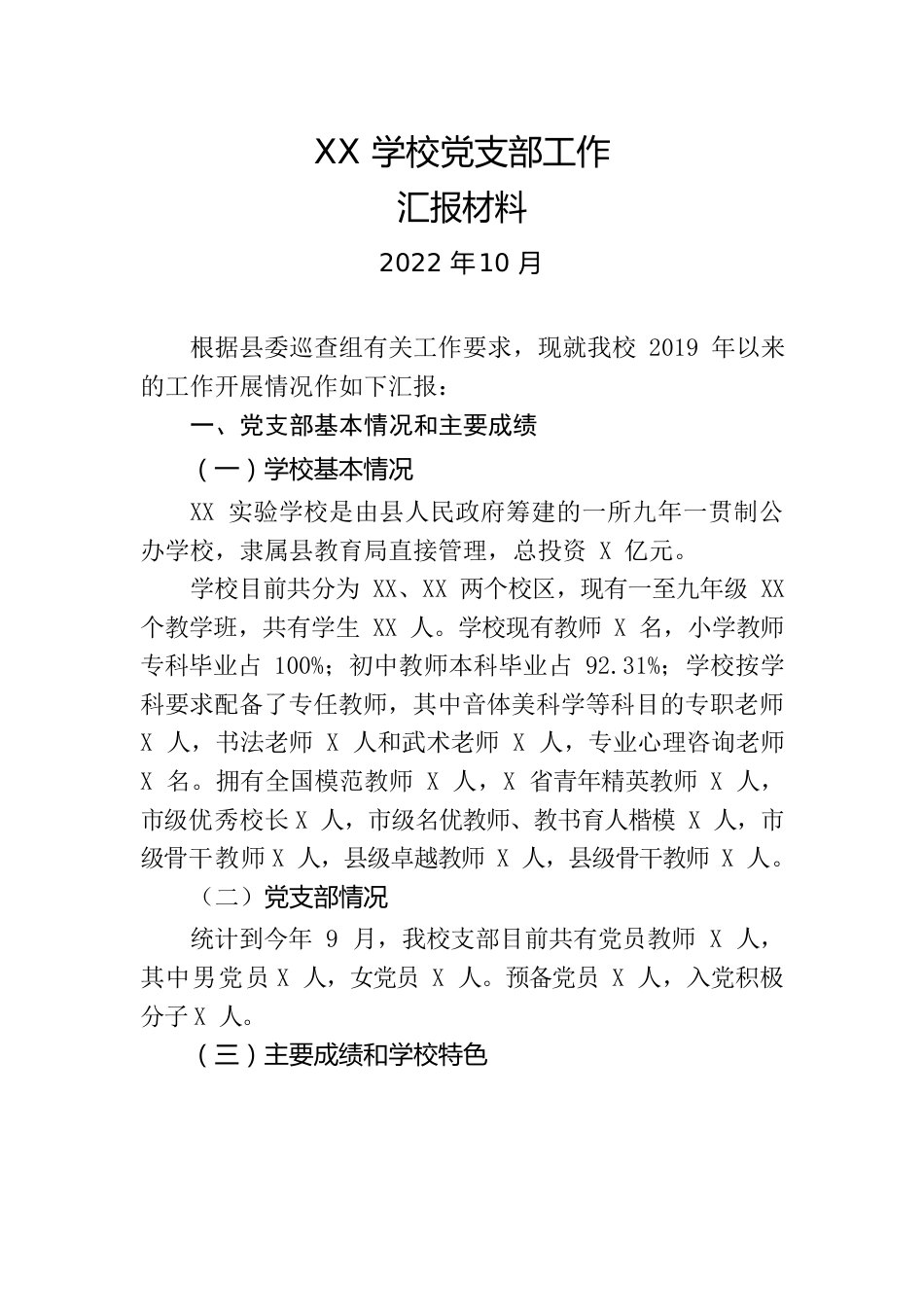 XX学校党支部工作汇报材料2022年10月根据县委巡查组有关工作要求,现就我校2019年以来的工作开展情况作如下汇报:一、党支部基本情况和主要成绩(一)学校基本情况XX实验学校是由县人民政府筹建的一所九年一贯制公办学校,隶属县教育局直接管理,总投资X亿元。学校目前共分为XX、XX两个校区,现有一至九年级XX个教学班,共有学生XX人。学校现有教师X名,小学教师专科毕业占100%;初中教师本科毕业占92.31%;学校按学科要求配备了专任教师,其中音体美科学等科目的专职老师X人,书法老师X人和武术老师X人,专业心理咨询老师X名。拥有全国模范教师X人,X省青年精英教师X人,市级优秀校长X人,市级名优教师、教书育人楷模X人,市级骨干教师X人,县级卓越教师X人,县级骨干教师X人。(二)党支部情况统计到今年9月,我校支部目前共有党员教师X人,其中男党员X人,女党员X人。预备党员X人,入党积极分子X人。(三)主要成绩和学校特色1.连续获得“全国体育工作示范学校”“全国足球特色学校”“全国篮球特色学校”XX省文明校园”“XX省武术进校园特色学校”“XX省优秀基层党支部”“XX省网络示范学校”“XX省知识产权保护试点学校”“XX市文明校园”“XX市书香校园”“XX市科技示范学校”“XX县教育系统目标管理绩效评估先进单位”等奖项及荣誉称号。2.2021年学校荣获“XX省中小学知识产权教育试点学校”荣誉称号,2022年荣获XX省科技创新教学“十佳”学校。3.我校是XX县素质教育的窗口示范学校,每年开展“五节”“五进”活动。“五节”即读书节、体育节、艺术节、科技节、英语节;“五进”即进军营、进工厂、进农村讲社区、进超市等社会实践活动。二、党建引领,教育质量和师德师风建设两手抓1.深入贯彻落实习总书记中国特色社会主义思想,坚持以人民为中心的发展思想,坚持不懈地抓防溺水、防校园欺凌、防性侵、防心理问题引发的极端事件、交通安全、消防安全、食品和饮用水安全、校园周边环境安全等各项安全工作,确保不出一起安全责任事故。2.坚持党建引领,重视党员的政治理论学习。2019年进行“不忘初心牢记使命”主题教育和干部作风集中整治培训;2020年学习《习近平在湖南考察的讲话精神》,传承红色基因,力求把思政课办得越来越好;2021年开展党史学习,深刻感悟我党100年奋斗历史。党员每期都要有政治理论学习笔记,“三会一课”、学习强国、党史学习,还有每年一次的“红色之旅”集中学习,洗礼心灵,坚定“四个自信”。3.每年进行师德师风集中学习。要求全体老师严守“教育十条红线”,将师德师风建设与年度考核、教育教学管理等师资队伍建设的其他内容有机结合起来。4.坚持以教学为中心,取得丰硕成果。2018年我校首届初中毕业班获县中考质量评价第X名,2019年以来,我校历年中考获全县前X名,历年来被评为县教育教学质量一等奖,连年被评为县教育质量目标管理绩效评估先进单位。5.常抓防疫工作。健全机制,强化联防联控,把各项防控工作措施执行到位,坚持防疫与教学两手抓。三、三年来专项检查及整改情况(一)党支部工作每年9月,学校进行师德师风先进个人评选,并组织优秀教师代表在教师大会上进行优秀典型事迹宣讲,学校微信公众号、校刊都予以宣传报道。每年的年底,学校评选“感动XX人物”,加强模范党员和优秀教师的引领示范作用。2021年,结合县教育局的师德师风建设年实施方案,学校党支部制定了学校层面的承诺内容和党员教师个人的师德承诺,举行了师德宣誓,签订了《XX实验学校师德承诺书》。(二)教学常规管理2020年6月,为迎接义务教育均衡发展迎国检做准备,第X督学责任区对我校进行了督查,对我校迎国检各项指标都已达标给予了充分的肯定,对存在的问题进行了口头交流,并于五天之内整改到位。(三)财务工作2020年5月,根据县里统一部署,审计局对我校2020年5月以前的财务进行了专项审计,已整改到位,清单交审计局。2021年10月,省审计厅审计县级教育经费延伸到校,对我校进行了为期三天的检查,对检查结果较为满意,当时进行了口头反馈,无书面整改清单。四、学校存在的主要问题学校在全面贯彻党的教育方针,执行《中国共产党章程》和其他党内法规等...