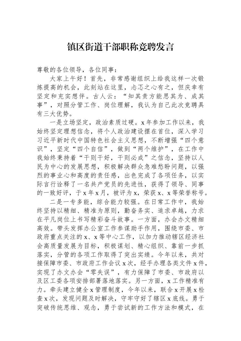 镇区街道干部职称竞聘发言尊敬的各位领导,各位同事:大家上午好!首先,非常感谢组织上给我这样一次锻炼提高的机会,此刻站在这里,忐忑之心有之,但庆幸有坚定和充实想伴。古人云:“知其责方能思其为、成其事”,对照分管工作、岗位理解,我认为自己此次竞聘具有三大优势。一是立场坚定,政治素质过硬。x年参加工作以来,我始终坚定理想信念,将个人政治建设摆在首位,深入学习习近平新时代中国特色社会主义思想,不断增强“四个意识”,坚定“四个自信”,做到“两个维护”,在工作中我始终秉持着“干则干好,干则必成”之信念,坚持以人民为中心的发展思想,积极解决群众急难愁盼问题,以强烈的事业心和高度的责任感,出色完成了各项任务,以实际言行诠释了一名共产党员的先进性,获得了领导、同事的一致好评,于x年x月,被评为x,荣获x、x等荣誉称号。二是一专多能,综合能力较强。在日常工作中,我始终坚持以精细、精准为原则,勤奋务实、追求卓越,力求在平凡岗位上书写精彩奋斗故事。一方面,办会办文精细高效。带头发挥办公室工作参谋助手作用,围绕市委、市政府重点关注的x、x等中心工作,以加力推动辖区经济社会高质量发展为目标,积极谋划、精心组织、靠前一步抓落实,分管的各项工作取得了突出实绩。今年以来,共对接保障市委、市政府工作会议x次,经手办理各类文件x件,实现了办文办会“零失误”,有力保障了市委、市政府以及区工委各项安排部署落地落实。另一方面,x工作精准有力。牵头建立健全x管理制度,今年以来,联合x开展x检查x次,发现问题及时解决,守牢守好了辖区x底线。勇于突破传统思维、观念,勇于尝试新的工作方法和模式,在推进数字政府建设工作中,积极引进先进理念和技术手段吸取先进地区经验做法,持续加强信息化建设,有效地提高了工作效率。三是基层起步,工作经验丰富。回首这扎根基层的x载春秋,我深刻体会到“根深方能叶茂”的成长真谛。这段与群众同坐一条板凳、共饮一壶茶的工作经历,让我的青春在沃土中生根发芽,在风雨里拔节生长。犹记得疫情防控最吃劲的寒冬,我与社区网格员们昼夜值守在交通卡口零下15度的深夜里,我们逐车查验“双码”,为货车司机送去热姜汤;全员核酸检测时,我创新采用“楼栋错峰法”,既避免人群聚集又提升检测效率。面对独居老人不会操作智能手机的困境,我们挨家挨户发放纸质通行证,手把手教会老人视频通话。这段经历教会我,基层治理的温度,就藏在细节的褶皱里。在村“两委”换届工作中,我作为工作组成员全程参与4个行政村的选举。从候选人资格审查到选民登记公示,从流动票箱管理到唱票计票监督每个环节都如履薄冰。记得某村出现候选人资格争议时,我连续3天翻阅历年档案,走访老党员核实情况,最终形成23页的调查报告,确保选举程序经得起历史检验。这些经历锻造了我严谨细致的工作作风,更让我明白基层民主的珍贵。安全生产专项整治中,我牵头建立“四色风险管控”体系。带领专家团队对辖区x家企业开展“解剖麻雀式”检查,建立“一企一档”隐患台账。记得在某化工企业检查时,发现反应釜压力表未按期校验,当即责令停产整改。企业主起初不理解,我耐心讲解近年同类事故案例并联系检测机构上门服务,用专业赢得理解。这种“执法+服务”的模式,使辖区安全事故率同比下降x%。躬身入局方知任重,脚踏泥土始觉情深。基层工作的千头万绪,教会我既要“十个指头弹钢琴”,又要“牵住牛鼻子”;群众期盼的万家灯火,鞭策我既要做显功也要做潜功。这段浸透着汗水与泥土芬芳的成长历程,已内化为我生命中最坚实的力量,必将支撑我在新征程上走得更稳、行得更远。四是自重自醒,作风严谨务实。本人始终恪守廉洁自律准则,严格遵循党的各项纪律与规章,自觉接受组织及群众的全面监督。工作中始终保持政治清醒,审慎行使职权,杜绝以权谋私和权力滥用。同时注重发挥示范引领作用,通过自身躬行实践带动身边同事与团队成员共同进步本人严格贯彻落实中央八项规定要求,坚决抵制”四风”不良倾向,树立了新时代党员干部的良好形象。疾风知劲草,烈火见真金。不论结果如何,作为一名x区年轻干部,我都将怀着一往无前...