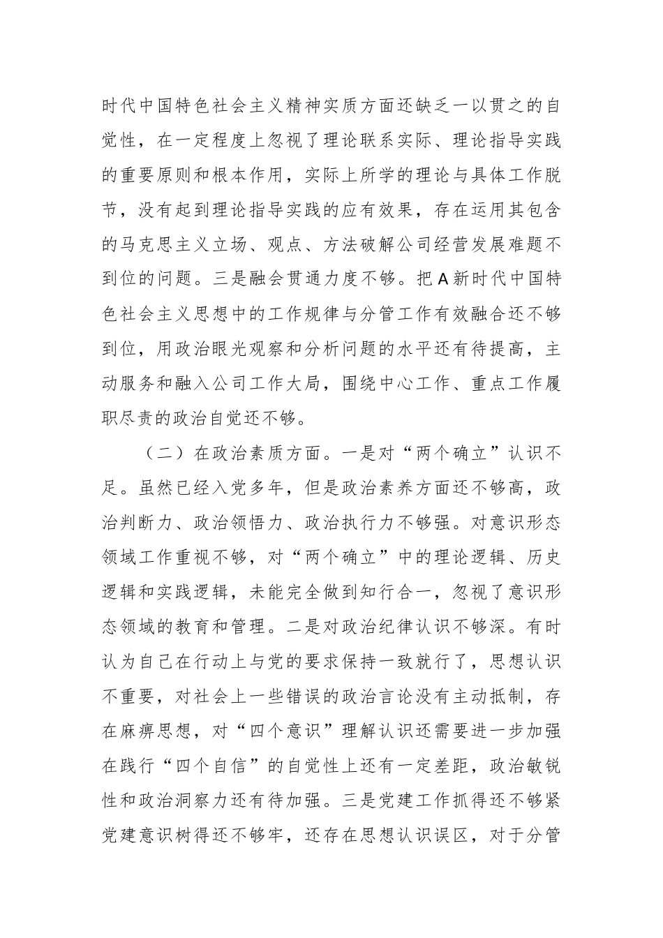 2023年主题教育专题民主生活会六个方面检视剖析材料(2篇)2023年专题民主生活会检视剖析材料按照关于开展主题教育的要求部署,我紧紧围绕此次主题教育专题民主生活会的会议主题,在深化理论学习、广泛征求意见的基础上,对照实施方案明确的六个方面重点查摆内容,着力查找存在的突出问题,深挖问题产生的根源,明确努力方向和整改措施。下面,按照要求作对照检查。一、个人有关事项说明经过梳理检查,今年以来我个人、家庭、亲属没有被组织约谈、函询、诫勉谈话和问责等情况,本人重大事项能按规定如实向组织汇报,到目前为止所涉及个人重大事项与向上级组织部门报告事项一致,不存在少报、瞒报、漏报等问题。配偶、子女及其配偶无经商办企业情况,配偶子女无房产投资及违反公务用车等情况。二、存在的问题(一)在理论学习方面。一是学习举措强度不够。在工作中经常满足于完成公司组织的理论中心组学习等“规定动作”,存在着集中学习少、专题讨论少、剖析问题少的情况,学习的针对性、时效性、系统性需要加强,对于学什么、怎么学缺乏明确的认识。二是系统研究深度不够在领会A新时代中国特色社会主义精神实质方面还缺乏一以贯之的自觉性,在一定程度上忽视了理论联系实际、理论指导实践的重要原则和根本作用,实际上所学的理论与具体工作脱节,没有起到理论指导实践的应有效果,存在运用其包含的马克思主义立场、观点、方法破解公司经营发展难题不到位的问题。三是融会贯通力度不够。把A新时代中国特色社会主义思想中的工作规律与分管工作有效融合还不够到位,用政治眼光观察和分析问题的水平还有待提高,主动服务和融入公司工作大局,围绕中心工作、重点工作履职尽责的政治自觉还不够。(二)在政治素质方面。一是对“两个确立”认识不足。虽然已经入党多年,但是政治素养方面还不够高,政治判断力、政治领悟力、政治执行力不够强。对意识形态领域工作重视不够,对“两个确立”中的理论逻辑、历史逻辑和实践逻辑,未能完全做到知行合一,忽视了意识形态领域的教育和管理。二是对政治纪律认识不够深。有时认为自己在行动上与党的要求保持一致就行了,思想认识不重要,对社会上一些错误的政治言论没有主动抵制,存在麻痹思想,对“四个意识”理解认识还需要进一步加强在践行“四个自信”的自觉性上还有一定差距,政治敏锐性和政治洞察力还有待加强。三是党建工作抓得还不够紧党建意识树得还不够牢,还存在思想认识误区,对于分管部门的党建工作责任链条拧得不紧、业务和党建融合还不够深。(三)在能力本领方面。一是工作思维还不够开阔。在工作当中新发展理念树立不够牢靠,工作中系统思维运用不够充分,没有以更加开阔的眼界、思路和胸襟,从推动公司发展大局的高度看待工作,对新形势新要求适应还不够快,在日常工作过程中,凭经验靠制度循规蹈矩多,敢创新善创新锐意进取少,突出表现在XXX创新、XXX反馈机制执行方面还没有真正地建立长效机制。二是业务提升还不够明显。在落实上级重要部署要求的方法还不够务实管用,把握上级会议精神不够准确,推动落实上级议定事项不够及时、不够有力,业务能力没有做到与时俱进,把上级要求部署融入实践工作当中还有欠缺。三是斗争本领还有待提升。面对新形势新任务,缺乏政治敏锐性和政治洞察力,斗争本领还不够强,应对风险挑战的本领还有待进一步提升。在配合班子完成XXX工作,推进XXX工作,XXXX等方面下的功夫还不够大,硬的措施和实的招数不够多,特别在控本增盈上措施还不够多。(四)在担当作为方面。一是引领作用发挥还不够充分。作为公司班子成员,统筹作用发挥不够充分,系统性体系化抓大事谋大事还不够,对如何牢牢把握A总书记点的问题、教的方法、指出的路径,更好地融入工作服务大局,思考得还不够深,将A总书记重要讲话重要指示精神转化为干事不竭动力的具体措施、具体实践做得还不够到位。二是创新意识还有待提升。有时仅停留在确保完成各项重点工作任务和推进日常工作上。存在工作按部就班,想问题、做决策顾虑较多,开拓创新少,就工作干工作多,主动落实少研究情况多,解决问题少,工作上缺乏新意,缺少亮点,习惯于用...