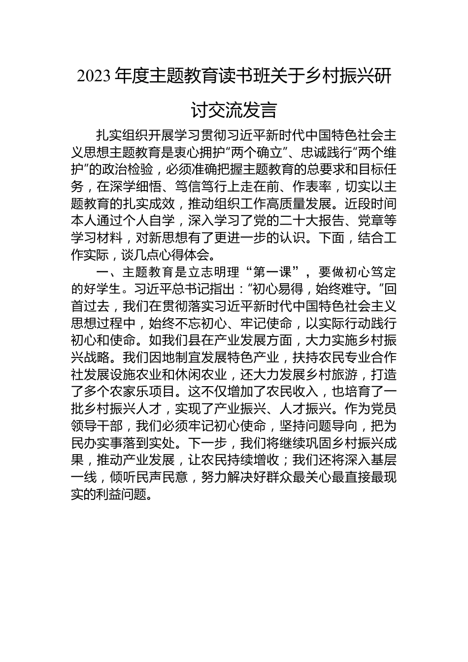 2023年度主题教育读书班关于乡村振兴研讨交流发言扎实组织开展学习贯彻习近平新时代中国特色社会主义思想主题教育是衷心拥护“两个确立”、忠诚践行“两个维护”的政治检验,必须准确把握主题教育的总要求和目标任务,在深学细悟、笃信笃行上走在前、作表率,切实以主题教育的扎实成效,推动组织工作高质量发展。近段时间本人通过个人自学,深入学习了党的二十大报告、党章等学习材料,对新思想有了更进一步的认识。下面,结合工作实际,谈几点心得体会。一、主题教育是立志明理“第一课”,要做初心笃定的好学生。习近平总书记指出:“初心易得,始终难守。”回首过去,我们在贯彻落实习近平新时代中国特色社会主义思想过程中,始终不忘初心、牢记使命,以实际行动践行初心和使命。如我们县在产业发展方面,大力实施乡村振兴战略。我们因地制宜发展特色产业,扶持农民专业合作社发展设施农业和休闲农业,还大力发展乡村旅游,打造了多个农家乐项目。这不仅增加了农民收入,也培育了一批乡村振兴人才,实现了产业振兴、人才振兴。作为党员领导干部,我们必须牢记初心使命,坚持问题导向,把为民办实事落到实处。下一步,我们将继续巩固乡村振兴成果,推动产业发展,让农民持续增收;我们还将深入基层一线,倾听民声民意,努力解决好群众最关心最直接最现实的利益问题。二、主题教育是强基赋能“第一课”,要做奋发有为的好学生。习近平总书记指出:“要坚持问题导向,抓住基层干部最需要、最关心、最直接、最现实的问题,把主题教育进行到基层干部心坎上。”我们县在开展主题教育中,着力强化基层党组织建设,全面提升基层干部能力。我们采取“一村一策”方式,因村制宜开展教育培训,针对不同村干部存在的薄弱环节,有针对性地强化培训。如对财务管理能力较弱的村,我们重点培训财务知识,提高其财务管理水平。对党员发展不足的村,我们开展党员发展经验交流,帮助其扩大党员队伍规模。两年来,我们县基层党组织和干部队伍建设取得明显成效,党员队伍壮大到12.5万人,村“两委”班子更加过硬。作为党员领导干部,我们必须牢记全心全意为人民服务的宗旨,把解决好人民最关心最直接最现实的问题作为第一要务。下一步,我们将继续深入一线调查研究,找差距、抓落实,推动解决群众反映强烈的突出问题。我们还将加强基层干部培训,通过轮训、培训、交流等方式,全面提升基层干部的工作能力和服务群众的水平。三、主题教育是正心明道“第一课”,要做怀德自重的好学生。习近平总书记指出:“要坚持正面教育,用正能量浇灌心灵。”我们县在开展主题教育中,注重正面激励,充分发挥表彰激励的正向作用。我们先后评选表彰100名县级先进个人,1000名乡镇级先进个人,10万名村级先进个人,并给予精神和物质奖励。这些先进典型发挥了重要示范引领作用,激励广大党员干部更加自觉地践行初心和使命。同时,我们还开展“最美党员”“最美村官”等评选活动,充分发挥道德模范的感召力量。这些举措有效推动全县风清气正的政治生态建设。作为党员领导干部,我们必须坚持党的优良作风,严格遵守党纪国法,做人做事怀德自重。下一步,我们将继续弘扬正气,树立良好形象,以实际行动践行初心和使命。我们还将加强作风建设,坚决反对形式主义、官僚主义,保持党同人民群众的血肉联系。让我们在学习贯彻习近平新时代中国特色社会主义思想中,不断提高政治站位,坚定理想信念,以永不懈怠的精神状态和一往无前的奋斗姿态,奋力开创新时代我们县各项事业新局面。