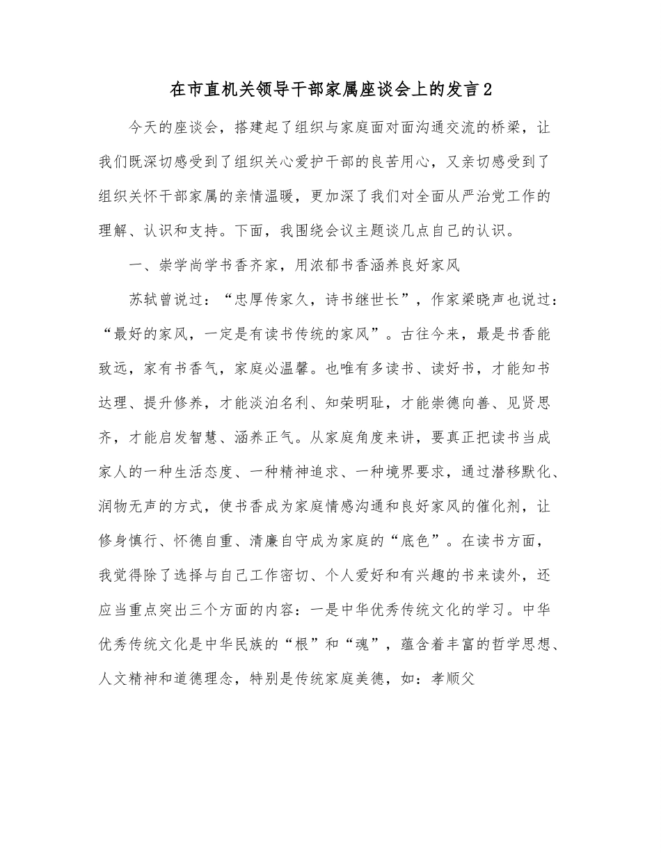 在市直机关领导干部家属座谈会上的发言2今天的座谈会,搭建起了组织与家庭面对面沟通交流的桥梁,让我们既深切感受到了组织关心爱护干部的良苦用心,又亲切感受到了组织关怀干部家属的亲情温暖,更加深了我们对全面从严治党工作的理解、认识和支持。下面,我围绕会议主题谈几点自己的认识。一、崇学尚学书香齐家,用浓郁书香涵养良好家风苏轼曾说过:“忠厚传家久,诗书继世长”,作家梁晓声也说过:“最好的家风,一定是有读书传统的家风”。古往今来,最是书香能致远,家有书香气,家庭必温馨。也唯有多读书、读好书,才能知书达理、提升修养,才能淡泊名利、知荣明耻,才能崇德向善、见贤思齐,才能启发智慧、涵养正气。从家庭角度来讲,要真正把读书当成家人的一种生活态度、一种精神追求、一种境界要求,通过潜移默化、润物无声的方式,使书香成为家庭情感沟通和良好家风的催化剂,让修身慎行、怀德自重、清廉自守成为家庭的“底色”。在读书方面,我觉得除了选择与自己工作密切、个人爱好和有兴趣的书来读外,还应当重点突出三个方面的内容:一是中华优秀传统文化的学习。中华优秀传统文化是中华民族的“根”和“魂”,蕴含着丰富的哲学思想、人文精神和道德理念,特别是传统家庭美德,如:孝顺父母、妻贤夫安,艰苦朴素、勤俭节约,公正廉洁、义利分明等等,这些都是家庭的宝贵精神财富。家和万事兴,作为家属,要把这些传统文化作为案头书、床头书,常翻常新、常学常明,把中华民族的传统优良家风融入到自己的家风建设之中,成为家庭的精神信仰和性格特征。二是习近平总书记关于家风建设重要论述的学习。习近平总书记曾讲过这样一段话,我记忆非常深刻,他说“我们每个人都有自己的家庭。健康的家庭生活,可以滋养身心,激励领导干部专心致志工作。群众看领导干部,往往要看领导干部亲属和身边工作人员,往往从这里来判断领导干部是否廉洁奉公”,总书记的话讲的铿锵有力、情真意切、语重心长。前段时间,总书记在xx考察期间,再次强调家风建设,总书记屡次三番、苦口婆心地强调家风问题,这既是对党员干部的谆谆告诫,也是对我们每一个家庭的温暖提醒。所以我感到经常学习总书记对家庭家风的重要论述,为我们养成良好家风提供了丰厚滋养。三是党纪党规和法律法规知识的学习。我是一名法官,因工作原因,办理了一些领导干部和公职人员的贪污贿赂案件,目睹了他们因贪腐而受到法律制裁,导致家庭破败、一蹶不振,可以说腐败是毁灭家庭和亲情的一颗“毒瘤”,是破坏家庭稳定和幸福的“杀手”。作为爱人,要始终牢记党纪党规、法律法规,把家规家风潜移默化的熏陶涵育与党纪国法的刚性约束结合起来,不让原则在亲情面前变通,不让底线在亲情前失守,切实肩负起从严管家、从严治家的责任。二、崇俭尚俭勤俭持家,使勤俭节约的好传统永远成为家庭的“标配”民政工作服务的大多是困难群体,他也时常给我讲一些到困难群众家中调研走访慰问的情况。现在虽然各方面条件都好了,困难群众基本生活都已得到党的惠民富民政策的很好“兜底”保障,但也还是有一些家庭受因病、因灾等原因,生活常常陷入困境。随着对他工作情况的深入了解和他对民政事业的崇尚热爱,我对困难群众的疾苦、诉求感同身受地愈加深刻,也对艰苦奋斗、勤俭持家的传统美德有了更加深切的体会。我深深地感到,与困难群众相比,我们的生活已经无比幸福了,必须知足感恩、脚踏实地、倍加珍惜。那天我看了纪委机关文化建设,觉得搞的非常好,其中有一幅标牌内容是“历览前贤国与家,成由勤俭败由奢”,这既是名言警句,也是古语家训,无论生活条件发生怎样的变化,勤俭节约的优良传统始终不能丢,否则,就会产生奢靡之风,就会在表面风光中陷入衰败沦落。作为妻子,我将始终弘扬勤俭持家的好家风、好传统,把勤俭节约当作一种习惯、一种生活方式,不比穿戴比内在、不比收入比健康、不比待遇比觉悟,不铺张浪费,不贪图享受,不迷恋奢华,少攀比、常知足,自觉抵制金钱和物质的诱惑,将成由勤俭破由奢的道理植根于内心、外化于行动,健康、快乐、坦然、朴素的把家庭经营好,把子女教育好,把爱人的工作支持好。三、崇廉...
