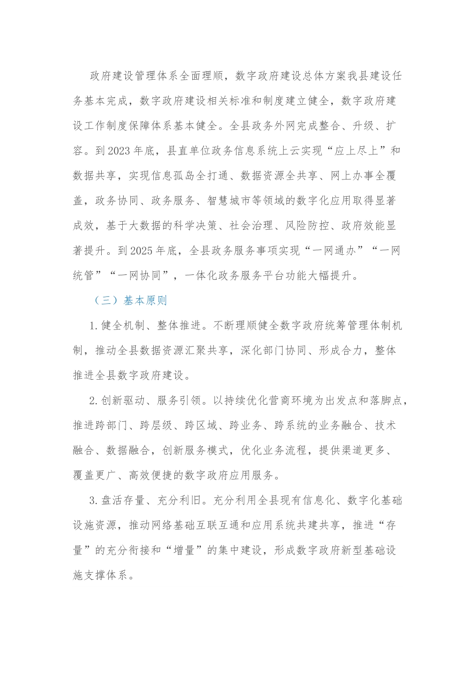 xx县数字政府建设实施方案决策部署,健全理顺我县数字政府建设体制,加快推进我县数字政府建设,根据《xx市数字政府建设实施方案》(x政发〔2022〕x号)精神,结合我县实际,制定本方案。一、总体要求(一)指导思想以习近平新时代中国特色社会主义思想为指导,全面贯彻党的十九大和十九届二中、三中、四中、五中、六中全会精神,以改革的思路和创新的举措,建立大数据驱动的政务数字化服务新模式,大力推进政务数据资源整合和深度开发,促进政务数据共享应用和业务协同流程再造,加快构建纵向贯通、横向协同的数字政府,按照“一张网、一朵云、一网通办、一网统管、一网协同”的总体架构,高标准建设我县数字政府,推进政府治理体系和治理能力现代化,营造更加优越的政务服务营商环境,努力建设人民满意的服务型政府。(二)工作思路和目标依托xx市建设的政务云、大数据共享交换平台、城市大脑等基础底座为支撑,以一体化政务服务平台为主线,以数字化、智能化、智慧化为实施路径,加快全县数据整合、数据治理、数据应用,推动政府全方位、系统性变革,健全数字政府建设管理体系,完善数字政府相关法规和管理办法,建立决策科学、治理精准、服务高效的数字政府运行模式,为我县经济社会高质量发展赋能。到2022年底,数字政府建设管理体系全面理顺,数字政府建设总体方案我县建设任务基本完成,数字政府建设相关标准和制度建立健全,数字政府建设工作制度保障体系基本健全。全县政务外网完成整合、升级、扩容。到2023年底,县直单位政务信息系统上云实现“应上尽上”和数据共享,实现信息孤岛全打通、数据资源全共享、网上办事全覆盖,政务协同、政务服务、智慧城市等领域的数字化应用取得显著成效,基于大数据的科学决策、社会治理、风险防控、政府效能显著提升。到2025年底,全县政务服务事项实现“一网通办”“一网统管”“一网协同”,一体化政务服务平台功能大幅提升。(三)基本原则1.健全机制、整体推进。不断理顺健全数字政府统筹管理体制机制,推动全县数据资源汇聚共享,深化部门协同、形成合力,整体推进全县数字政府建设。2.创新驱动、服务引领。以持续优化营商环境为出发点和落脚点,推进跨部门、跨层级、跨区域、跨业务、跨系统的业务融合、技术融合、数据融合,创新服务模式,优化业务流程,提供渠道更多、覆盖更广、高效便捷的数字政府应用服务。3.盘活存量、充分利旧。充分利用全县现有信息化、数字化基础设施资源,推动网络基础互联互通和应用系统共建共享,推进“存量”的充分衔接和“增量”的集中建设,形成数字政府新型基础设施支撑体系。4.健全体系、安全可靠。坚持安全保障工作与数字政府建设同步规划、同步建设、同步运行,提高基层人员网络安全意识,建立健全数据安全保障规则体系,确保网络、应用和数据安全。(四)实施步骤1.调研摸底。2022年1月下旬完成县乡两级现有信息系统运行状况摸底、3项建设任务调研和资金测算工作。2.编制建设方案。2022年2月中旬,按照“充分利旧”的原则,对标全省统一规划的县级3项建设任务具体要求和总体设计,分别制定数字政府运营指挥中心、管理系统、政务自助终端等3项新建项目具体建设方案。3.统筹推进。2022年2月底,按照市政府要求完成政务外网改造;承接使用升级后的行政服务大厅审批系统、政务服务能力平台、政务服务门户网站、主题库、专题库、政府网站集约化建设、数据共享交换平台、“甘快办”政务服务移动端应用、12345热线。3月底前完成运营中心显示屏、管理软件和政务自助终端机部署。二、工作任务(一)组建统筹有力的组织管理体系1.健全完善数字政府组织保障。按照“统一管理、各负其责、协同高效”的原则,建立“领导小组+工作专班”的数字政府管理体系,领导小组按照“全县一盘棋”工作要求,统筹规划、管理全县数字政府建设,县政府办公室牵头,县电子政务服务中心负责具体工作,抽调精干力量组成工作专班,完善数字政府相关制度和管理办法,全力推进我县数字政府建设,确保数字政府平台2022年3月份建成投运,并与市上互联互通。(责任单位:政府办公室、电子政务服务中心)2.建立县级数字政府运营指...