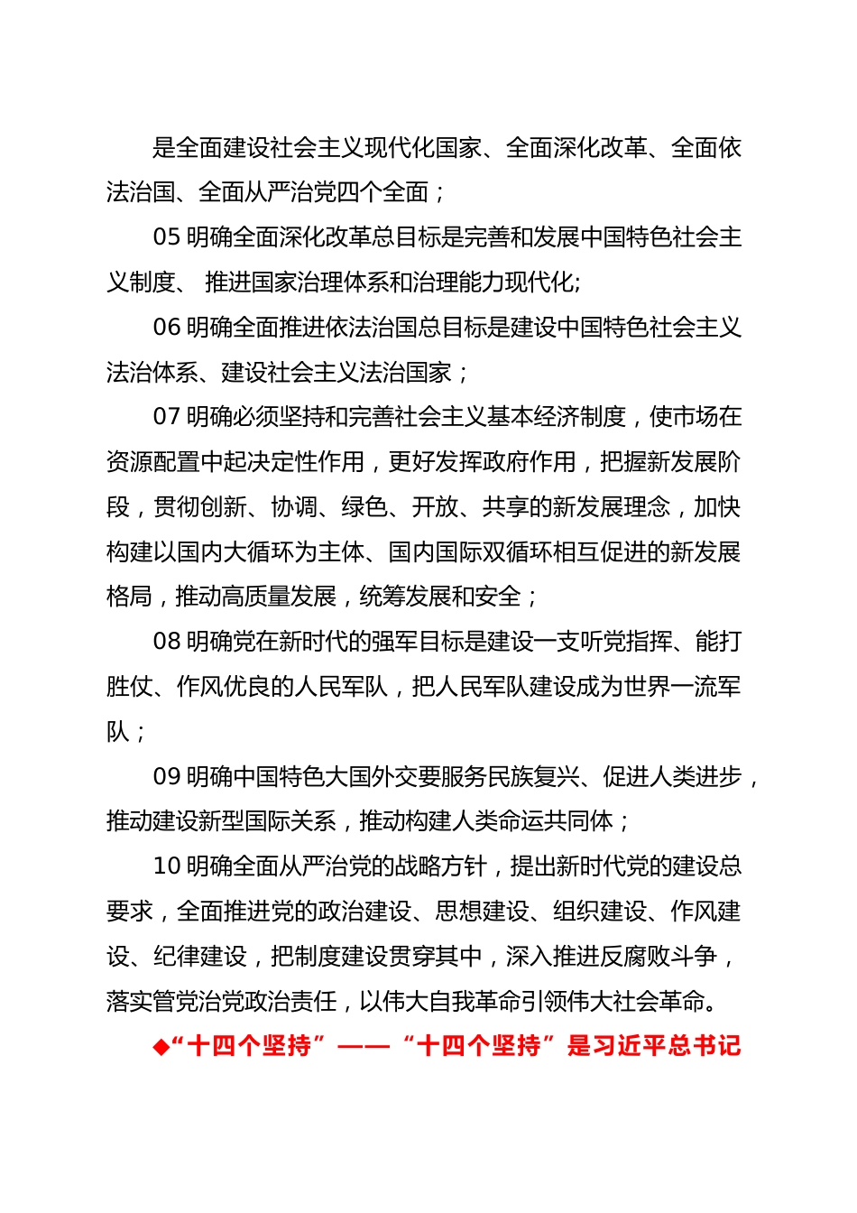 学习贯彻习近平新时代中国特色社会主义思想主题教育应知应会(二)党的二十大报告指出,十九大、十九届六中全会提出的“十个明确”、“十四个坚持”、“十三个方面成就”概括了这一思想的主要内容。◆“十个明确”——党的十九届六中全会通过的《中共中央关于党的百年奋斗重大成就和历史经验的决议》,以“十个明确”对习近平新时代中国特色社会主义思想的核心内容作了进一步的系统概括。01明确中国特色社会主义最本质的特征是中国共产党领导,中国特色社会主义制度的最大优势是中国共产党领导,中国共产党是最高政治领导力量,全党必须增强“四个意识"、坚定“四个自信"、做到“两个维护";02明确坚持和发展中国特色社会主义,总任务是实现社会主义现代化和中华民族伟大复兴,在全面建成小康社会的基础上,分两步走在本世纪中叶建成富强民主文明和谐美丽的社会主义现代化强国,以中国式现代化推进中华民族伟大复兴;03明确新时代我国社会主要矛盾是人民日益增长的美好生活需要和不平衡不充分的发展之间的矛盾,必须坚持以人民为中心的发展思想,发展全过程人民民主,推动人的全面发展,全体人民共同富裕取得更为明显的实质性进展;04明确中国特色社会主义事业总体布局是经济建设、政治建设、文化建设、社会建设、生态文明建设五位一体,战略布局是全面建设社会主义现代化国家、全面深化改革、全面依法治国、全面从严治党四个全面;05明确全面深化改革总目标是完善和发展中国特色社会主义制度、推进国家治理体系和治理能力现代化;06明确全面推进依法治国总目标是建设中国特色社会主义法治体系、建设社会主义法治国家;07明确必须坚持和完善社会主义基本经济制度,使市场在资源配置中起决定性作用,更好发挥政府作用,把握新发展阶段,贯彻创新、协调、绿色、开放、共享的新发展理念,加快构建以国内大循环为主体、国内国际双循环相互促进的新发展格局,推动高质量发展,统筹发展和安全;08明确党在新时代的强军目标是建设一支听党指挥、能打胜仗、作风优良的人民军队,把人民军队建设成为世界一流军队;09明确中国特色大国外交要服务民族复兴、促进人类进步,推动建设新型国际关系,推动构建人类命运共同体;10明确全面从严治党的战略方针,提出新时代党的建设总要求,全面推进党的政治建设、思想建设、组织建设、作风建设、纪律建设,把制度建设贯穿其中,深入推进反腐败斗争,落实管党治党政治责任,以伟大自我革命引领伟大社会革命。◆“十四个坚持”——“十四个坚持”是习近平总书记2017年10月18日,在党的十九大报告中提出的新时代特色社会主义理论,回答了新怎样坚持和发展中国特色社会主义。01坚持党对一切工作的领导;02坚持以人民为中心;03坚持全面深化改革;04坚持新发展理念;05坚持人民当家作主;06坚持全面依法治国;08坚持在发展中保障和改善民生;09坚持人与自然和谐共生;10坚持总体国家安全观;11坚持党对人民军队的绝对领导;12坚持“一国两制”和推进祖国统一;13坚持推动构建人类命运共同体;14坚持全面从严治党。◆“十三个方面成就”——中国共产党第十九届中央委员会第六次全体会议从13个方面深刻总结党的十八大以来党和国家事业取得的历史性成就、发生的历史性变革。01在坚持党的全面领导上:党中央权威和集中统一领导得到有力保证,党的领导制度体系不断完善,党的领导方式更加科学,全党思想上更加统一、政治上更加团结、行动上更加一致,党的政治领导力、思想引领力、群众组织力、社会号召力显著增强。02在全面从严治党上:经过坚决斗争,全面从严治党的政治引领和政治保障作用充分发挥,党的自我净化、自我完善、自我革新、自我提高能力显著增强,管党治党宽松软状况得到根本扭转,反腐败斗争取得压倒性胜利并全面巩固,消除了党、国家、军队内部存在的严重隐患,党在革命性锻造中更加坚强。03在经济建设上:我国经济发展平衡性、协调性、可持续性明显增强,国内生产总值突破百万亿元大关,人均国内生产总值超过一万美元,国家经济实力、科技实力、综合国力跃上新台阶,我国经济迈上更高质量、更有效率、更加公平、更可持续、更为安全的发展之路。04...