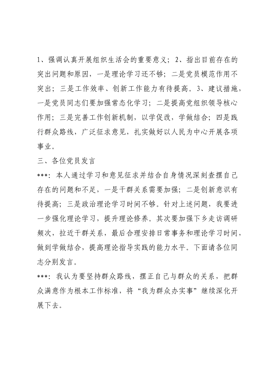 党小组组织生活会会议记录2021年中共**区**镇党委第**党小组组织生活会会议记录时间:202*年**月**日地点:**楼会议室主持人:***参会人员:***缺席人员:***(事假)、***(病假)、***(出差)会议记录:一、组织生活会主题内容1、学习党的十九届六中全会精神、省委十二届十一次全会、市委十四届十二次全会、区第五次党代会精神,深入研讨党的百年奋斗重大成就和历史经验。2、紧扣“四个对照”要求,开展批评与自我批评,深入查摆了自身存在问题,深刻剖析思想根源,明确了整改措施。3、开展民主评议党员测评,相互提出合理化建议和意见,互相监督,共同进步。二、**镇人大主席**通知传达区委组织部精神1、强调认真开展组织生活会的重要意义;2、指出目前存在的突出问题和原因,一是理论学习还不够;二是党员模范作用不突出;三是工作效率、创新工作能力有待提高。3、建议措施,一是党员同志们要加强常态化学习;二是提高党组织领导核心作用;三是完善工作创新机制,以学促改,学做结合;四是践行群众路线,广泛征求意见,扎实做好以人民为中心开展各项事业。三、各位党员发言***:本人通过学习和意见征求并结合自身情况深刻查摆自己存在的问题和不足,一是干群关系需要加强;二是创新意识有待提高;三是政治理论学习时间不够。针对上述问题,我要进一步强化理论学习,提升理论修养。其次要加强下乡走访调研频次,拉近干群关系,最后合理安排日常事务和理论学习时间,做到学做结合,提高理论指导实践的能力水平。下面请各位同志分别发言。***:我认为要坚持群众路线,摆正自己与群众的关系,把群众满意作为根本工作标准,将“我为群众办实事”继续深化开展下去。***:我认为政治理论学习不足的情况有普遍性,我个人学习时间很零散,不仅耽误理论学习也影响业务知识更新,我希望咱们基层党组织在“学习强国”App上多开展一些活动,这样不受时间、空间的影响大家都能参加学习,拓展工作思路,提高干事创业劲头。四、开展民主评议党员工作按照区委组织部《关于召开2021年度基层党组织组织生活会和开展频主评议党员的通知》要求,我街道党委应选优秀党员名额**人。各位同志本着民主公正的原则各自填选。五、分别填报谈心谈话意见表,问题整改清单、个人对照检查材料等