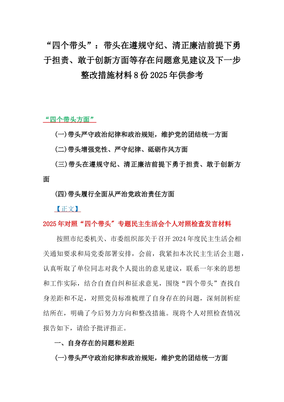 “四个带头”:带头在遵规守纪、清正廉洁前提下勇于担责、敢于创新方面等存在问题意见建议及下一步整改措施材料8份2025年供参考“四个带头方面”(一)带头严守政治纪律和政治规矩,维护党的团结统一方面(二)带头增强党性、严守纪律、砥砺作风方面(三)带头在遵规守纪、清正廉洁前提下勇于担责、敢于创新方面(四)带头履行全面从严治党政治责任方面【正文】2025年对照“四个带头"专题民主生活会个人对照检查发言材料按照市纪委机关、市委组织部关于召开2024年度民主生活会相关通知要求和局党委部署安排,会前,我紧扣本次民主生活会主题,认真听取了单位同志对我个人提出的意见建议,联系一年来的思想和工作实际,结合自查自纠和征求意见,围绕“四个带头”查找自身差距和不足,对照党员标准梳理了自身存在的问题,深刻剖析症结所在,明确了今后努力方向和整改措施。现将个人对照检查情况报告如下,请给予批评指正。一、自身存在的问题和差距(一)带头严守政治纪律和政治规矩,维护党的团结统一方面在严守政治规矩和政治纪律方面,虽然我始终坚持X,但由于对其深刻内涵和实践要求理解不够透彻,导致在具体工作中存在一定的疏漏。尽管能够遵循表面的纪律要求,但在处理一些复杂问题时,缺乏足够的敏感性和细致入微的觉悟。有时会因为日常工作压力较大,过于关注工作的执行和推进,而忽视了细节上的纪律把控。这种不足造成了在某些情况下,党内决策部署的落实不够迅速和到位,影响了党组织的执行力和纪律性。同时,面对一些复杂的政治局面,缺乏足够的政治敏感度和应对策略,未能及时向党组织报告一些潜在的政治风险,导致在思想认识上出现偏差,未能充分发挥学习教育的警示作用。尽管我在理论学习上保持持续关注,但对政治规矩的遵守有时仍显得不够深入和全面,未能完全做到从根本上落实到实际工作中。(二)带头增强党性、严守纪律、砥砺作风方面在增强党性、严守纪律、砥砺作风方面,我始终保持着对党忠诚的政治信念,但有时在自我约束和行为规范上有所欠缺。具体来说,虽然日常生活中能够严格要求自己,但在实际工作中,对纪律和作风的执行力还不够坚决。在面对工作压力和外部挑战时,偶尔会出现执行不到位的现象,尤其是在团结协作、作风建设方面,有时未能及时提醒自己从党性角度审视问题,导致**团队管理中作风建设不够扎实,团队的凝聚力有所削弱。此外,对于学习教育的学习不够系统和深入,尤其是对党性修养的实际运用有时显得不够灵活。尽管自己自觉地参与党性学习,但未能在思想上真正做到深刻反思和自我超越,未能完全通过党性学习教育提升自己处理工作和生活中的复杂问题的能力。(三)带头在遵规守纪、清正廉洁前提下勇于担责、敢于创新方面一是担当精神有所欠缺,面对因难存在畏难情绪。在推进难度大、任务重的改革项目时,有时缺乏攻坚克难的勇气与决心,存在“等靠要”思想。如在推进某项涉及多部门协调的改革任务时,因担心协调难度较大,未能积极主动担当作为,导致改革进度滞后。二是创新意识不够强烈,工作方法较为保守。在解决新问题、新矛盾时,习惯沿用传统的老办法、老思路,缺乏创新精神与探索勇气。以推进智慧城市建设为例,未能充分借助大数据、云计算等现代信息技术手段,致使工作效率与服务水平提升不明显。三是群众观念逐渐淡化,服务群众能力有待提高。在践行党的群众路线方面,有时存在“高高在上”的倾向,未能深入基层、深入群众,切实了解他们的真实需求与诉求。在处理群众反映的某些问题时,存在“拖沓推诿”现象,未能及时有效地解决群众的实际困难。(四)带头履行全面从严治党政治责任方面一是履行“一岗双责”不够到位。始终把抓好党风廉政建设和意识形态工作作为份内职责、应尽职责,但在工作精力投入和落实上还有差距。比如,对分管部门单位的党风廉政建设和意识形态工作强调布置的多,但检查督办不够,与干部谈心谈话少。二是形式主义问题若隐若现。工作中把握内容与形式的关系不够精准,思想上存在惯性思维,重形式、轻内容的问题没有彻底杜绝。比如,基层党建工作材料多、报表多在一定程度上依然存在,“重痕不重绩”等问题仍未彻底解决;向上级...