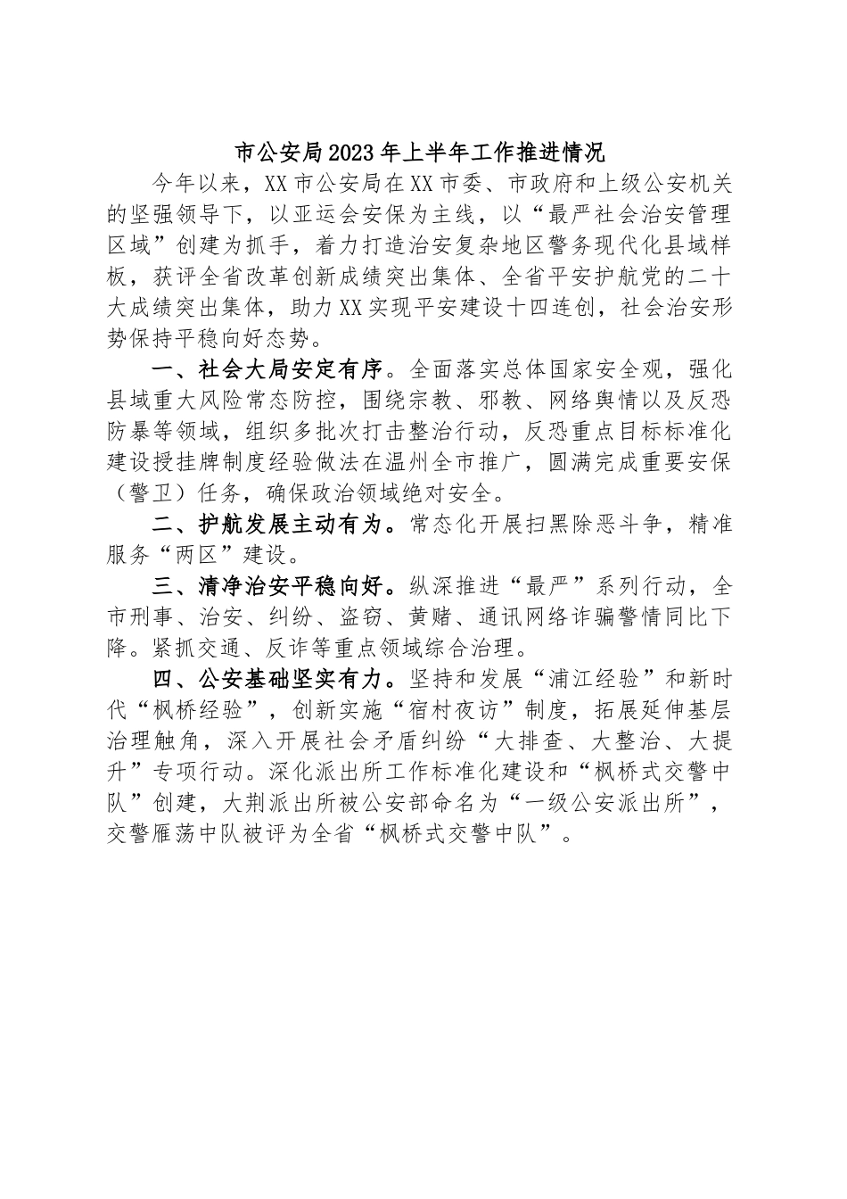 市公安局2023年上半年工作推进情况今年以来,XX市公安局在XX市委、市政府和上级公安机关的坚强领导下,以亚运会安保为主线,以“最严社会治安管理区域”创建为抓手,着力打造治安复杂地区警务现代化县域样板,获评全省改革创新成绩突出集体、全省平安护航党的二十大成绩突出集体,助力XX实现平安建设十四连创,社会治安形势保持平稳向好态势。一、社会大局安定有序。全面落实总体国家安全观,强化县域重大风险常态防控,围绕宗教、邪教、网络舆情以及反恐防暴等领域,组织多批次打击整治行动,反恐重点目标标准化建设授挂牌制度经验做法在温州全市推广,圆满完成重要安保(警卫)任务,确保政治领域绝对安全。二、护航发展主动有为。常态化开展扫黑除恶斗争,精准服务“两区”建设。三、清净治安平稳向好。纵深推进“最严”系列行动,全市刑事、治安、纠纷、盗窃、黄赌、通讯网络诈骗警情同比下降。紧抓交通、反诈等重点领域综合治理。四、公安基础坚实有力。坚持和发展“浦江经验”和新时代“枫桥经验”,创新实施“宿村夜访”制度,拓展延伸基层治理触角,深入开展社会矛盾纠纷“大排查、大整治、大提升”专项行动。深化派出所工作标准化建设和“枫桥式交警中队”创建,大荆派出所被公安部命名为“一级公安派出所”,交警雁荡中队被评为全省“枫桥式交警中队”。五、改革创新稳步提升。全面深化县域“公安大脑”建设,创新投用“乐巡亲访”AI巡处调度应用、县域风险监测中心、“民转刑风险预测”平台等数字化实战应用,迭代升级价格认定“一网办”项目,经验做法得到国家发改委、公安部联合调研组充分肯定,公安部、国家发改委、最高院、最高检起草文件全国推广。六、队伍建设提质增效。深入学习贯彻党的二十大精神,持续开展“三能”主题教育实践活动、“六新六力”主题实践活动,驰而不息发扬“乐音清扬·乐警清和”“五音”警营文化,隆重成立XX市警察协会,与中国人民公安大学警体战训学院签订“校局合作”协议。