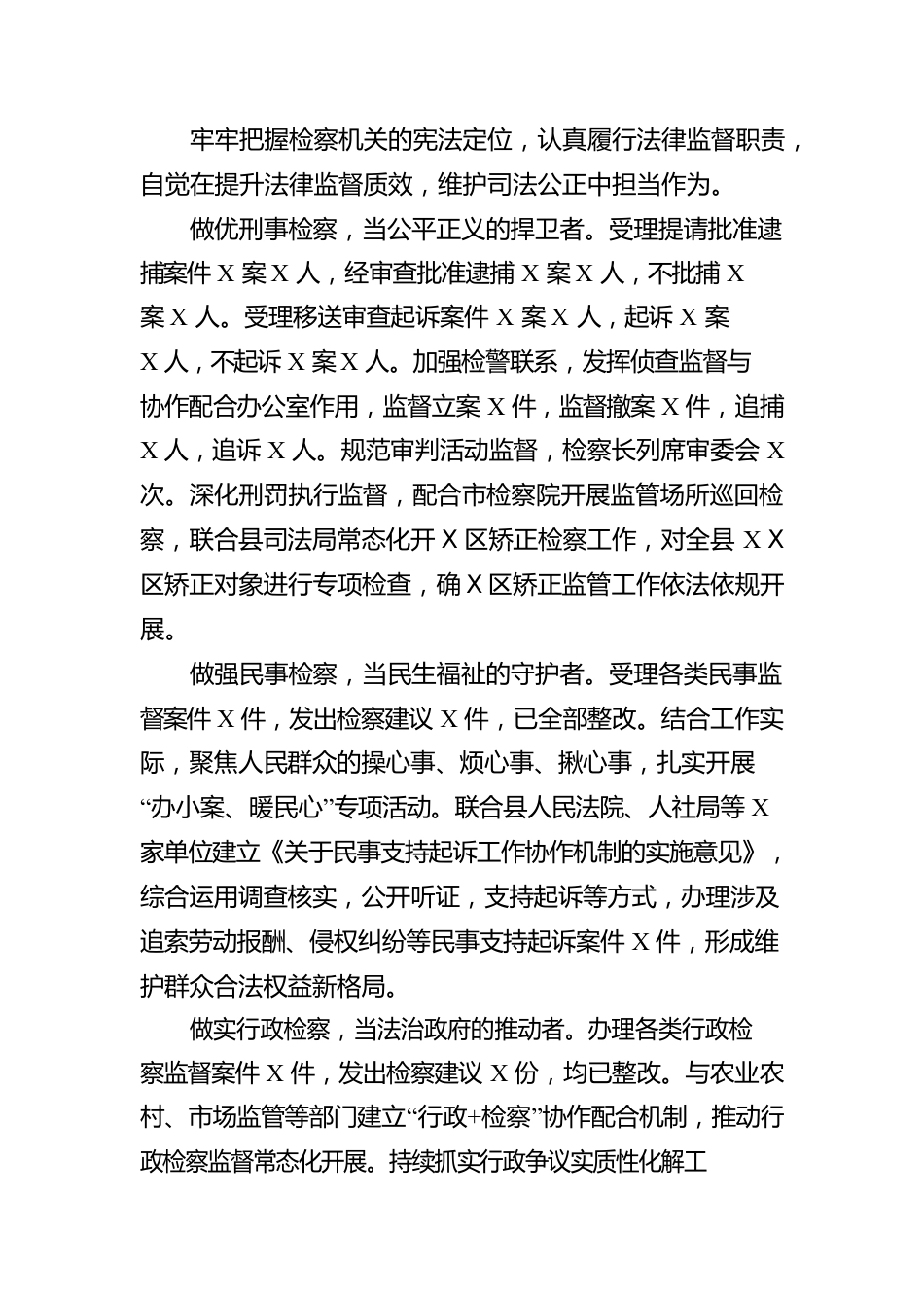 XX县人民检察院工作报告各位代表:现在,我代表县人民检察院向大会报告工作,请予审议,并请其他列席会议的同志提出意见。2022年工作回顾2022年,县人民检察院在县委和上级检察院坚强领导下,在县人大及其常委会的有力监督下,在县政府、县政协及社会各界的关心支持下,坚持以习近平新时代中国特色社会主义思想为指导,笃学践行习近平法治思想,深入学习领会党的二十大精神,认真落实《中共中央关于加强新时代检察机关法律监督工作的意见》,坚决XX县委各项工作部署,全力以赴护大局,多措并举强监督,凝心聚力谋发展,从严从实转作风,各项工作取得新成效、实现新突破。一、把握服务大局主旋律,以优质服务助推长治久安时刻牢记“国之大者”,主动将检察工作融入大局中谋划推进,自觉在护航高质量发展中担当作为。护航社会和谐稳定。常态化推进扫黑除恶斗争,深入宣传《反有组织犯罪法》,积极参与重点行业领域整治,堵塞监管漏洞。严厉打击电信网络诈骗,积极开展打击整治养老诈骗专项行动。办理的曹某某养老诈骗案和李某某等X人非法狩猎案被省检察院作为典型案例刊发。坚持以人民为中心对待群众信访,全力做好“群众来信件件有回复”工作,接待群众来信来访X件次,对首次信访案件落实院领导包案制度,推动矛盾纠纷就地化解。坚持服务发展导向。认真贯彻落实县委《加强新时代检察机关法律监督工作服务保障千阳高质量发展实施措施》,牢固树立“法治是最好的营商环境”基本理念,积极开展“三送一解”联企帮扶活动,加强检企交流,征求意见建议,提供法律咨询服务。XX县应急管理局,邀请职能部门及企业代表召开贯彻落实“八号检察建议”座谈会,加强协作配合、监管排查,守好安全生产防线。强化社会治理效能。积极参与社会治理,落实“少捕慎诉慎押”刑事司法政策和认罪认罚从宽制度,修复社会关系。结合所办非法狩猎、养老诈骗等案件制发社会治理类检察建议12份,做好司法办案“后半篇文章”,促进诉源治理。认真落实普法责任制,依托新时代警民之家平台,深X区、农村开展法治宣传,把法律服务送到群众家门口,促进全民法治观念养成,推进法治千阳建设。积极XX乡村振兴。全院干警认真联系崔XX镇赵家塬村帮扶户,落实各项帮扶措施,进一步巩固脱贫攻坚成果。驻村干警协助抓好村集体矮砧苹果建设管护,支持村集体经♘济做大做强,增加村民收入。积极协商联系,将X名事实无人抚养儿童及时送往某市福利院,保障孩子健康成长。扎实开展农村人居环境综合整治、“百日提升”等专项工作,提升群众满意度。二、深耕法律监督主阵地,以能动履职守护公平正义牢牢把握检察机关的宪法定位,认真履行法律监督职责,自觉在提升法律监督质效,维护司法公正中担当作为。做优刑事检察,当公平正义的捍卫者。受理提请批准逮捕案件X案X人,经审查批准逮捕X案X人,不批捕X案X人。受理移送审查起诉案件X案X人,起诉X案X人,不起诉X案X人。加强检警联系,发挥侦查监督与协作配合办公室作用,监督立案X件,监督撤案X件,追捕X人,追诉X人。规范审判活动监督,检察长列席审委会X次。深化刑罚执行监督,配合市检察院开展监管场所巡回检察,联合县司法局常态化开X区矫正检察工作,对全县XX区矫正对象进行专项检查,确X区矫正监管工作依法依规开展。做强民事检察,当民生福祉的守护者。受理各类民事监督案件X件,发出检察建议X件,已全部整改。结合工作实际,聚焦人民群众的操心事、烦心事、揪心事,扎实开展“办小案、暖民心”专项活动。联合县人民法院、人社局等X家单位建立《关于民事支持起诉工作协作机制的实施意见》,综合运用调查核实,公开听证,支持起诉等方式,办理涉及追索劳动报酬、侵权纠纷等民事支持起诉案件X件,形成维护群众合法权益新格局。做实行政检察,当法治政府的推动者。办理各类行政检察监督案件X件,发出检察建议X份,均已整改。与农业农村、市场监管等部门建立“行政+检察”协作配合机制,推动行政检察监督常态化开展。持续抓实行政争议实质性化解工作,强化协作配合、坚持综合施策、聚焦重点环节,从“程序完结”到“实质化解”转变,办理行政争议化解案件X件,进一步推动矛盾纠纷...