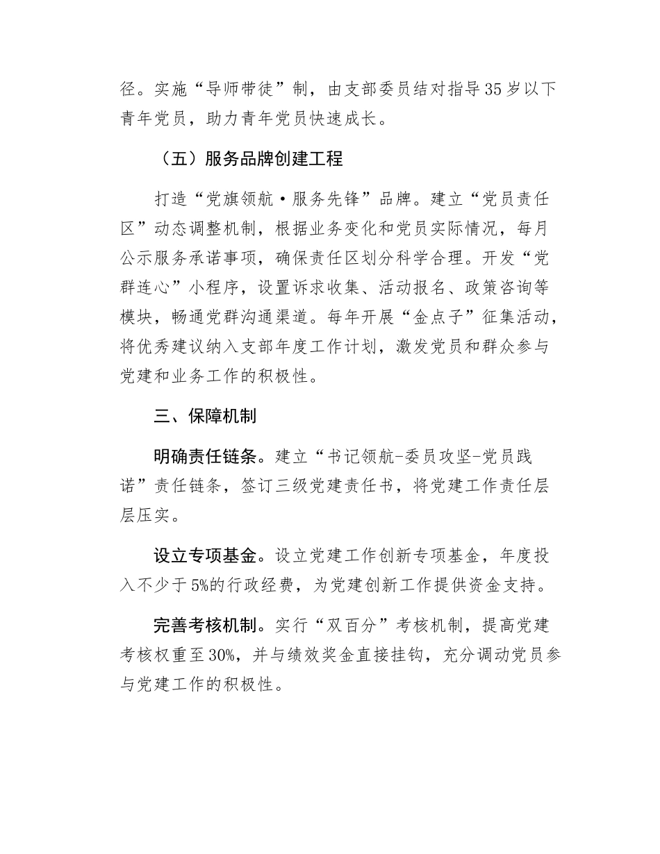2025年度党支部创新党建工作实施方案一、总体要求以习近平新时代中国特色社会主义思想为指引,全面贯彻党的二十大及二十届三中全会精神,深入落实新时代党的建设总要求。紧紧围绕“党建引领业务融合、数字化转型赋能增效”两大关键任务,着力构建“三化四强”基层党建体系,即标准化建设、品牌化运营、数字化管理,实现政治功能强、组织基础强、队伍活力强、服务效能强,为推动单位高质量发展筑牢坚实的政治根基。二、重点任务(一)政治建设铸魂工程实施“红色基因传承计划”。每季度定期开展“书记讲党课”活动,书记结合时政热点与单位实际,深入浅出地讲解党的理论。同时,依托“学习强国”平台,组织“党的二十大精神知识闯关赛”,激发党员学习热情。开发“VR红色教育云展厅”,借助虚拟现实技术,将本地革命遗址生动、直观地数字化呈现,让党员足不出户即可开展沉浸式学习。建立“党员政治生日”电子档案,依据每位党员的学习情况和成长需求,定制个性化学习清单,强化党员的身份意识和责任意识。(二)组织建设强基工程推进“智慧党建平台”建设。搭建“三会一课”线上管理系统,实现会议在线签到、资料便捷共享、学习效果即时测评的全流程数字化管理。开发“党员积分银行”小程序,精心设置理论学习、志愿服务、创新创效等6大类22项积分指标,对党员日常表现进行量化考核。建立“党建大数据看板”,实时监测组织生活参与率、党员学习活跃度等核心指标,为党建工作决策提供数据支撑。(三)作风建设提效工程开展“清风护航”专项行动。实施“廉政家访”季度轮访制,通过家访增进与党员家属的沟通,搭建家庭助廉微信群,营造良好的家庭廉政氛围。开展“微腐败”问题专项整治,设置电子举报信箱,方便职工群众监督举报;引入AI廉政问答机器人,为党员和群众提供便捷的廉政知识咨询服务。创建“党员服务先锋榜”,每月公示“服务标兵”事迹,发挥榜样示范作用。(四)能力素质提升工程实施“党建领航”能力锻造计划。组建“青年党员讲师团”,鼓励青年党员走上讲台,开展“党课开讲啦”系列活动,锻炼青年党员的表达和思考能力。与高校共建“党建创新实验室”,每季度举办“党建+业务”主题沙龙,邀请专家学者、业务骨干共同研讨党建与业务融合发展路径。实施“导师带徒”制,由支部委员结对指导35岁以下青年党员,助力青年党员快速成长。(五)服务品牌创建工程打造“党旗领航·服务先锋”品牌。建立“党员责任区”动态调整机制,根据业务变化和党员实际情况,每月公示服务承诺事项,确保责任区划分科学合理。开发“党群连心”小程序,设置诉求收集、活动报名、政策咨询等模块,畅通党群沟通渠道。每年开展“金点子”征集活动,将优秀建议纳入支部年度工作计划,激发党员和群众参与党建和业务工作的积极性。三、保障机制明确责任链条。建立“书记领航-委员攻坚-党员践诺”责任链条,签订三级党建责任书,将党建工作责任层层压实。设立专项基金。设立党建工作创新专项基金,年度投入不少于5%的行政经费,为党建创新工作提供资金支持。完善考核机制。实行“双百分”考核机制,提高党建考核权重至30%,并与绩效奖金直接挂钩,充分调动党员参与党建工作的积极性。加强经验交流。每季度召开“党建创新案例分享会”,建立优秀案例库和推广机制,促进党建工作经验的交流与推广。四、实施步骤动员部署(3月)。召开动员大会,向全体党员传达创新党建工作的重要意义和目标任务,制定详细的实施细则。推进实施(4-11月)。按照实施细则,按月有序推进重点任务,建立月度例会制度,及时总结经验、解决问题。总结评估(12月)。开展“党建创新项目”评选,对全年党建创新工作进行全面总结,编制年度工作报告,为下一年度党建工作提供参考。通过数字化赋能、品牌化运营、项目化推进的“三化”路径,构建具有本单位特色的党建工作体系。下一步将重点推进智慧党建平台二期建设,力争实现组织生活参与率提升20%、党员创新提案采纳率突破40%的目标,不断推动党建工作迈上新台阶。免责声明:文稿来源网络整理,版权归原作者所有。若侵犯了您的合法权益,请作者持权属证明与本站联系,我们将及时...