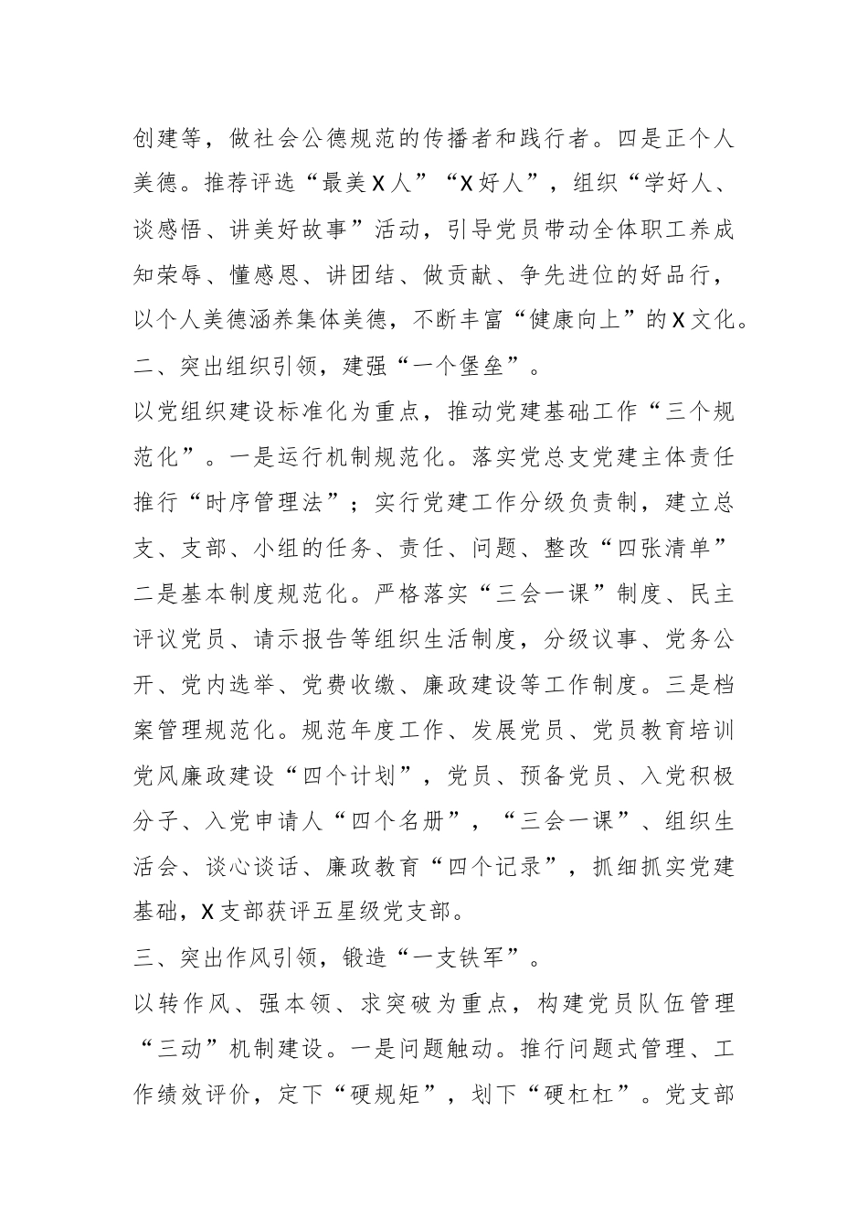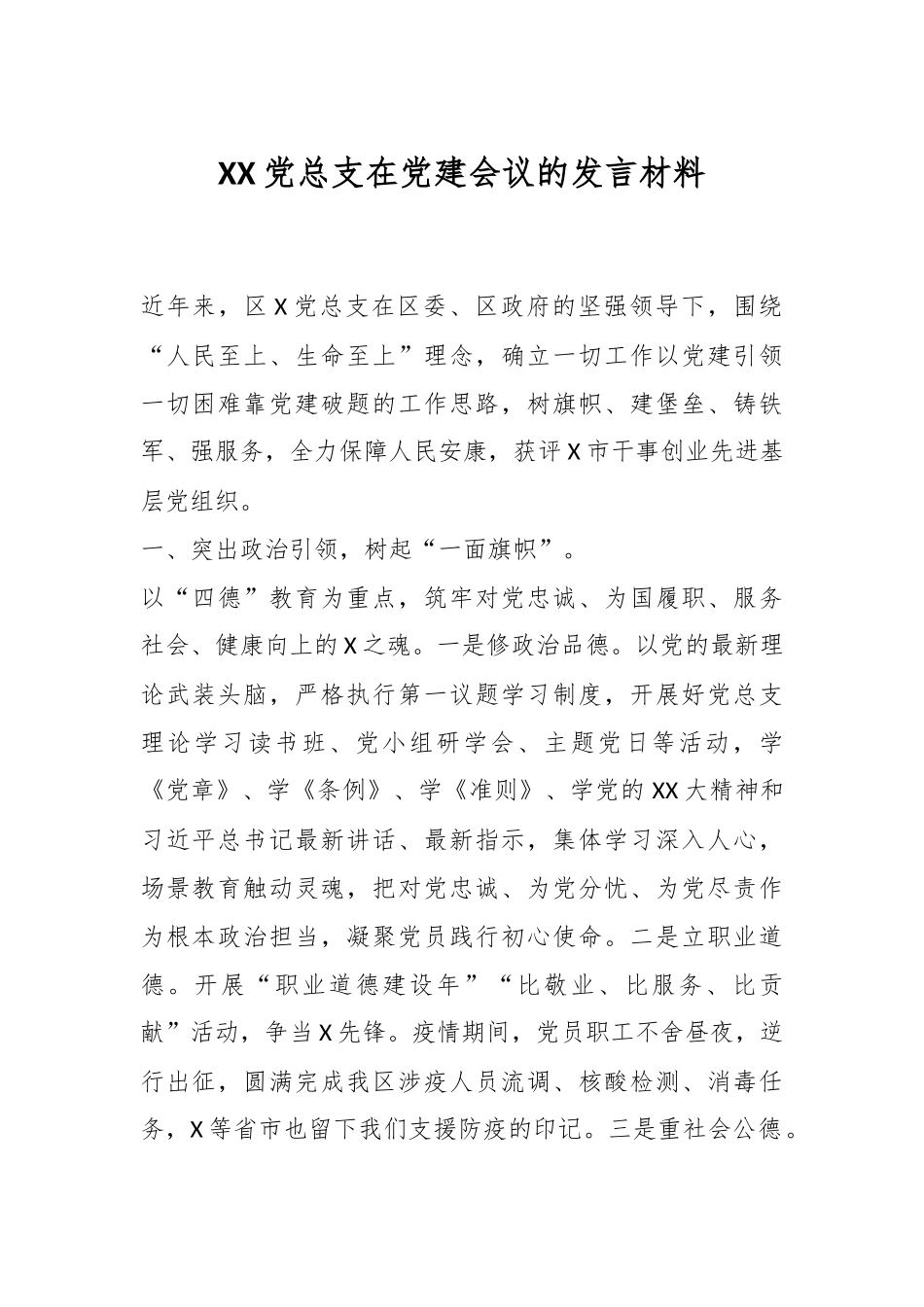 XX党总支在党建会议的发言材料近年来,区X党总支在区委、区政府的坚强领导下,围绕“人民至上、生命至上”理念,确立一切工作以党建引领一切困难靠党建破题的工作思路,树旗帜、建堡垒、铸铁军、强服务,全力保障人民安康,获评X市干事创业先进基层党组织。一、突出政治引领,树起“一面旗帜”。以“四德”教育为重点,筑牢对党忠诚、为国履职、服务社会、健康向上的X之魂。一是修政治品德。以党的最新理论武装头脑,严格执行第一议题学习制度,开展好党总支理论学习读书班、党小组研学会、主题党日等活动,学《党章》、学《条例》、学《准则》、学党的XX大精神和习近平总书记最新讲话、最新指示,集体学习深入人心,场景教育触动灵魂,把对党忠诚、为党分忧、为党尽责作为根本政治担当,凝聚党员践行初心使命。二是立职业道德。开展“职业道德建设年”“比敬业、比服务、比贡献”活动,争当X先锋。疫情期间,党员职工不舍昼夜,逆行出征,圆满完成我区涉疫人员流调、核酸检测、消毒任务,X等省市也留下我们支援防疫的印记。三是重社会公德。以践行社会主义核心价值观为重点,认真组织文明礼仪实践、“扶贫帮困助残”志愿者、道德楷模学习活动,积极参与卫生城市、文明典范城市创建等,做社会公德规范的传播者和践行者。四是正个人美德。推荐评选“最美X人”“X好人”,组织“学好人、谈感悟、讲美好故事”活动,引导党员带动全体职工养成知荣辱、懂感恩、讲团结、做贡献、争先进位的好品行,以个人美德涵养集体美德,不断丰富“健康向上”的X文化。二、突出组织引领,建强“一个堡垒”。以党组织建设标准化为重点,推动党建基础工作“三个规范化”。一是运行机制规范化。落实党总支党建主体责任推行“时序管理法”;实行党建工作分级负责制,建立总支、支部、小组的任务、责任、问题、整改“四张清单”二是基本制度规范化。严格落实“三会一课”制度、民主评议党员、请示报告等组织生活制度,分级议事、党务公开、党内选举、党费收缴、廉政建设等工作制度。三是档案管理规范化。规范年度工作、发展党员、党员教育培训党风廉政建设“四个计划”,党员、预备党员、入党积极分子、入党申请人“四个名册”,“三会一课”、组织生活会、谈心谈话、廉政教育“四个记录”,抓细抓实党建基础,X支部获评五星级党支部。三、突出作风引领,锻造“一支铁军”。以转作风、强本领、求突破为重点,构建党员队伍管理“三动”机制建设。一是问题触动。推行问题式管理、工作绩效评价,定下“硬规矩”,划下“硬杠杠”。党支部建立党员问题清单X余条,实行问题整改销号,推进党员队伍素质不断提升,作风不断改进。二是示范带动。设立“党员示范岗”,开展党员“三亮”“对标创优”活动,即:党员亮身份、亮职责、亮承诺,争当优秀党员,争创优秀党小组引领职工学先进、学典型。三是督查推动。坚持定期与随机督查、抽样与全面督查、专项与重点督查“三个结合”正风纠偏、对标创优,做到以党务领业务、强服务。“三动”机制建设成效明显。业务水平明显提升,“读书周”业务技能“半月谈”、“青蓝工程”等成长平台成功搭建X人次人在区级以上业务竞赛中获奖。服务能力不断增强,有序推进X与中医药融合发展,打造具有X特色的中医药疾病防控服务圈;走千家、访万民、送“三高共管六病同防”健康处方X多张,开展常规传染病监测X余人次,建成X。建成突发公共卫生事件应急处置指挥X,建立联合办公制度,形成了人员管理、业务培训、后勤保障、信息联动等一体化运作机制,做到一旦临战,快速、有效处置突发公共卫生事件,全力保障人民安康。今后,我们将认真落实本次会议要求,进一步擦亮“健康卫士、X先锋”党建品牌,丰富“厚德笃行、精业佑民”党建内涵,以党建高质量发展推动X“二次创业”,全面提升疾病预防控制、公共卫生服务水平,为全面开创新时代现代化强区建设新局面提供坚强健康保障!