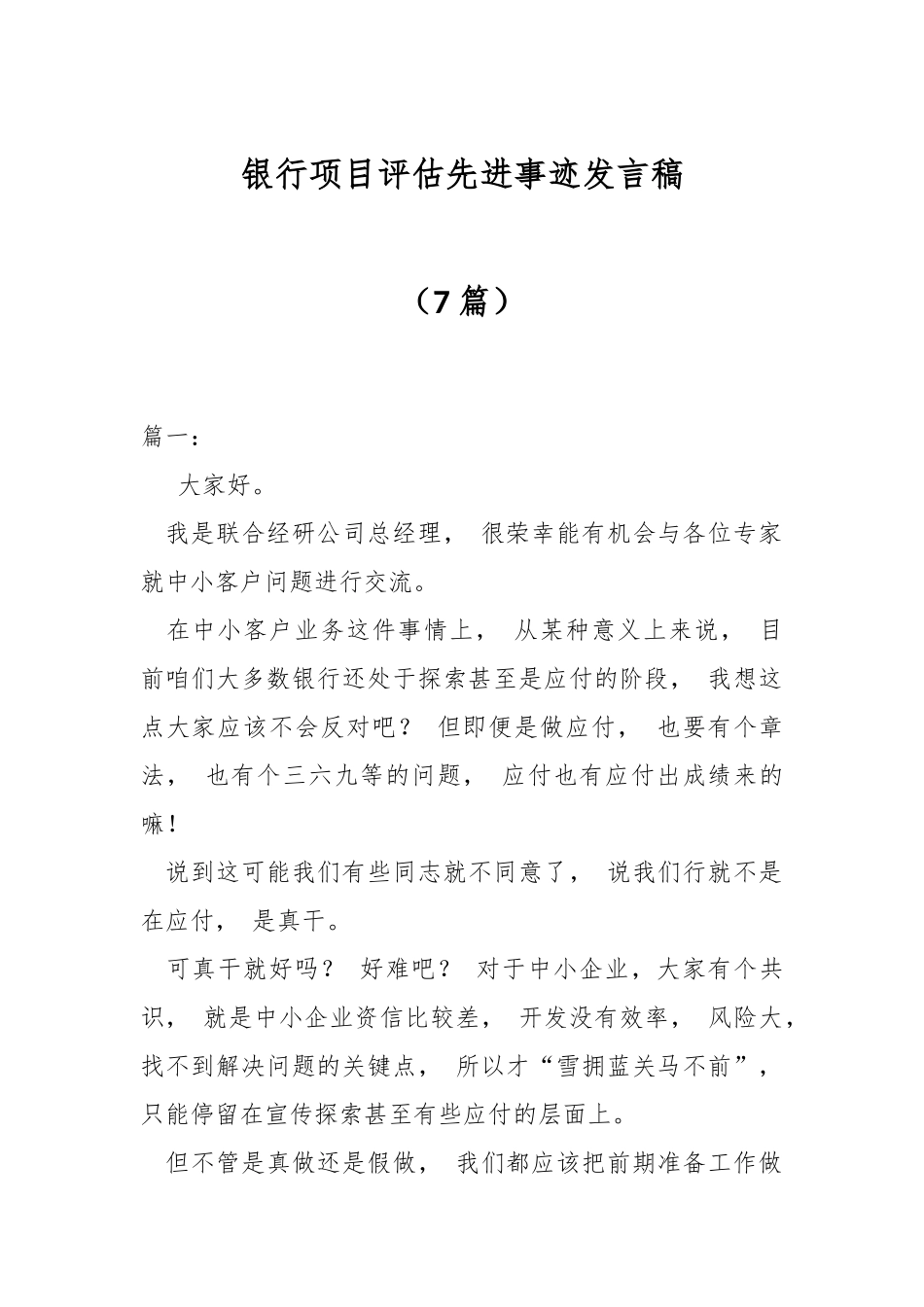 银行项目评估先进事迹发言稿(7篇)篇一:大家好。我是联合经研公司总经理,很荣幸能有机会与各位专家就中小客户问题进行交流。在中小客户业务这件事情上,从某种意义上来说,目前咱们大多数银行还处于探索甚至是应付的阶段,我想这点大家应该不会反对吧?但即便是做应付,也要有个章法,也有个三六九等的问题,应付也有应付出成绩来的嘛!说到这可能我们有些同志就不同意了,说我们行就不是在应付,是真干。可真干就好吗?好难吧?对于中小企业,大家有个共识,就是中小企业资信比较差,开发没有效率,风险大,找不到解决问题的关键点,所以才“雪拥蓝关马不前”,只能停留在宣传探索甚至有些应付的层面上。但不管是真做还是假做,我们都应该把前期准备工作做好。有些什么工作呢?下面我展开来说一下。首先来说数据,咱们各家行可能都有一些数据,但是数据比较分散、比较孤立,这应该是申报的时候留下来的吧?另外,各行通过各种渠道也都搜集了一些数据。但做市场分析的话这些数据够用吗?至少是不好用吧?那什么数据有用呢?目前来说,至少应该想办法找一套完整、系统的数据吧?有了数据就开始做分析了,大家都很熟悉的分析方法,主要是利用资产、销售收入、利润、负债这些指标来进行排名。但是用这种评先进的方法做贷款行不行呢?后来各家行都做了一些改进,我们也参与了其中的部分工作,主要是做财务数据分析,四个能力、12个指标,这么做有一定启发,但这种方法一是涉及到数据可不可靠的问题,二是即便数据可靠了也没有用,因为企业太小了,根本没有能力做抵押担保,解决不了信用缺失的问题。那怎么突破这个瓶颈呢?其实大家是做了很多有意尝试的。最初贵州工行就提出了从一般的行业分析、企业分析转变到业务突破口的选择和分析上。广东建行在这个事情上是比较善于思考的。隐型冠军法和产业集群的计算方法就是他们提出来的。深圳民生提的是类银行文件报告,就是要特别增加金融需求分析和金融服务方案。杭州商行提出过在行业细分的基础上,再在区域和规模层面进行二次细分。上海民生提出过从优势行业的上下游,也就是有业务关系的中小企业进行业务突破。北京民生则从资本关联入手进行中小企业客户选择。今天有咱们北京工行的同志在,北京工行提出过根据企业的成立年限和企业的资本性质来选择企业。这些努力都是好的。把大家的发现和探索做个归纳,可以发现有个共同点,就是大家的努力都指向行业选择,就是力图在不识别、不改变企业单体信用状况的情况下,主要借助行业运行本身的能量和行业龙头的力量来减轻风险识别难、风险控制难、风险解决难和开发不经济等问题造成的压力,使效率和成本双赢。成功的关键在于批量开发,这样才能收到规模经济、利润覆盖风险的效果。(在这个过程中间,我们注意到银行都在探索减少审批环节,这是有一定合理成分的,但在企业数量很少的情况下,单纯减少审批环节,风险就会显得比较大)当然长期来说,像风控机制啊、担保机制、社会诚信文化建设啊什么的肯定也是需要的,但短期来说,最主要的还是刚才咱们说的这些。行业选择完了之后,作为银行,要对选择的行业进行投贷,获取利息收入。所以我们要从这个角度对行业进行银行专有分析。比如说,是不是应该分析一下各个行业的利息收入情况怎么样呢?推而广之像贷款投放量、手续费收入、应收账款等情况是不是也应该分析出来呢?从这个角度来把握行业是不是和银行关系更近?至少来说也是不可或缺吧?每个行业都是多种指标共存,比例不同形成类型,针对不同类型就应该是不同的行业有不同的属性,不同属性的行业要搭配不同的产品和模式,我们姑且把他命名为业务集合的概念。在知道了各个行业的利息收入、手续费收入之后,接下来,咱们有没有考虑过是从对公业务入手还是从国际业务入手?怎么区分业务的主从关系和搭配关系?这些问题都应该好好研究。外部分析完了以后,就要结合行里的实际做计划。有了刚才说的这么几条,做计划应该有点意思了吧?以前的计划是怎么结合的呢?是用排版解决的,一是外部环境,二是内部情况,中间基本上没什么关系,写起来很难写。如果像现在这么做的话,你知道北京市各个行业...
