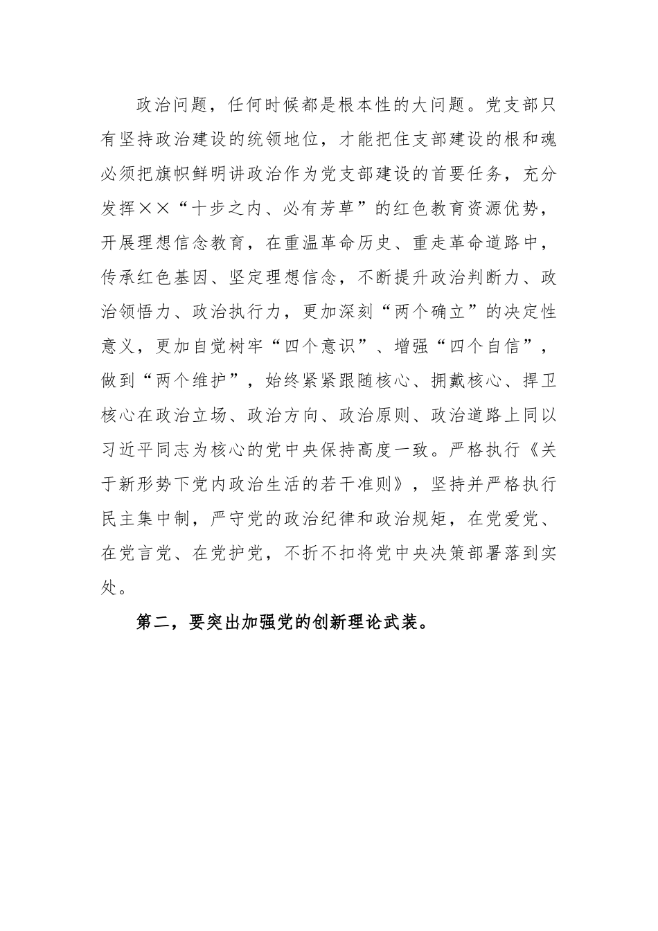 在支部书记党课讲稿:全面增强基层党组织政治功能和组织力着力打造服务大局、攻坚克难的战斗堡垒同志们:党支部是党的基础组织,是党组织开展工作的基本单元。党的XX大报告强调,要着力增强党组织政治功能和组织功能,把基层党组织建设成为有效实现党的领导的坚强战斗堡垒。我们要认真学习贯彻党的XX大精神,深入推进新时代党的建设新的伟大工程,牢牢抓住党支部这个基本点,全面推进支部的政治建设、思想建设、作风建设、纪律建设,更加有效发挥党支部在凝心聚力、推动发展、服务群众的战斗堡垒作用,为推进党和事业发展提供坚强的政治保障和组织保障。下面,我以《全面增强基层党组织政治功能和组织力着力打造服务大局、攻坚克难的战斗堡垒》为题,给大家作党课报告,不当之处,请同志们批评指正。第一,要坚持把政治建设摆在首位。政治问题,任何时候都是根本性的大问题。党支部只有坚持政治建设的统领地位,才能把住支部建设的根和魂必须把旗帜鲜明讲政治作为党支部建设的首要任务,充分发挥×ד十步之内、必有芳草”的红色教育资源优势,开展理想信念教育,在重温革命历史、重走革命道路中,传承红色基因、坚定理想信念,不断提升政治判断力、政治领悟力、政治执行力,更加深刻“两个确立”的决定性意义,更加自觉树牢“四个意识”、增强“四个自信”,做到“两个维护”,始终紧紧跟随核心、拥戴核心、捍卫核心在政治立场、政治方向、政治原则、政治道路上同以习近平同志为核心的党中央保持高度一致。严格执行《关于新形势下党内政治生活的若干准则》,坚持并严格执行民主集中制,严守党的政治纪律和政治规矩,在党爱党、在党言党、在党护党,不折不扣将党中央决策部署落到实处。第二,要突出加强党的创新理论武装。坚持用马克思主义中国化时代化最新成果武装全党、指导实践、推动工作,是我们党创造历史、成就辉煌的一条重要经验。必须坚持理论建党、思想建党,以深入开展学习贯彻习近平新时代中国特色社会主义思想主题教育为契机,落实“学思想、强党性、重实践、建新功”的总要求与“以学铸魂、以学增智、以学正风、以学促干”的目标任务,以“第一议题”学习制度、“三会一课”制度、“一课一片一实践”活动等为载体,建立支部常态化理论学习机制,持续深入学习习近平新时代中国特色社会主义思想,突出学习党的XX大精神、习近平总书记关于××工作的重要讲话和指示批示精神,及时跟进学习习近平总书记系列重要讲话和指示批示精神,全面系统掌握党的创新理论所蕴含的世界观、方法论,坚持好、运用好贯穿其中的立场观点方法,做中国特色社会主义最坚定的支持者和最忠实的践行者。第三,要全面提升党内政治生活的质量。党内政治生活是党员干部党员干部成长的有力保障,能够使党员干部能够经常接受政治体检、打造政治灰尘、净化政治灵魂。增强党支部政治功能,必须充分发挥党内政治生活在教育引导党员干部中的重要作用,从“三会一课”、组织生活会、谈心谈话、民主评议党员等基本的党内组织生活抓起,持续推进党支部“五化”建设,打造“四强”党支部,确保党的组织生活各项制度要求落到实处,增强党内政治生活的政治性、时代性、原则性、战斗性,让党员干部在党内政治生活中经常接受政治体检,增强政治免疫力。在落实“规定动作”的同时,进一步丰富“自选动作”,创新开展主题党日活动、过政治生日、普通党员讲党课、党员活动日等活动,促进党支部政治文化建设,让党的理想信念、价值观念、优良传统内化于心、外化于行,引导党员干部更加自觉投入党和国家事业当中营造团结奋进、笃行实干、奋勇争先的氛围浓厚。第四,要突出干部队伍素质能力建设。当前,世界之变、时代之变、历史之变正以前所未有的方式展开,前进路上必然会遇到大量从未出现过的全新课题、遭遇各种艰难险阻。唯有不断提高履职能力与水平提升应对重大挑战、抵御重大风险、克服重大阻力、化解重大矛盾、解决重大问题的能力,才能适应新时代工作的需要。党支部是每名党员干部学习历练的大熔炉、大平台要切实发挥起提升干部履职能力、激励干部担当作为的重要作用。要搭建学习平台、创新学习方式,紧跟互联网...