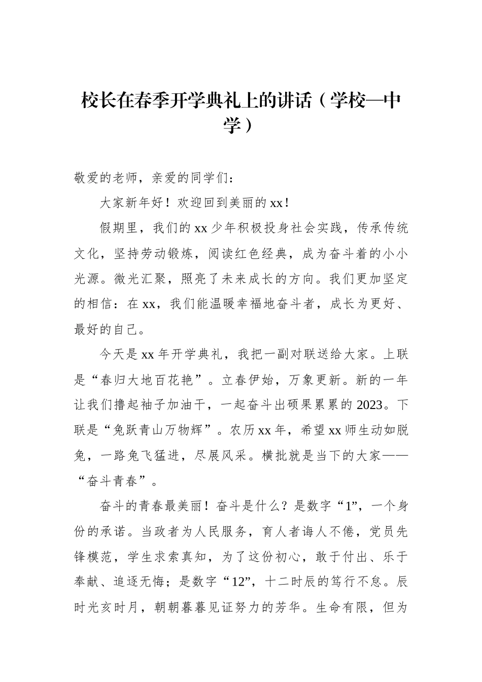 校长在春季开学典礼上的讲话材料汇编(14篇)(学校—中学、小学)目录1.校长在春季开学典礼上的讲话(学校—中学).........22.校长在春季开学典礼上的讲话(学校—中学).......53.校长在春季开学典礼上的讲话(学校—中学).......84.校长在春季开学典礼上的讲话(学校—中学).....145.党委书记在春季开学典礼上的讲话(学校—中学).............................................................................176.副校长在春季开学典礼上的讲话(学校—中学).227.校长在春季开学典礼上的讲话(学校—中学).....278.校长在春季开学典礼上的讲话(学校—中学).....319.校长在春季开学典礼上的讲话(学校—中学).....3410.副校长在春季开学典礼上的讲话(学校—小学)3811.校长在春季开学典礼上的讲话(学校—小学)...4212.校长在春季开学典礼上的讲话(学校—中学)...4513.校长在春季开学典礼上的讲话(学校—中学)...5514.党委书记在春季开学典礼上的讲话(高校)......59校长在春季开学典礼上的讲话(学校—中学)敬爱的老师,亲爱的同学们:大家新年好!欢迎回到美丽的xx!假期里,我们的xx少年积极投身社会实践,传承传统文化,坚持劳动锻炼,阅读红色经典,成为奋斗着的小小光源。微光汇聚,照亮了未来成长的方向。我们更加坚定的相信:在xx,我们能温暖幸福地奋斗者,成长为更好、最好的自己。今天是xx年开学典礼,我把一副对联送给大家。上联是“春归大地百花艳”。立春伊始,万象更新。新的一年让我们撸起袖子加油干,一起奋斗出硕果累累的2023。下联是“兔跃青山万物辉”。农历xx年,希望xx师生动如脱兔,一路兔飞猛进,尽展风采。横批就是当下的大家——“奋斗青春”。奋斗的青春最美丽!奋斗是什么?是数字“1”,一个身份的承诺。当政者为人民服务,育人者诲人不倦,党员先锋模范,学生求索真知,为了这份初心,敢于付出、乐于奉献、追逐无悔;是数字“12”,十二时辰的笃行不怠。辰时光亥时月,朝朝暮暮见证努力的芳华。生命有限,但为了一个信念奋斗的岁月会成为记忆中的恒久之光;是数字“100”,百折不挠的坚韧。以百分之一百的勇气与热爱从坎坷困顿中奋起,在荆棘丛生中破局。奋斗不是一声令下,不是口号响亮,而是眼中有光、心中有热、脚步有力,是日日充实、月月夯实、年年务实,是理想坚定,无惧苦难顽强拼搏。奋斗的青春自带光与热,因为——奋斗有目标,青春向着光。目标这束光,是学海泛舟的灯塔,劈波斩浪也要踏浪而来;是勇攀高峰的旗帜,“因为山在那里,所以我要攀登”。目标如光如炬,为畏葸者点灯,为灰心者抱薪。一曲《满江红》,让小人物张大时隔四年仍不忘鹏举将军“待从头,收拾旧山河,朝天阙”的精忠报国。盛满沉甸甸中考梦的六月,是八年级和九年级同学的目标月,是通向未来的荣光六月。心有远方便能步履坚定,便能以勇毅玉汝于成,以奋斗破釜沉舟。我要祝福你们,亲爱的孩子们,希望你们用奋斗的青春,致敬每一个起舞的日子;希望你们用青春的奋斗,致敬每一个向光而行的日子。奋斗有落实,青春脚步稳。“苟日新,日日新,又日新”,世界的日新月异从未如此参差真实。东航客机未能返航,梨泰院巷道凝固,世界杯狂欢拉满,全球第80亿个婴儿呱呱新生。惶恐万变中唯有向内而生方能稳中求胜。中共二十大筹划未来,国家以强有力的姿态提速现代化进程,而进程中的我们唯有步履坚定,以务实的奋斗方能于变局中不惑、不惧、不忧。大道至简,实干为要作为奋斗中的学生,我们要把每一个知识点落实在课堂的分秒,不驰于空想;要把每一次思维的生长夯实于实践的思考,不骛于虚声。如果奋斗有模样,那一定是身着校服与工装的你和我,一定是课堂上思想对话的你和我,一定是实践活动中热情投入的你和我。奋斗有时,我们用脚步丈量青春的宽度;奋斗有实,我们用焚膏继晷爆发立根破原的力量。奋斗有能量,青春勇热爱。人是世界的量器,一个个勇敢热爱的个体才组成丰富多元的世界,极微即无穷。勇敢者开拓创新,所以中国航天能一次次上九天揽月,深海蛟龙能一回回下五洋捉鳖,这是大国工匠的拓取精神。热爱者无惧艰难,中国乒乓可以绝地反击,中...