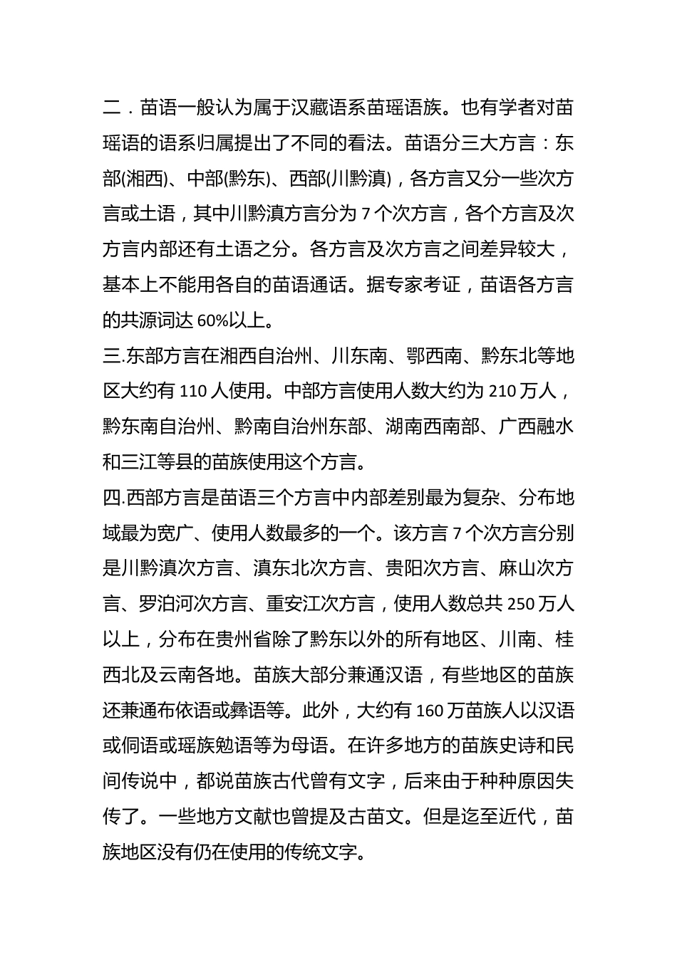 少数民族语言发展情况的调查(5篇)第一篇:--以湖南省湘西土家族苗族自治州的苗族为例摘要:我国是一个拥有多民族和多语言的综合型大国,目前,我国少数民族约有6000万人使用本民族语言,占少数民族总人口的60%以上,约有3000万人使用本民族语言。基于这样的现状,研究少数民族的语言发展情况就显得十分重要。今以少数民族地区苗族语言使用情况为视角,剖析当今新生一代苗族选择使用本民族语言的情况,和苗语的发展情况,分析苗族语言传承所面临的困境与挑战。并且提出了一些解决办法和措施。关键字:苗族苗语传承发展苗语简介:一.苗语是苗族人语言的统称,属于苗瑶语族的苗语支,分布在中国的湖南、四川、贵州、云南等地;以及越南、老挝、泰国、美国等国。苗语大致可以分为以下三个主要分支:湘西方言、黔东方言和川黔滇方言,当中以川黔滇方言最为复杂,可以分成19种不同的方言。二.苗语一般认为属于汉藏语系苗瑶语族。也有学者对苗瑶语的语系归属提出了不同的看法。苗语分三大方言:东部(湘西)、中部(黔东)、西部(川黔滇),各方言又分一些次方言或土语,其中川黔滇方言分为7个次方言,各个方言及次方言内部还有土语之分。各方言及次方言之间差异较大,基本上不能用各自的苗语通话。据专家考证,苗语各方言的共源词达60%以上。三.东部方言在湘西自治州、川东南、鄂西南、黔东北等地区大约有110人使用。中部方言使用人数大约为210万人,黔东南自治州、黔南自治州东部、湖南西南部、广西融水和三江等县的苗族使用这个方言。四.西部方言是苗语三个方言中内部差别最为复杂、分布地域最为宽广、使用人数最多的一个。该方言7个次方言分别是川黔滇次方言、滇东北次方言、贵阳次方言、麻山次方言、罗泊河次方言、重安江次方言,使用人数总共250万人以上,分布在贵州省除了黔东以外的所有地区、川南、桂西北及云南各地。苗族大部分兼通汉语,有些地区的苗族还兼通布依语或彝语等。此外,大约有160万苗族人以汉语或侗语或瑶族勉语等为母语。在许多地方的苗族史诗和民间传说中,都说苗族古代曾有文字,后来由于种种原因失传了。一些地方文献也曾提及古苗文。但是迄至近代,苗族地区没有仍在使用的传统文字。【作者简介】:向桂珍财务管理一班指导老师龚志祥湘西苗族的苗语现状:(一)在20世纪90年代中期以后,苗文在学校教育中急剧萎缩,苗、汉双语教学班越来越少,苗文扫盲基本停止。湘西当地的苗族主要使用苗语和汉语。使用苗语的频率,主要看他们交谈的对象和场合。大体上,如果交谈对象会苗语就使用苗语,如果在民族村内更多地使用苗语。在外界社会交往中,由于会苗语的交谈对象一般较少,所以使用苗语较少,几乎不使用苗语。现在村内的社交中也一般性地使用汉语。苗语教育更是糟糕,大多数苗族人都被汉族的人汉化了,现在说苗语的年轻人也越来越少。(二)不同群体使用苗语的情况不同。一是长期呆在家里的中、老年村民,他们能够流利的使用苗语交谈。这类人占苗族的65%左右;二是经常在外的村民(读书、打工等),这部分人多半都是中青年人,能听懂苗语,因为经常在外只有回家的时候才偶尔说苗语,用苗语交流不太熟练,这类人占苗族20%;三是年龄在10岁以下以及在外面长大的村民,既不能说、也听不懂苗语,这类人占苗族的10%;四是通过婚嫁从外地迁居的村民,能听懂苗语并能说苗语的人群,占5%。湘西苗家人的风采调查过程(一)基于苗族语言的发展的一些问题,笔者进行了一些调查。主要是上网了解资料和去当地实地考察,采访了一些村里有威望的长者。之后,在同学的带领下去拜访了一些具有代表性的苗家人,并向他们了解村里的苗语使用情况。最后还依据不同年龄层次的苗家人进行了问卷调查。(二)通过调查后笔者得出了一些结论:一、苗语的发展正面临语言危机,能熟练说苗语的只是一些老一辈的人,中年人仅仅能听懂。而新一代的苗族人基本听不懂更不会用苗语交流。二、苗语的传承人越来越少,尤其是在与汉语的融合过程中,逐渐被汉化。三、政府未采取措施来挽救濒临灭绝的苗语。四、随着经济的发展,人们更多的是追求更高质量的生活而忽视了苗语。五、大多数苗家人没有意识到传...