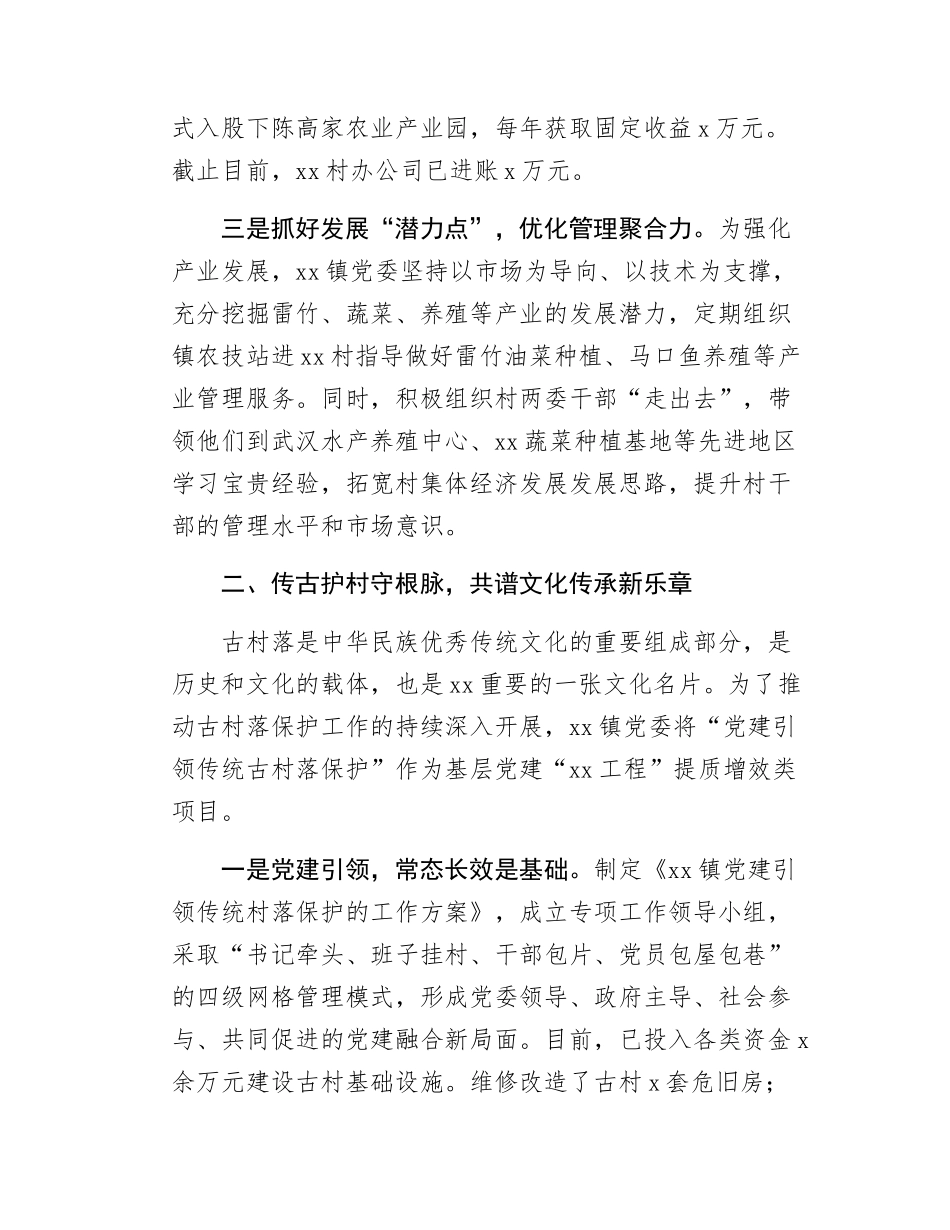 xx镇x年抓党建促乡村振兴实施情况报告根据工作安排,现就本单位x年抓党建促乡村振兴情况报告如下。一、攻薄促弱兴产业,共筑乡村振兴新篇章今年以来,xx镇党委抓好谋划部署,以“党建引领村集体经济发展”作为基层党建“xx工程”攻薄促弱类项目,全力提升集体经济薄弱村xx村的发展水平。一是选优配强“领头羊”,集体经济拓思路。紧紧围绕“抓党建、兴产业、促发展”的工作思路,把党建引领作为推动乡村振兴的“红色引擎”,开展乡村干部培训,拓宽致富思路、提升能力素养,持续选优配强村党组织带头人队伍。同时从优秀退伍军人、大学毕业生、致富带头人中遴选培养村级后备力量x名,为村党组织带头人队伍注入了新的活力和动力。二是聚焦举措“下功夫”,盘活资源强造血。通过流转xx村内自有林地x亩用于发展雷竹、苗木种植等产业,同时采用飞地的形式在中洲村流转土地x亩与雷竹种植能手签订合作协议,以土地入股的形式参与分红。此外,积极申请中央扶持资金x万元,以投资xx油面厂房建设的方式入股下陈高家农业产业园,每年获取固定收益x万元。截止目前,xx村办公司已进账x万元。三是抓好发展“潜力点”,优化管理聚合力。为强化产业发展,xx镇党委坚持以市场为导向、以技术为支撑,充分挖掘雷竹、蔬菜、养殖等产业的发展潜力,定期组织镇农技站进xx村指导做好雷竹油菜种植、马口鱼养殖等产业管理服务。同时,积极组织村两委干部“走出去”,带领他们到武汉水产养殖中心、xx蔬菜种植基地等先进地区学习宝贵经验,拓宽村集体经济发展发展思路,提升村干部的管理水平和市场意识。二、传古护村守根脉,共谱文化传承新乐章古村落是中华民族优秀传统文化的重要组成部分,是历史和文化的载体,也是xx重要的一张文化名片。为了推动古村落保护工作的持续深入开展,xx镇党委将“党建引领传统古村落保护”作为基层党建“xx工程”提质增效类项目。一是党建引领,常态长效是基础。制定《xx镇党建引领传统村落保护的工作方案》,成立专项工作领导小组,采取“书记牵头、班子挂村、干部包片、党员包屋包巷”的四级网格管理模式,形成党委领导、政府主导、社会参与、共同促进的党建融合新局面。目前,已投入各类资金x余万元建设古村基础设施。维修改造了古村x套危旧房;提升了书铺街外围循环公路;改造提升了老街和小巷路面;铺设了村内污水、雨水管网;整治了蜘蛛网,将强、弱电线路铺设下地;修建了游客接待中心、金临桥,停车场等。通过多方位提升打造,古村面貌悄然变化,环境更美,设施更优、人气更旺。二是确权亮证,包保到人是关键。对xx境内的传统古村古建进行全面摸底,明确房屋权属,梳理完善“一屋一档”,补全了古村古建的“身份证”;组织老党员、老干部等力量成立“古村保卫队”,建立党员包干古建筑x栋,党员志愿者巡逻队使用古村卫士开展古村巡查x人次,发现并处理漏雨、白蚁、外墙倾斜等安全隐患x处,通过明确划分责任片区,常态化开展古村文化宣传、古屋防火防盗、维修补漏等工作,营造出“人人肩上有担子,个个都是保护员”的良好氛围。三是文化牵引,百姓认同是重点。xx是中国历史文化名镇,镇党委充分挖掘本地传统文化内涵,整理用好具有xx特色的雕版印刷文化、书香文化、书院文化、红色文化、码头商埠文化等资源,开发古村研学、休闲康养、爱国教育等精品文旅项目,每年吸引游客x万余人次。在引流的同时,镇党委积极倡导开展“我为古镇代言”活动,唤起村(居)民主人翁意识,争当古村卫士。元旦前夕在xx书铺街广场举办首届冬季“村晚”活动,让文化搭台、古村唱戏,活动现场热烈火爆,喜笑颜开,还吸引来自线上线下共计xx万余人次观看,收获点赞xx万余条。在群众享受文化盛宴的同时,增强认同感,主动加入到保护传统古村落的队伍中来。三、下一步工作打算一是“一带一路,一村一品”唱响文化xx。厚重的历史文化,抚河之畔,全境x国道,xx正处于大南昌都市经济圈、半小时抚州文化带。舞台中央,手捧“金饭碗”,我们岂敢须臾懈怠。x年,我们将推进打造沿抚河文化旅游经济带和沿国道经济圈,做大做强“一村一品”,二是“乡贤赋能,招才引智”聚力智慧xx。xx籍在外乡贤众多、各...