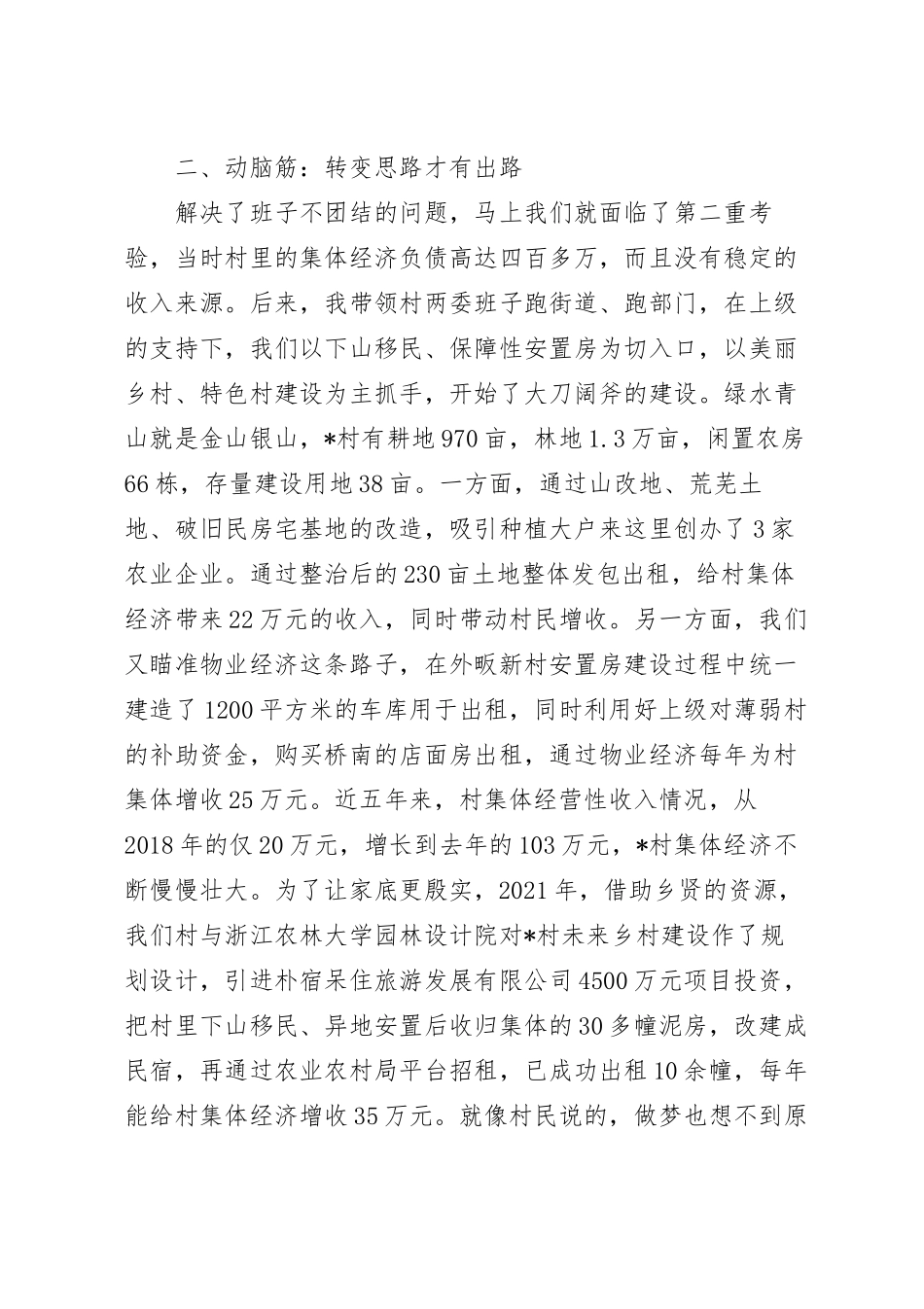 村党组织书记座谈会交流(4篇)目录用12年时间把旧三村变成新三村1只要想干敢干,再难的骨头也能啃下来3治村先治班子5想为家里做点像样的事7用12年时间把旧三村变成新三村作为一个连任4届的书记,我有过怀疑、有过委屈,但面对如今的变化,我更多的是自豪。下面我就从三个方面带大家一起来看看村里的这些变化。一、讲团结:团结才能出战斗力*村位于*江南面山区,与主城区隔江而望,交通便利,生态优美,森林覆盖率80%,人口2317人。2011年,我刚担任书记时,我们村是有名的“三村”:负债问题比较突出,矛盾纠纷比较多,经济基础比较薄弱。考虑到村里矛盾复杂,当时街道说选个女书记“以柔克刚”,说实话我也没底气,书记就劝我试一试,一试我就试了十二年。班子要是不团结,村庄就搞不好,人心齐才能泰山移,这十二年我用了三个“土办法”把大家拧成“一股绳”,一是吃得了苦、二是受得了气、三是共得了情。这些年,无论征迁拆迁还是劳动一小时,矛盾化解还是文明创建,我都带头冲在一线、带头做在前面,比如建衢铁路搬迁,在镇村干部共同努力下,只用了7天354穴坟墓全部顺利搬移,还包含160亩土地、18户农房。刚上任的时候,村里很多人都不理解,但是我始终坚信只要出发点是为了村里好,只要尊重老百姓的意见,时间长了慢慢大家都会支持。这十二年我们用委屈、实干和坚持一点点改变了老百姓对村两委的评价。班子好不好,关键在于用不用心,我们村里老年人多,年轻人很少,回村的年轻人更少,小卢是少数回村里并留在村里的年轻人,充实到班子里后,刚开始因为工资低,家里负担又重,思想波动比较大。我们了解到情况,主动为他找兼职、贴补家用,现在小伙子很踏实、也很用心。这三个故事只是我这十二年来的几个瞬间,正是这些点点滴滴让我们的村两委团结了,村里和谐了,村民心气顺了,村庄更好了。二、动脑筋:转变思路才有出路解决了班子不团结的问题,马上我们就面临了第二重考验,当时村里的集体经济负债高达四百多万,而且没有稳定的收入来源。后来,我带领村两委班子跑街道、跑部门,在上级的支持下,我们以下山移民、保障性安置房为切入口,以美丽乡村、特色村建设为主抓手,开始了大刀阔斧的建设。绿水青山就是金山银山,*村有耕地970亩,林地1.3万亩,闲置农房66栋,存量建设用地38亩。一方面,通过山改地、荒芜土地、破旧民房宅基地的改造,吸引种植大户来这里创办了3家农业企业。通过整治后的230亩土地整体发包出租,给村集体经济带来22万元的收入,同时带动村民增收。另一方面,我们又瞄准物业经济这条路子,在外畈新村安置房建设过程中统一建造了1200平方米的车库用于出租,同时利用好上级对薄弱村的补助资金,购买桥南的店面房出租,通过物业经济每年为村集体增收25万元。近五年来,村集体经营性收入情况,从2018年的仅20万元,增长到去年的103万元,*村集体经济不断慢慢壮大。为了让家底更殷实,2021年,借助乡贤的资源,我们村与浙江农林大学园林设计院对*村未来乡村建设作了规划设计,引进朴宿呆住旅游发展有限公司4500万元项目投资,把村里下山移民、异地安置后收归集体的30多幢泥房,改建成民宿,再通过农业农村局平台招租,已成功出租10余幢,每年能给村集体经济增收35万元。就像村民说的,做梦也想不到原来的“破泥房”摇身一变成了“黄金屋”了。通过几年的努力积累,我们已经从负债400多万存款300多万。未来,我们*村两委班子有信心,在这届任期内突破经营性收入200万元的大关,在共同富裕的道路上走深走实。三、得民心:金杯银杯不如口碑村里富了,不是真的富,老百姓富了,才算富。这几年,通过我们一年接着一年干,一任接着一任干,建成村民集中安置点3个,村子变美了,新村里一排排的安置房,白墙黑瓦、小楼小院,我们山里人的生活完全不输城里人。新村建设自来水、电、道路、绿化等配套齐全,特别是外畈新村,通过市人大等部门的推动,减少二次土建施工造成的不必要资金损失,对天然气建设也做了考虑,管道等设施做了预铺,今年全部完成了通气使用,在全市我们还是第一个实现通气的村。以前村里到了晚上黑灯瞎火,现在大家都开玩笑说晚上上厕所都不用...