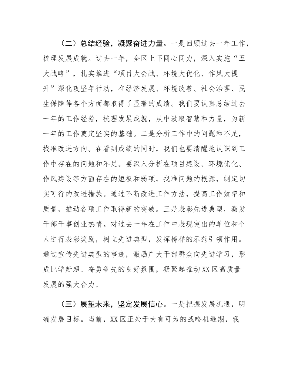 区委书记在2025年全区“项目大会战、环境大优化、作风大提升”攻坚突破年动员大会上的讲话同志们:今天,我们齐聚一堂,召开这场“项目大会战、环境大优化、作风大提升”攻坚突破年动员大会。这不仅是对过去工作的总结与表彰,更是对新一年工作的动员与誓师。目的就是要让全区上下迅速从节日氛围中收心归位,将思想和行动统一到党的二十届三中全会和总书记考察江西重要讲话精神上来,聚焦“走在前、勇争先、善作为”的目标要求,紧跟省委、市委的战略部署,持续推进“项目大会战、环境大优化、作风大提升”攻坚突破年行动,向着高质量发展的目标奋勇前行。下面,我讲几点意见。一、感恩奋进,激发攻坚突破原动力(一)牢记嘱托,坚定前行方向。一是深刻领会讲话精神,把准工作方向。总书记亲临江西考察指导,为我们的发展把脉定向、指路引航,这是对我们莫大的鼓舞和激励。全区党员干部要将学习贯彻总书记考察江西重要讲话精神作为首要政治任务,深入学习、深刻领会,准确把握其中蕴含的核心要义、精神实质和实践要求。通过开展专题学习研讨、教育培训等多种形式,引导广大党员干部学深悟透、融会贯通,切实把思想和行动统一到讲话精神上来,为推动XX区高质量发展提供坚实的思想保障。二是对标对表讲话要求,明确工作重点。对照总书记的重要讲话,结合XX区的实际情况,进一步明确我们的工作重点和发展方向。围绕省委打造“三大高地”、实施“五大战略”,市委打造“三个区域中心”、建设“一个美好家园”和高标准高质量建设长江经济带重要节点城市的部署,持续锚定“产业兴区、交通强区、文旅旺区、环境立区、幸福城区”五大战略,确保各项工作始终沿着正确的方向前进,不断开创XX区发展的新局面。三是以讲话精神为指引,推动工作落实。将总书记的重要讲话精神转化为推动工作的强大动力,切实抓好各项工作的落实。各部门、各单位要紧密结合自身工作实际,制定具体的工作方案和措施,明确责任分工,确保讲话精神在XX区落地生根、开花结果。要加强对工作落实情况的督促检查,及时发现问题、解决问题,确保各项工作任务按时高质量完成。(二)总结经验,凝聚奋进力量。一是回顾过去一年工作,梳理发展成就。过去一年,全区上下同心同力,深入实施“五大战略”,扎实推进“项目大会战、环境大优化、作风大提升”深化攻坚年行动,在经济发展、环境改善、社会治理、民生保障等各个方面都取得了显著的成绩。我们要认真总结过去一年的工作经验,梳理发展成就,从中汲取智慧和力量,为新一年的工作奠定坚实的基础。二是分析工作中的问题和不足,找准改进方向。在看到成绩的同时,我们也要清醒地认识到工作中存在的问题和不足。要深入分析在项目建设、环境优化、作风建设等方面存在的短板和弱项,找准问题的根源,制定切实可行的改进措施。通过不断改进工作方法,提高工作效率和质量,推动各项工作取得新的突破。三是表彰先进典型,激发干部干事创业热情。对过去一年在工作中表现突出的单位和个人进行表彰奖励,树立先进典型,发挥榜样的示范引领作用。通过宣传先进典型的事迹,激励广大干部群众向先进学习,形成比学赶超、奋勇争先的良好氛围,凝聚起推动XX区高质量发展的强大合力。(三)展望未来,坚定发展信心。一是把握发展机遇,明确发展目标。当前,XX区正处于大有可为的战略机遇期,我们要充分把握国家和省市的政策机遇,立足自身优势,明确发展目标。在新的一年里,我们要在打造现代产业集群、构建综合交通枢纽、促进文旅融合发展、全面推进乡村振兴、提升城市功能品质、推动全面深化改革、强化民生安全保障、党建引领基层治理等方面实现攻坚突破,为XX区的长远发展奠定坚实的基础。二是坚定发展信心,勇于迎接挑战。在前进的道路上,我们不可避免地会遇到各种困难和挑战。但我们要坚定发展信心,保持战略定力,勇于面对挑战,敢于攻坚克难。要相信只要全区上下团结一心、众志成城,就没有克服不了的困难,没有实现不了的目标。要以更加坚定的信心、更加饱满的热情、更加务实的作风,为实现XX区的高质量发展而努力奋斗。三是制定发展规划,确保目标实现。围绕发展目标,制定科学合理...