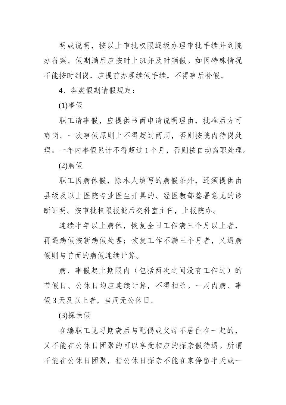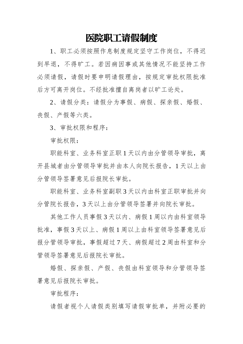 医院职工请假制度1、职工必须按照作息制度规定坚守工作岗位,不得迟到早退,不得旷工。若因病因事或其他情况不能坚持工作必须请假,请假时要申明请假理由,按规定审批权限批准后方可离开岗位。不经批准擅自离岗者以旷工论处。2、请假分类:请假分为事假、病假、探亲假、婚假、丧假、产假等六类。3、审批权限和程序:审批权限:职能科室、业务科室正职1天以内由分管领导审批,离开县城者由分管领导审批并由本人向院长报告,1天以上由分管领导签署意见后报院长审批。职能科室、业务科室副职3天以内由科室正职审批并向分管院长报告,3天以上由分管领导签署并向院长审批。其他工作人员事假3天以内、病假1周以内由科室领导批准,事假3天以上、病假1周以上由科室领导签署意见后报分管领导审批,事假超过7天、病假超过2周由科室和分管领导签署意见后报院长审批。婚假、探亲假、产假、丧假由科室领导和分管领导签署意见后报院长审批。审批程序:请假者视个人请假类别填写请假审批单,并附必要的证明或说明,按以上审批权限逐级办理审批手续并到院办备案。假期满后应按时上班并及时销假。如因特殊情况不能按时到岗,应提前办理续假手续,不得事后补假。4、各类假期请假规定:(1)事假职工请事假,应提供书面申请说明理由,批准后方可离岗。一次事假原则上不得超过两周,否则按院内待岗处理。一年内事假累计不得超过1个月,否则按自动离职处理。(2)病假职工因病休假,除本人填写的病假条外,还须提供由县级及以上医院专业医生开具的、经医教部签署意见的诊断证明。按审批权限报批后交科室主任,上报院办。连续半年以上病休,恢复全日工作满三个月以上者,再遇病假按新病假处理;恢复工作不满三个月者,又遇病假则与前面的病假连续计算。病、事假起止期限内(包括两次之间没有工作过)的节假日、公休日均应连续计算,不得扣除。一周内病、事假3天及以上者,当周无公休日。(3)探亲假在编职工见习期满后与配偶或父母不居住在一起的,又不能在公休日团聚的可以享受相应的探亲假待遇。所谓不能在公休日团聚,指公休日探亲不能在家停留半天或一夜者。xx省范围内均不在休探亲假之列。职工探望配偶每年休探亲假1次,假期30天。夫妇双方只能一方享受探亲假待遇。未婚职工探望父母每年休探亲假1次,假期20天。已婚职工探望父母每4年休探亲假1次,假期为20天。探亲假只能在当年或本周期内有效,原则上一次性休完。对无正当理由超期不归者按旷工处理。职工与父母任何一方能在公休日团聚的不能享受探望父母的探亲假待遇。职工在结婚当年不能享受探望父母的探亲假待遇。离婚职工当年不能享受一年一次的探望父母的探亲假待遇。离退休人员,从批准离退休的下月起不再享受相应的探亲假待遇。职工配偶系援外、出国人员的,根据上级有关规定执行。属于个人行为一律不准享受探亲假待遇。职工配偶系在职脱产学习并享受寒暑假待遇的,不再享受探亲假待遇。职工因自身因素造成夫妻两地分居的不能享受探亲假待遇。本年度内休病假或事假超过一个月者,不再享受探亲假待遇。(4)婚假男女双方均达到晚婚年龄的初婚者(即:男满25周岁,女满23周岁)假期10天,未达到晚婚年龄者只享受3天,批假以领取结婚证时间为准。再婚者假期3天。(5)丧假职工直系亲属死亡(父母、子女、配偶)给予丧假3天,差旅费用自理。(6)产假、计划生育假按照医院及上级有关计划生育政策执行。5、请假期间工资待遇(1)探亲假、婚假、丧假、产假工资发放:按我院工资发放标准发放,不享受假期内的绩效工资。(2)事假扣款额=(基础绩效+奖励绩效)/全月应出勤天数×事假天数(3)病假扣款额=(基础绩效+奖励绩效)×60%/全月应出勤天数×病假天数病假超过1个月至3个月以内,只发工资总额的xx%,病假满3个月至6个月,只发工资总额的xx%,休病假超过6个月的,从第七个月起,按当地最低工资标准发放生活补助。(4)合同制职工缺勤工资待遇每月累计在15天(包括15天)以内者,按缺勤天数扣发当月相应工资及奖金。每月累计缺勤15天以上者,扣除全部奖金,当月发工资420元。合同制职工产假工资待遇:有生...