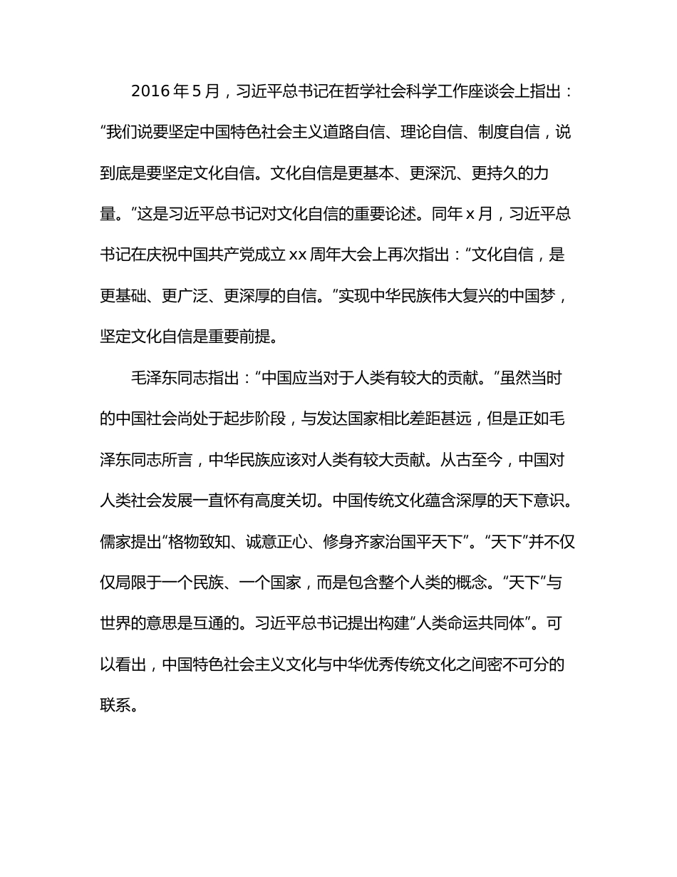 主题党日党课讲稿:坚持中国特色社会主义文化道路建设社会主义文化强国一、中国特色社会主义文化建设的重要性党的十九大报告指出:“文化是一个国家、一个民族的灵魂。文化兴国运兴,文化强民族强。没有高度的文化自信,没有文化的繁荣兴盛,就没有中华民族伟大复兴。”中华民族五千多年的历史有这样一个特点,王朝的强大与文化的兴盛紧密相连。比如,汉代和唐代。汉代的经济、军事、政治实力非常强盛,文化成果也多。司马迁的《史记》就是在西汉时期出现的。唐朝是文化高度繁荣的时代,诗词、书法、绘画、音乐等方面均有佳作流传于世。中国特色社会主义文化是一个什么样的概念?党的十九大报告是这样定义的:“中国特色社会主义文化,源自于中华民族五千多年文明历史所孕育的中华优秀传统文化,熔铸于党领导人民在革命、建设、改革中创造的革命文化和社会主义先进文化,植根于中国特色社会主义伟大实践。”这段论述里,有两大关键点。第一,中国特色社会主义文化的来源是中华优秀传统文化。第二,中国特色社会主义文化是在党领导人民革命、建设、改革中形成的。这是中国特色社会主义文化的一个基本定义。那么,文化建设在“五位一体”总体布局中,处于什么地位?党的十八大报告指出:“建设中国特色社会主义,总依据是社会主义初级阶段,总布局是五位一体,总任务是实现社会主义现代化和中华民族伟大复兴。”“五位一体”指的是经济建设、政治建设、文化建设、社会建设和生态文明建设。经济建设是根本,政治建设是保障,文化建设是灵魂,社会建设是条件,生态文明建设是基础。所以,文化建设是灵魂,能起到引导作用。说得再具体点,文化建设就是用先进的价值观武装国民,提供强有力的精神动力和智力支持,营造丰富多彩的新生活。精神动力主要是指价值观层面。党的十八大以来,党中央高度重视培育和践行社会主义核心价值观。智力支持主要是指科技文化方面。这就是文化建设的基本内涵。党的十九届五中全会提出到2035年建成文化强国的战略目标。这是党的十七届六中全会提出建设社会主义文化强国以来,党中央首次明确建成文化强国的具体时间表。二、文化自信的历史源流及现实意义2016年5月,习近平总书记在哲学社会科学工作座谈会上指出:“我们说要坚定中国特色社会主义道路自信、理论自信、制度自信,说到底是要坚定文化自信。文化自信是更基本、更深沉、更持久的力量。”这是习近平总书记对文化自信的重要论述。同年x月,习近平总书记在庆祝中国共产党成立xx周年大会上再次指出:“文化自信,是更基础、更广泛、更深厚的自信。”实现中华民族伟大复兴的中国梦,坚定文化自信是重要前提。毛泽东同志指出:“中国应当对于人类有较大的贡献。”虽然当时的中国社会尚处于起步阶段,与发达国家相比差距甚远,但是正如毛泽东同志所言,中华民族应该对人类有较大贡献。从古至今,中国对人类社会发展一直怀有高度关切。中国传统文化蕴含深厚的天下意识。儒家提出“格物致知、诚意正心、修身齐家治国平天下”。“天下”并不仅仅局限于一个民族、一个国家,而是包含整个人类的概念。“天下”与世界的意思是互通的。习近平总书记提出构建“人类命运共同体”。可以看出,中国特色社会主义文化与中华优秀传统文化之间密不可分的联系。在实现中华民族伟大复兴的历史进程中,中国也不断对世界作出自己的国际贡献。这也是我们坚定文化自信的另一方面。从20xx年到20xx年,我国对世界经济增长的平均贡献率达到xx%左右,超过美国、欧元区和日本贡献率的总和,居世界第一位。20xx年,中国经济对世界经济增长的贡献率为xx%左右。中国持续成为世界经济引擎。同时,世界上近四分之一的“独角兽”公司是中国的新创企业。20xx年,中国“独角兽”企业数量首次超过美国。中国在世界范围内的创新指数排名也在逐年上升。20xx年,中国在全球创新指数的排名升至第xx位,成为进入前xx名的唯一中等收入国家。20xx年,中国排在第xx位。20xx年和20xx年,中国位居第xx位。2021年,中国排在第xx位。这正是我国经济强劲稳健的表现。20xx年,受疫情影响,大部分全球主要经济体的GDP增长率变为负增长。美国的数值是-x.x%,英...