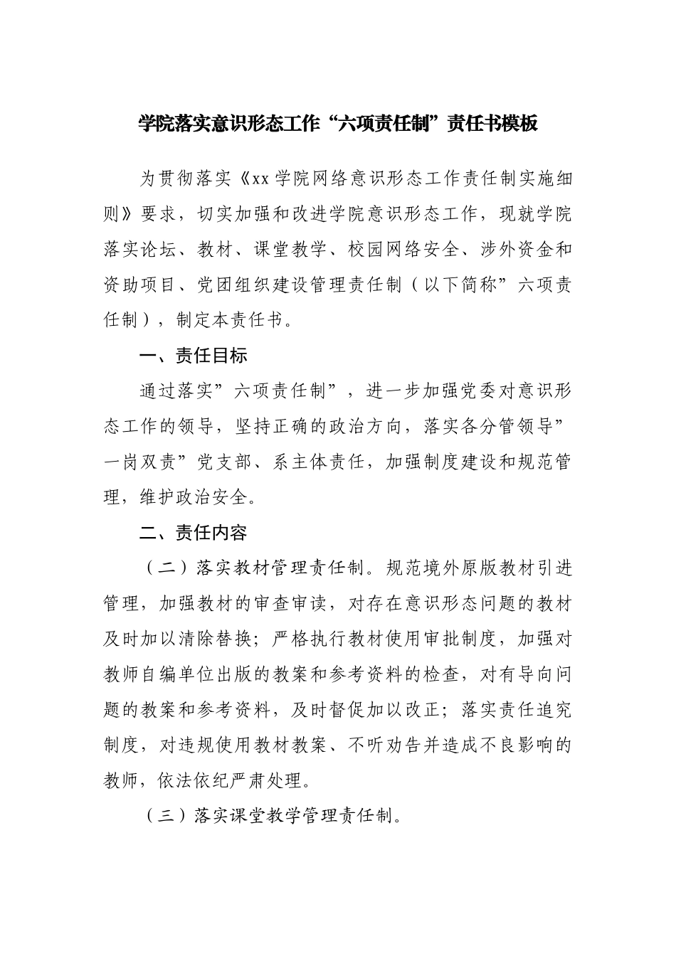 学院落实意识形态工作“六项责任制”责任书模板为贯彻落实《xx学院网络意识形态工作责任制实施细则》要求,切实加强和改进学院意识形态工作,现就学院落实论坛、教材、课堂教学、校园网络安全、涉外资金和资助项目、党团组织建设管理责任制(以下简称”六项责任制),制定本责任书。一、责任目标通过落实”六项责任制”,进一步加强党委对意识形态工作的领导,坚持正确的政治方向,落实各分管领导”一岗双责”党支部、系主体责任,加强制度建设和规范管理,维护政治安全。二、责任内容(二)落实教材管理责任制。规范境外原版教材引进管理,加强教材的审查审读,对存在意识形态问题的教材及时加以清除替换;严格执行教材使用审批制度,加强对教师自编单位出版的教案和参考资料的检查,对有导向问题的教案和参考资料,及时督促加以改正;落实责任追究制度,对违规使用教材教案、不听劝告并造成不良影响的教师,依法依纪严肃处理。(三)落实课堂教学管理责任制。严格执行学校课堂教学管理办法,健全课堂教学管理体系,严格执行教学考核、教学过程督导制度;对在课堂教学中传播错误言论、不听教育劝阻的,给予严肃批评教育直至调离解聘;严把教师聘用考核政治关,把政治标准作为教师聘用、考核的基本标准,严格聘用程序。(四)落实网络安全管理责任制。加强网络社区,微博、微信公众号等信息平台管理,发挥好党支部书记、系主任、辅导员、班主任和学生骨干的引领作用。加强队伍建设,牢牢把握网上舆论引导的主导权、话语权。(五)落实涉外资金和资助项目管理责任制。严格执行学校境外资金准入管理制度,明确院系、教师、学生接受境外资命资助的范围,规范接受资金资助审批程序;未经评估和审批的项目,不得接受境外资金和非政府组织资助;加强涉外合作交流项目排查和监管力度,严禁开展涉意识形态、涉敏感问题的项目合作,坚决防范和抵制境外非政府组织利用讲学访学,学术交流,项目合作等名义从事渗透破坏活动。(六)落实党团组织建设工作责任制。落实意识形态工作责任制,增强抓党建的主体责任意识。加强对各种社团组织的引导和管理,执行学校有关社团成立审批和年度检查制度,对挂靠的社会组织实行备案制度,加强活动监管;从严管控社团组织成员或师生个人参加西方国家使领馆、境外非政府组织开展的活动,规范师生接受境外媒体采访活动;综合运用法律、行政、教育等多种手段,防范和抵御境外势力利用宗教对师生进行各种渗透活动。三、责任要求(一)落实主体责任。党委全面负责组织落实”六项责任制”工作。落实分管领导直接责任和班子成员的”一岗双责”,落实党支部书记、系主任的主体责任。(二)实行责任追究制。严格执行”六项责任制”问题责任追究制度,全面实行工作问责、诫勉约谈、预警通报、挂牌督办、责任倒查等工作制度。严肃追责问责,对那些不履行责任、渎职失职造成不良后果的,要依法依规追究查处。(三)健全协调联动机制。在落实”六项责任制”工作中遇到的重大政策性问题,要及时请示报告。要加强意识形态工作的分析研判,及时发现苗头性、倾向性问题,争取工作主动权。要强化领导班子的协作分工,加强统筹管理,形成齐抓共管的工作格局。(四)严明保密纪律。加强意识形态工作是一项严肃的政治任务,要按照”内外有别"的原则组织实施,把握好工作的时、度、效。要加强党员干部的政治纪律教育和安全保密教育,增强政治意识和保密观念,防止因失密泄密问题引发炒作,影响工作大局。四、责任期限本责任书的责任期限为:20xx年xx月xx日至20xx年xx月xx日。学院党政领导签字:负责人签字:签订日期:20xx年xx月xx日