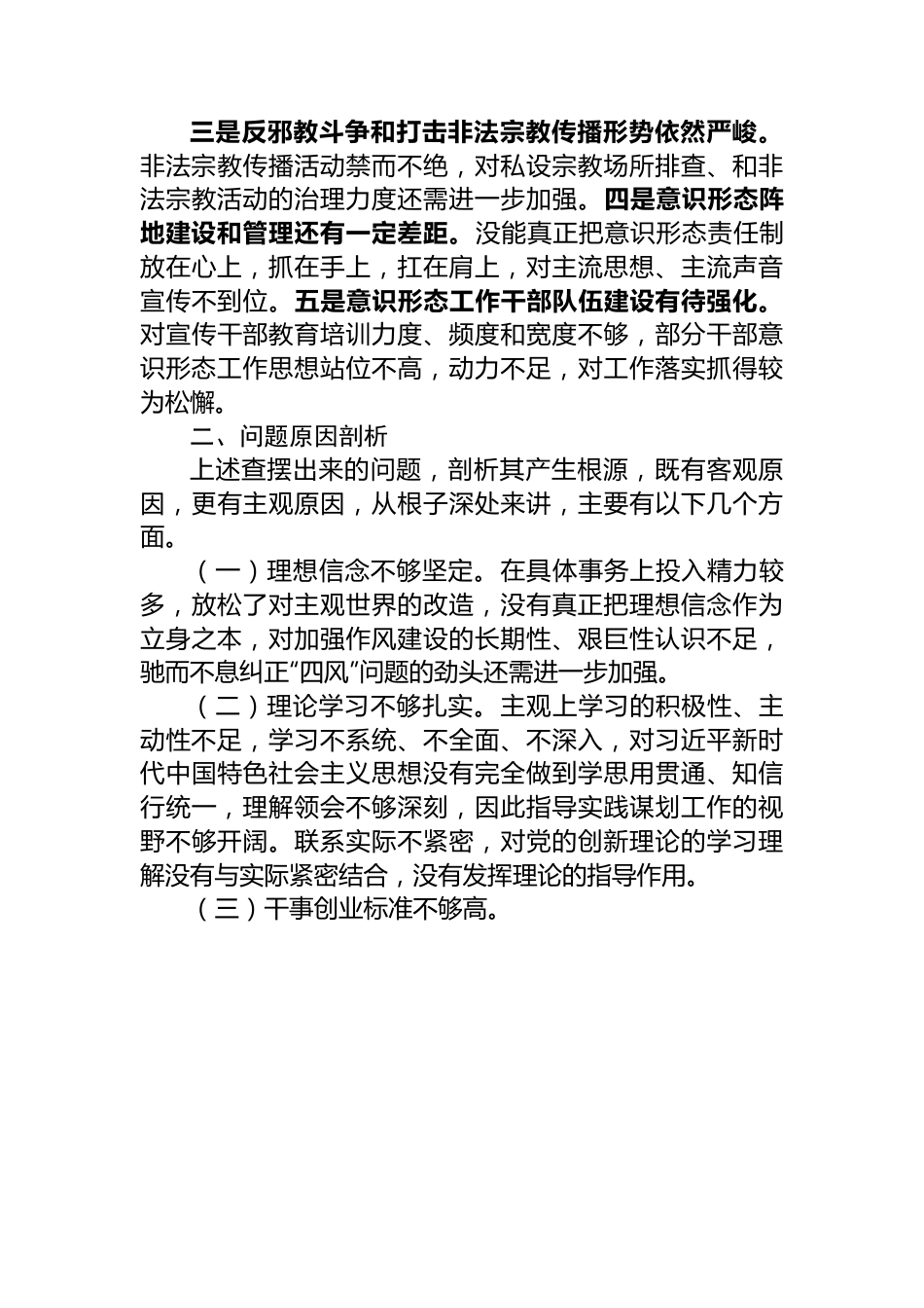 领导干部巡视整改专题民主生活会党员个人发言提纲按照省委巡视反馈意见整改落实工作相关要求和《中共X民主生活会的通知》要求,我深入学习了规定内容,在广泛征求意见、谈心交心的基础上,认真对照常规巡视和专项巡视发现的主要问题,结合自身实际深入进行查摆深刻剖析产生问题的原因,提出了改进措施和今后努力方向。一、围绕这次民主生活会查摆的主要问题(一)落实党的路线方针政策和党中央决策部署不到位一是学习贯彻党的二十大精神不够深入,推动振兴发展的力度不够大。在深学细悟笃行方面有差距。学习态度和深度广度上还存在一些不足,静下来深入学习思考比较少,理论学习抓而不紧。“现用现学、急用急学、不用不学”的思想没有完全消除,学习形式单一、学习质效不强。二是复杂形势认识不足。特别是对新形势下意识形态工作紧迫性、复杂性认识不足,对身边的倾向性、苗头性问题不够敏锐、警惕;开展意识形态工作的“金点子”、“微创意”挖掘提炼不够。(二)落实全面从严治党战略部署有差距。一是党风廉政建设压力传导不够。在落实全面从严治党“一岗双责”上,有时偏重于业务工作,对党风廉政建设一抓到底的劲头不足。二是落实党风廉政建设责任力度不强。存在说得多做得少的现象,廉政教育抓得不紧,好人主义思想较浓,对一些苗头性问题警钟敲得多,实际执行软,工作安排的多,抓日常监管相对不够。(三)落实新时代党的组织路线不扎实,党建工作存在薄弱环节一是创新意识有待加强。面对新形势新挑战,贯彻新发展理念、融入新发展格局还不够积极主动,特别是吸收新思想新知识,借鉴新经验还不够深入,对待工作有时只满足于完成上级和领导交办的任务,做好宣传工作的新思路新办法不多、求稳保底的思想抑制了创新发展思维。二是视野上的开阔度有待提升。在吃透中央精神、准确把握中央和省市工作的重心和节奏上,自己的思考深度,站位高度、工作力度还不够。如用“全面”“充分”的标准要求来对照衡量工作完成情况,仍然还有不少差距。(四)落实意识形态工作责任制情况反馈意见。一是意识形态工作的极端重要性认识不足,意识形态工作责任压得不实。对意识形态工作领导权掌握的不够牢,落实意识形态工作领导责任的自觉性不够高,在坚守意识形态主阵地、不断强化舆论引导能力,做社会主义核心价值观的引领者、传播者、践行者、推动者方面做得不够,基层宣传文化阵地作用发挥不充分,活动效果不尽如人意二是网络意识形态工作存在薄弱环节,管网用网水平有待提高。对意识形态工作的方法、规律掌握不够,对新媒体的运用不足等,使意识形态工作的创新方式、方法较少,层次不够高。三是反邪教斗争和打击非法宗教传播形势依然严峻。非法宗教传播活动禁而不绝,对私设宗教场所排查、和非法宗教活动的治理力度还需进一步加强。四是意识形态阵地建设和管理还有一定差距。没能真正把意识形态责任制放在心上,抓在手上,扛在肩上,对主流思想、主流声音宣传不到位。五是意识形态工作干部队伍建设有待强化。对宣传干部教育培训力度、频度和宽度不够,部分干部意识形态工作思想站位不高,动力不足,对工作落实抓得较为松懈。二、问题原因剖析上述查摆出来的问题,剖析其产生根源,既有客观原因,更有主观原因,从根子深处来讲,主要有以下几个方面。(一)理想信念不够坚定。在具体事务上投入精力较多,放松了对主观世界的改造,没有真正把理想信念作为立身之本,对加强作风建设的长期性、艰巨性认识不足,驰而不息纠正“四风”问题的劲头还需进一步加强。(二)理论学习不够扎实。主观上学习的积极性、主动性不足,学习不系统、不全面、不深入,对习近平新时代中国特色社会主义思想没有完全做到学思用贯通、知信行统一,理解领会不够深刻,因此指导实践谋划工作的视野不够开阔。联系实际不紧密,对党的创新理论的学习理解没有与实际紧密结合,没有发挥理论的指导作用。(三)干事创业标准不够高。在参加党内政治生活时,主观能动性不足,不自觉地放松了对党性的锻炼。在实际工作中,没有时刻以合格党员标准严格要求自己,忽视一些细节上的自律。三、下步努力方向和改进措施针对存在的突出问...