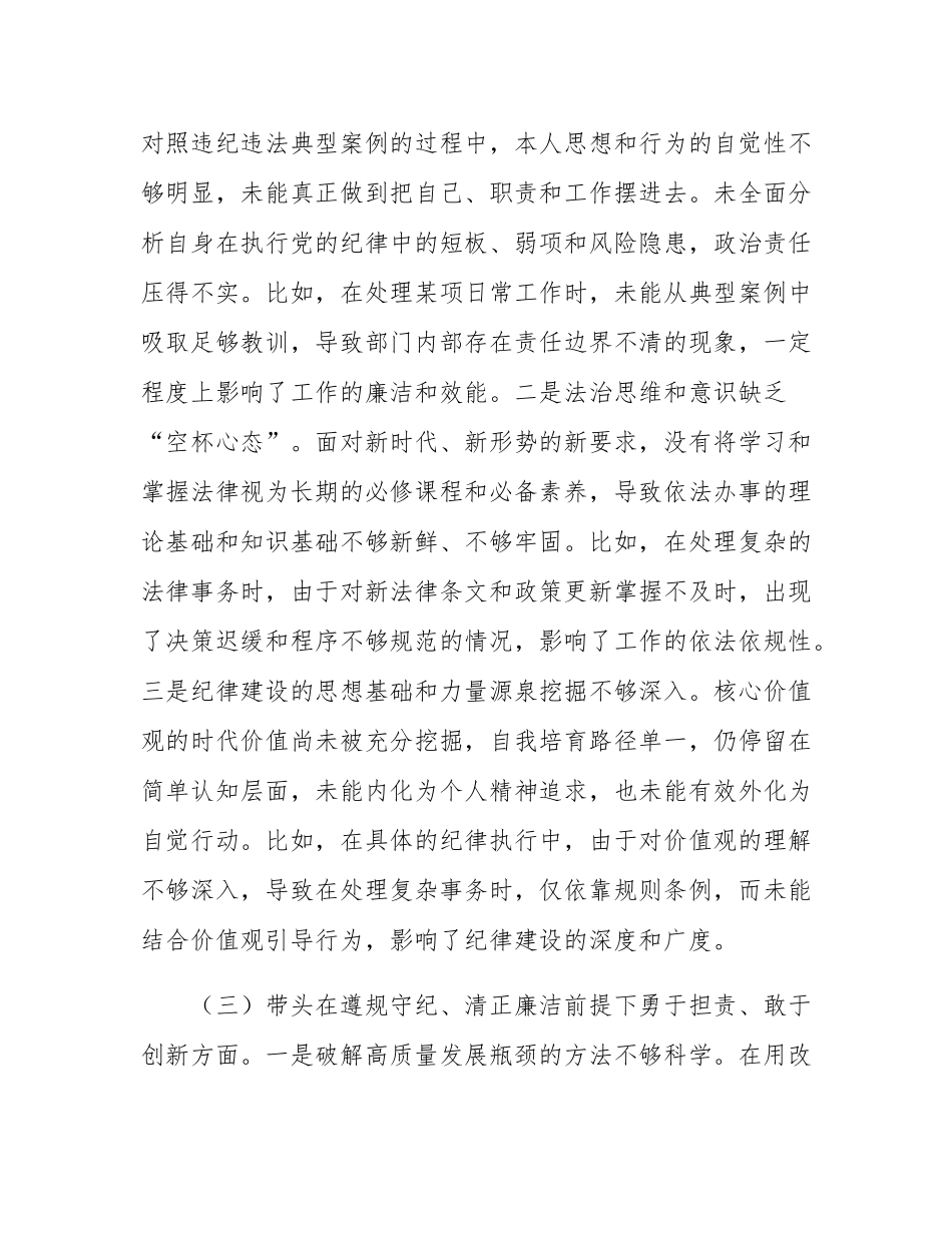 某市委书记2024年度民主生活会对照检查材料(含反面案例剖析)按照开好2024年度民主生活会的安排部署,会前,本人通过中心组集体学习、集中研讨、个人自学等方式,深入学习总书记重要讲话重要指示精神,系统研读党章、《中国共产党纪律处分条例》等党内法规,深刻领会进一步全面深化改革的重大意义和战略部署,紧密联系工作实际,广泛征求意见、开展谈心谈话,对照“带头严守政治纪律和政治规矩,维护党的团结统一;带头增强党性、严守纪律、砥砺作风;带头在遵规守纪、清正廉洁前提下勇于担责、敢于创新;带头履行全面从严治党政治责任”等x个方面,深入查找本人存在的问题,深刻剖析问题根源,进一步明确了下一步努力方向和整改措施。现将个人对照检查情况汇报如下:一、存在的突出问题(一)带头严守政治纪律和政治规矩,维护党的团结统一方面。一是理论学习制度设计不够精细。作为市委书记,我在安排年轻干部的理论学习时,没能做到按需分配,导致新干部有时找不到学习的方向。比如,上个月我们举办了一次专题党课,现场反映不错,但理论深度明显不够,更多时间在讲业务经验。我收到反馈说,有的年轻干部听了课后还是觉得理论学习有点悬浮。还有一名刚上任的干部提到,这次党课没能帮他理清楚发展经济和守住生态两者关系这个问题。二是严明政治纪律和政治规矩的工作思路不够清晰。作为市委书记,本人对如何严明政治纪律和政治规矩的思考和谋划不够深入,未能全面系统地将政治纪律的要求贯穿于各项工作中。从理论学习到实践落实,存在认识不深、把握不准的问题,对政治纪律是牵头管总这一重大政治要求缺乏全面的系统理解。比如,在推进重大决策时,未能充分开展党内讨论,导致部分政策执行中出现偏差,影响了工作的整体推进和成效。三是党内政治文化建设缺乏系统思维。存在缺乏系统化思维和改革化举措的问题,未能有效查摆、分析和研判党员干部中存在的个人主义、分散主义、自由主义和本位主义倾向。对如何打造创新活力的党内政治生活,往往沿用传统做法,未能与时俱进。比如,在组织党内活动时,习惯采用固定模式,缺少创新与活力,未能激发党员积极参与的热情,导致活动效果不理想。(二)带头增强党性、严守纪律、砥砺作风方面。一是修好共产党人的“心学”的主动性不足。在对标对表党中央要求、对照违纪违法典型案例的过程中,本人思想和行为的自觉性不够明显,未能真正做到把自己、职责和工作摆进去。未全面分析自身在执行党的纪律中的短板、弱项和风险隐患,政治责任压得不实。比如,在处理某项日常工作时,未能从典型案例中吸取足够教训,导致部门内部存在责任边界不清的现象,一定程度上影响了工作的廉洁和效能。二是法治思维和意识缺乏“空杯心态”。面对新时代、新形势的新要求,没有将学习和掌握法律视为长期的必修课程和必备素养,导致依法办事的理论基础和知识基础不够新鲜、不够牢固。比如,在处理复杂的法律事务时,由于对新法律条文和政策更新掌握不及时,出现了决策迟缓和程序不够规范的情况,影响了工作的依法依规性。三是纪律建设的思想基础和力量源泉挖掘不够深入。核心价值观的时代价值尚未被充分挖掘,自我培育路径单一,仍停留在简单认知层面,未能内化为个人精神追求,也未能有效外化为自觉行动。比如,在具体的纪律执行中,由于对价值观的理解不够深入,导致在处理复杂事务时,仅依靠规则条例,而未能结合价值观引导行为,影响了纪律建设的深度和广度。(三)带头在遵规守纪、清正廉洁前提下勇于担责、敢于创新方面。一是破解高质量发展瓶颈的方法不够科学。在用改革“关键之招”破解高质量发展瓶颈方面,对标国际先进水平的意识不够强,没有充分抓住新一轮科技革命和产业变革的新机遇,未能在新领域、新赛道上占据发展先机,新动能新优势的核心竞争力还需进一步增强。一些改革措施在战略重点、优先顺序、主攻方向、工作机制和推进方式上不够明确,比如在某高科技产业项目上,由于缺乏系统深入的创新战略,改革成效没有完全转化为发展优势,影响了整体竞争力的提升。二是防范化解重点领域风险意识不够强。面对新质生产力的发展所涉及的新技术、新产业...