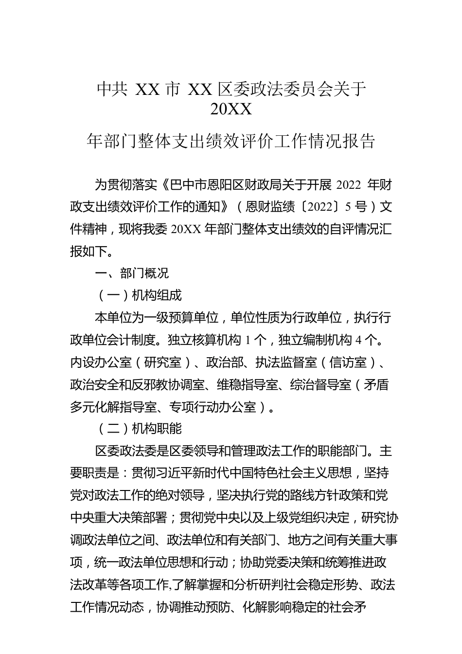 中共XX市XX区委政法委员会关于20XX年部门整体支出绩效评价工作情况报告为贯彻落实《巴中市恩阳区财政局关于开展2022年财政支出绩效评价工作的通知》(恩财监绩〔2022〕5号)文件精神,现将我委20XX年部门整体支出绩效的自评情况汇报如下。一、部门概况(一)机构组成本单位为一级预算单位,单位性质为行政单位,执行行政单位会计制度。独立核算机构1个,独立编制机构4个。内设办公室(研究室)、政治部、执法监督室(信访室)、政治安全和反邪教协调室、维稳指导室、综治督导室(矛盾多元化解指导室、专项行动办公室)。(二)机构职能区委政法委是区委领导和管理政法工作的职能部门。主要职责是:贯彻习近平新时代中国特色社会主义思想,坚持党对政法工作的绝对领导,坚决执行党的路线方针政策和党中央重大决策部署;贯彻党中央以及上级党组织决定,研究协调政法单位之间、政法单位和有关部门、地方之间有关重大事项,统一政法单位思想和行动;协助党委决策和统筹推进政法改革等各项工作,了解掌握和分析研判社会稳定形势、政法工作情况动态,协调推动预防、化解影响稳定的社会矛盾和风险,协调应对和妥善处置重大突发事件,协调指导政法单位和相关部门做好反邪教、反暴恐工作;加强对政法工作的督查,统筹协调社会治安综合治理、维护社会稳定、反邪教、反暴恐等有关国家法律法规和政策的实施工作;支持和监督政法单位依法行使职权,检查政法单位执行党的路线方针政策、党中央重大决策部署和国家法律法规的情况;指导和推动政法单位党的建设和政法队伍建设,协助党委及其组织部门加强政法单位领导班子和干部队伍建设,协助党委和纪检监察机关做好监督检查、审查调查工作;落实中央和省委、市委、区委关于国家政治安全和依法治国的决策部署,支持配合其办事机构工作;指导政法单位和协调政法单位,维护政治安全工作和执法司法相关工作;掌握分析政法舆情动态,指导和协调政法单位和有关部门做好依法办理、宣传报道和舆论引导等相关工作(三)人员概况本单位编制数18人,年末实有人数20人。其中:行政编制7人,机关工勤1人,事业编制10人。二、部门财政资金收支情况(一)部门财政资金收入情况20XX年财政拨款收入总计为993.22万元,其中:1.年初结转结余538.48万元,为一般公共预算财政拨款538.48万元。2.一般公共财政预算财政拨款本年收入454.74万元,其中:一般公共服务财政拨款收入362.84万元;公共安全财政拨款收入43万元;社会保障和就业财政拨款收入20.56万元;卫生健康财政拨款收入13.28万元;住房保障财政拨款收入15.06万元。(二)部门财政资金支出情况20XX年财政资金支出739.16万元,其中:1.一般公共服务支出473.35万元,其中:基本支出177.65万元,(基本工资66.22万元、津贴补贴37.31万元、奖金3.04万元、绩效工资21.95万元、其他社会保障缴费0.52万元、办公费2.18万元、印刷费1.65万元、电费0.89万元、邮电费4.42万元、物业管理费0.6万元、差旅费12.3万元、租赁费7.8万元、培训费0.79万元、公务接待费0.38万元、劳务费0.78万元、工会经费1.5万元、其他交通费用7.12万元、其他商品和服务支出8.11万元、奖励金0.09万元)保障全委工作正常运转,项目支出295.70万元(见义勇为基金0.5万元,弘扬了见义勇为传统美德;维稳专项工作经费9.61万元,保障全区维稳工作正常开展;大调解工作经费1.17万元,推动了各级矛盾纠纷多元化解领导机构和工作机构建设,化解矛盾纠纷案件;政法队伍教育整顿工作经费20.35万元,保障了政法队伍教育整顿工作的开展;应急演练工作经费5万元,进行了常态实战演练培训;平安创建工作经费3.4万元,夯实了平安创建基础,推进平安恩阳建设;特情费9.74万元,健全了情报信息网络,保障特情人员待遇;扫黑除恶维稳防邪工作经费6.36万元,深化网上网下情报搜集工作,除恶务尽,完成了特殊时期恩阳的稳控工作;政法专网及高清视频会议系统运行经费1万元,保障了高清视频运行系统正常运转;社区专干和社区专职网络管理员补助经费120.96万元,保障了网格员工作正常运行;社会治安综合治理及信访维稳经费100万元,全区重要活动维稳,老难信访人员稳控;扫黑除恶...
