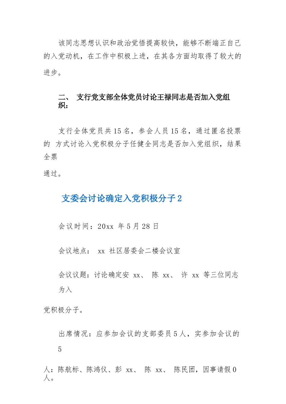 支委会讨论确定入党积极分子总结六篇支委会讨论确定入党积极分子1地点:XXX参加人员:xx、xx、xx、xx、xx、xx等人主持人:xx记录人:XX会议内容:一、支行党支部关于王禄同志加入党组织的讨论:(1)、入党介绍人王龙同志介绍王禄同志思想、工作情况:该同志能够严格要求自己,思想政治觉悟不断提高,入党态度进一步明确,努力工作,处处以党员的标准严格要求自己,取得了较大进步。(2)、入党介绍人王越同志介绍王禄同志思想、工作情况:该同志自向党组织递交入党申请书以来,能够积极向党组织靠拢,认真接受党组织的培养与考察,主动参加支行党支部的各项活动,在职工中起到了较好的带头作用。(3)、支行党支部书记王雷同志发言:该同志思想认识和政治觉悟提高较快,能够不断端正自己的入党动机,在工作中积极上进,在其各方面均取得了较大的进步。二、支行党支部全体党员讨论王禄同志是否加入党组织:支行全体党员共15名,参会人员15名,通过匿名投票的方式讨论入党积极分子任健全同志是否加入党组织,结果全票通过。支委会讨论确定入党积极分子2会议时间:20xx年5月28日会议地点:xx社区居委会二楼会议室会议议题:讨论确定安xx、陈xx、许xx等三位同志为入党积极分子。出席情况:应参加会议的支部委员5人,实参加会议的5人:陈航标、陈鸿仪、彭xx、陈xx、陈民团,因事请假0人。主持人:记录人:安xx会议主要内容:主持人:今天会议议题是讨论确定安xx、陈xx、许xx等三位同志为入党积极分子,下面请陈航标同志汇报入党申请人有关情况,然后大家对几位入党申请人能否确定为入党积极分子进行讨论,充分发表意见。同志汇报申请人有关情况:安xx同志于2009年5月向党组织递交了入党申请书,一段时间以来,能认真学习政治理论,严格要求自己,工作成绩比较突出,群众威信比较高,责任心,上进心较强,积极向党组织靠拢;陈xx同志于2008年3月向党组织递交了入党申请书,一段时间以来,能认真学习政治理论,严格要求自己,密切联系群众,做事认真负责,求上进,积极向党组织靠拢;陈xx同志于2009年6月向党组织递交了入党申请书,一段时间以来,认真对待政治理论学习,对自己严格要求,有上进心,积极向党组织靠拢。下面请大家对安xx、陈xx、陈xx同志能否取得为入党积极分子充分发表意见。彭xx同志发言:根据陈航标同志的汇报和我平时掌握的情况,我认为安xx同志为人诚实,积极要求进步,主动参加党组织举办的各种培训,思想上比较成熟,在工作中能起骨干作用,成绩比较突出;陈xx同志学习态度端正,工作态度认真,和睦邻里,群众基础扎实,积极上进;陈xx同志热爱集体,关心同志,入党动面端正。我同意确定他们三个为入党积极分子陈xx同志发言:根据陈航标同志的汇报和我平时掌握的情况,我认为安xx同志平时对待社区工作认真负责,严格遵守上班工作制度,尽职尽责,积极要求进步,成绩比较突出;陈xx同志群众基础扎实,积极要求进步,入党动机端正;陈xx同志思想政治觉悟较高,勤奋刻苦,以实际行动向党组织靠拢。我同意确定他们三人为入党积极分子主持人:到会的支部委员(或党员)5人,一致同意确定安xx、陈xx、陈xx等三位同志为入党积极分子,并按要求,各确定两名培养联系人,定期对他们进行培养和教育。支委会讨论确定入党积极分子3会议议题:讨论确定*****同志为入党积极分子会议时间:2016年9月19日会议地点:四楼会议室主持人:参加人数:应到人,实到人参加人员:记录人员:会议内容:今天召开中心党支部全体党员大会主要是讨论确定*******同志为入党积极分子相关事宜。********党支部共有党员X名,其中有表决权的正式党员X名,本次会议应到会正式党员X人,预备党员X名。有表决权的正式党员实到会人数超过应到会人员的一半,符合党章要求可以召开本次会议。一、介绍入党申请人的基本情况1、由支部书记XXX介绍入党申请人队伍的整体情况。二、逐个介绍拟确定为入党积极分子的XXX同志的基本情况(自我介绍)及党员代表推荐情况(推荐人介绍)。【已递交入党申请书且已派人谈话的入党申请人列为推荐对象,参加推荐的人员为全体党员,预备党员也能参加,党支部可通过会议推荐,个别谈话推荐,...