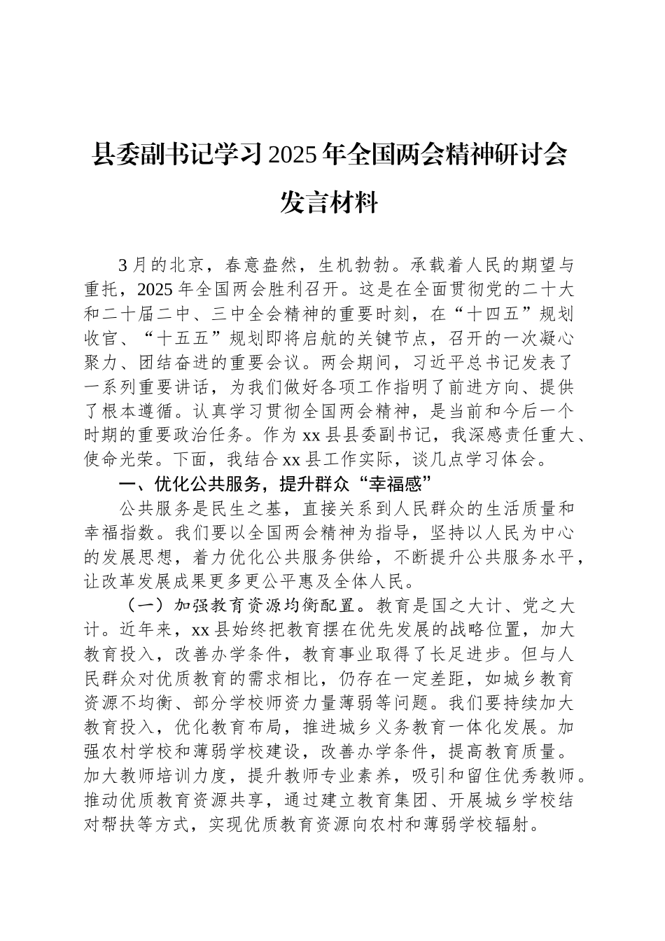县委副书记学习2025年全国两会精神研讨会发言材料3月的北京,春意盎然,生机勃勃。承载着人民的期望与重托,2025年全国两会胜利召开。这是在全面贯彻党的二十大和二十届二中、三中全会精神的重要时刻,在“十四五”规划收官、“十五五”规划即将启航的关键节点,召开的一次凝心聚力、团结奋进的重要会议。两会期间,习近平总书记发表了一系列重要讲话,为我们做好各项工作指明了前进方向、提供了根本遵循。认真学习贯彻全国两会精神,是当前和今后一个时期的重要政治任务。作为xx县县委副书记,我深感责任重大、使命光荣。下面,我结合xx县工作实际,谈几点学习体会。一、优化公共服务,提升群众“幸福感”公共服务是民生之基,直接关系到人民群众的生活质量和幸福指数。我们要以全国两会精神为指导,坚持以人民为中心的发展思想,着力优化公共服务供给,不断提升公共服务水平,让改革发展成果更多更公平惠及全体人民。(一)加强教育资源均衡配置。教育是国之大计、党之大计。近年来,xx县始终把教育摆在优先发展的战略位置,加大教育投入,改善办学条件,教育事业取得了长足进步。但与人民群众对优质教育的需求相比,仍存在一定差距,如城乡教育资源不均衡、部分学校师资力量薄弱等问题。我们要持续加大教育投入,优化教育布局,推进城乡义务教育一体化发展。加强农村学校和薄弱学校建设,改善办学条件,提高教育质量。加大教师培训力度,提升教师专业素养,吸引和留住优秀教师。推动优质教育资源共享,通过建立教育集团、开展城乡学校结对帮扶等方式,实现优质教育资源向农村和薄弱学校辐射。(二)提高医疗卫生服务水平。健康是人民幸福生活的基础。xx县在医疗卫生事业方面取得了显著成效,但仍面临一些挑战,如基层医疗卫生服务能力有待加强、优质医疗资源分布不均衡等。我们要深化医药卫生体制改革,加快构建分级诊疗制度,促进优质医疗资源下沉。加强县级医院和基层医疗卫生机构建设,提升医疗服务能力和水平。推进医联体建设,加强县级医院与基层医疗卫生机构的合作,实现人才、技术、设备等资源共享。加大医疗卫生人才培养和引进力度,提高医疗卫生队伍整体素质。加强公共卫生体系建设,提高应对突发公共卫生事件的能力。(三)完善公共文化体育设施。文化和体育是提高人民群众生活品质的重要内容。xx县拥有丰富的文化资源和群众体育基础,但公共文化体育设施还不够完善,不能满足人民群众日益增长的精神文化需求。我们要加大公共文化体育设施建设投入,完善县、乡、村三级公共文化体育设施网络。加强文化馆、图书馆、博物馆等文化场馆建设,提高场馆服务水平,丰富文化活动内容。推进全民健身设施建设,建设一批健身广场、体育公园、社区健身设施等,方便群众开展体育活动。举办丰富多彩的文化体育活动,满足不同群体的文化体育需求,提高人民群众的文化素养和身体素质。二、加强民生保障,织密民生“保障网”民生无小事,枝叶总关情。保障和改善民生是我们党一切工作的出发点和落脚点。我们要认真落实全国两会关于民生保障的各项部署,聚焦人民群众的急难愁盼问题,加大民生保障力度,织密织牢民生保障网,让人民群众的生活更有保障、更有安全感。(一)促进就业创业。就业是民生之本。xx县就业形势总体稳定,但就业结构性矛盾依然存在,如部分劳动者就业技能不足、就业渠道不够畅通等。我们要实施积极的就业政策,加大就业扶持力度,拓宽就业渠道。加强职业技能培训,根据市场需求和劳动者意愿,开展有针对性的职业技能培训,提高劳动者就业创业能力。鼓励创业带动就业,落实创业扶持政策,优化创业环境,培育创业主体。加强就业服务平台建设,完善就业信息发布机制,为劳动者和用人单位提供精准的就业服务。(二)完善社会保障体系。社会保障是保障人民生活、调节社会分配的一项基本制度。xx县社会保障体系不断完善,但仍需进一步加强和改进,如养老保险待遇水平有待提高、医保报销范围和比例还需优化等。我们要扩大社会保障覆盖范围,推动养老保险、医疗保险等社会保险应保尽保。提高社会保障待遇水平,逐步提高养老金标准、医保报销比例等,减轻群众医疗负担。加强...