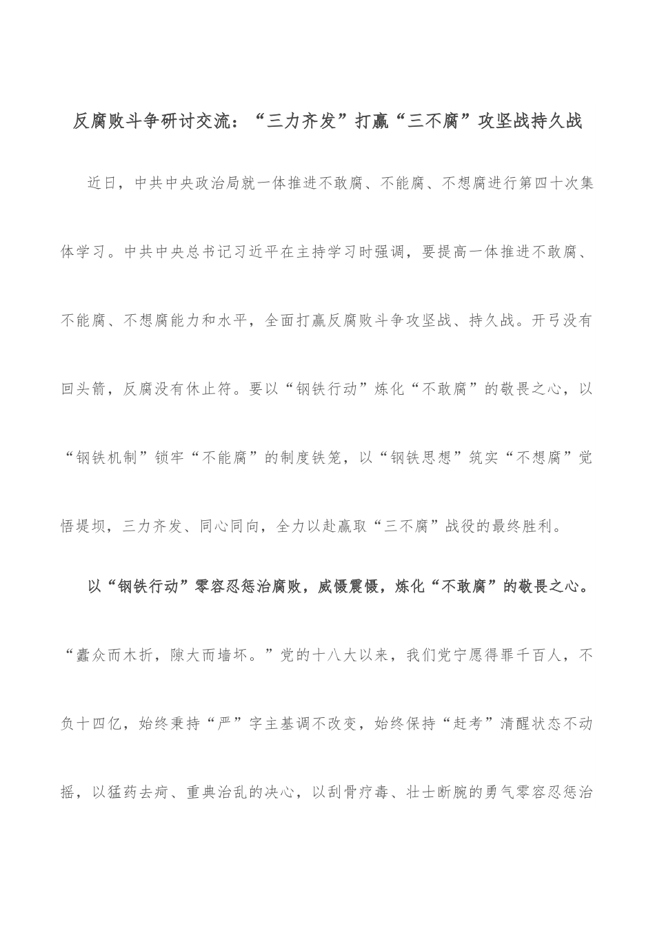 反腐败斗争研讨交流:“三力齐发”打赢“三不腐”攻坚战持久战近日,中共中央政治局就一体推进不敢腐、不能腐、不想腐进行第四十次集体学习。中共中央总书记习近平在主持学习时强调,要提高一体推进不敢腐、不能腐、不想腐能力和水平,全面打赢反腐败斗争攻坚战、持久战。开弓没有回头箭,反腐没有休止符。要以“钢铁行动”炼化“不敢腐”的敬畏之心,以“钢铁机制”锁牢“不能腐”的制度铁笼,以“钢铁思想”筑实“不想腐”觉悟堤坝,三力齐发、同心同向,全力以赴赢取“三不腐”战役的最终胜利。以“钢铁行动”零容忍惩治腐败,威慑震慑,炼化“不敢腐”的敬畏之心。“蠹众而木折,隙大而墙坏。”党的十八大以来,我们党宁愿得罪千百人,不负十四亿,始终秉持“严”字主基调不改变,始终保持“赶考”清醒状态不动摇,以猛药去疴、重典治乱的决心,以刮骨疗毒、壮士断腕的勇气零容忍惩治腐败,以“压倒性力量常在”的高压态势形成强有力的威慑效能,肃清“四风”积弊。我们党出硬招、出实招、出真招,坚决“打虎”“拍蝇”“猎狐”,以刀刃向内、利剑高悬之势坚决割除毒瘤,赢得了反腐败斗争主动权,赢得了人民衷心拥护的历史主动,也赢得了全党高度团结统一、走在时代前列、带领人民实现中华民族伟大复兴的历史主动。路漫漫其修远兮,要打赢攻坚战持久战,必须驰而不息、愈战愈勇,以“钢铁行动”炼化“不敢腐”的敬畏之心。以“钢铁机制”零缝隙防治腐败,刚性严密,锁牢“不能腐”的制度铁笼。物必先腐,而后生虫。回眸历史,即使一些王朝对腐败问题有认识、有防范,但终因缺少制度约束跳不出周期率。放眼世界,有效遏制腐败之“虫”滋生蔓延的国家均是依托严密周全的法规制度约束。古今中外、时空变换,唯有强有力的制度支撑,才能堵住防治腐败的“空子”,让“跑冒滴漏”无处遁形。政贵有恒,制贵必行。要治标也治本,去腐枝也拔根子,设置清晰、明确、鲜亮的“红线”“底线”“禁区”,不留“暗门”,不开“天窗”,锁牢锁严制度的铁笼。要保持因时而变、因势而新的敏锐警觉,不断更新制度、优化制度、修密制度,让变化多端、诡计多端的腐败问题无可乘之机、无藏身之地。要打赢攻坚战持久战,必须强而有力、久久为功,以“钢铁机制”锁牢“不能腐”的制度铁笼。以“钢铁思想”零松懈防腐拒变,教育教导,筑实“不想腐”觉悟堤坝。金竹千年不变节,云松万年不弯腰。习近平总书记曾在中央党校县委书记研修班学员座谈时强调,当官就不要发财,发财就不要当官,否则迟早要完蛋。理想信念是一个人的立身之本,只有正心明道、怀德自重,勤掸“思想尘”、多思“贪欲害”、常破“心中贼”,才能坦荡浩然正气。明代心学大师王阳明曾说,“破山中贼易,破心中贼难。”许多干部往往心存侥幸、以身试法,究其根本是信念的“总开关”不牢,用权的“方向盘”偏移,廉洁的“安全带”松懈,最终只能马失前蹄、失足翻车。党员干部要用理想信念强基固本,用党的创新理论武装思想,用优秀传统文化正心明德,补足精神之“钙”,铸牢思想之“魂”。要打赢攻坚战持久战,必须坚定思想、保持定力,以“钢铁思想”筑实“不想腐”觉悟堤坝。