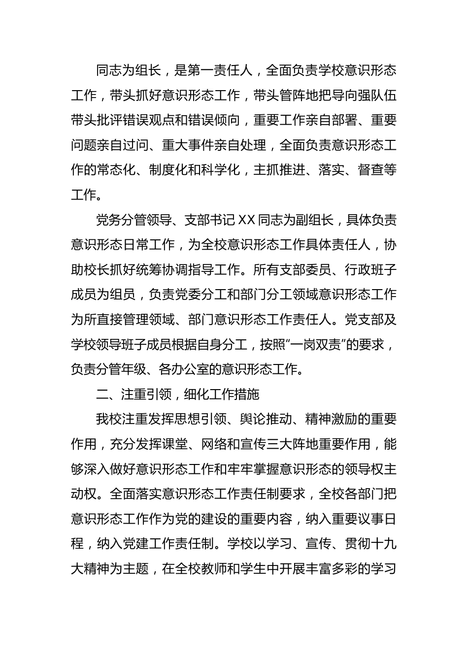 学校2023年意识形态工作汇报意识形态工作是党的一项极端重要的工作,有着引领社会、凝聚人心、推动发展的强大支撑作用。学校是意识形态领域的前沿阵地,也是反映社会意识形态诸般问题的晴雨表。2023年以来,我校牢牢掌握意识形态领域的领导权、管理权、话语权,努力做到守土有责、守土负责、守土尽责。为深入贯彻落实各级党委关于加强意识形态工作的精神和要求,我校坚持以习近平新时代中国特色社会主义思想为指导,紧紧围绕各级党委下发的关于开展意识形态工作的各项文件要求,加强了学校意识形态工作的建设增强了教师队伍的凝聚力、执行力、战斗力和亲和力,为圆满完成各项教育教学工作任务提供了强有力的思想保障组织保障、能力保障和机制保障。一、强化责任意识,明确职责分工学校党支部将意识形态工作作为党的建设和学校工作的重要内容,纳入党建工作责任制,纳入领导班子、领导干部目标管理责任制,与推进教育发展紧密结合。本学期我们召开了意识形态工作会议,学习了意识形态工作会议精神,并结合我校实际,制定了学校意识形态工作计划,强化责任意识、严格追究问责,将意识形态工作作为重要工作常抓不懈。在学校支部书记的领导下,我校成立了意识形态工作领导小组,校长XX同志为组长,是第一责任人,全面负责学校意识形态工作,带头抓好意识形态工作,带头管阵地把导向强队伍带头批评错误观点和错误倾向,重要工作亲自部署、重要问题亲自过问、重大事件亲自处理,全面负责意识形态工作的常态化、制度化和科学化,主抓推进、落实、督查等工作。党务分管领导、支部书记XX同志为副组长,具体负责意识形态日常工作,为全校意识形态工作具体责任人,协助校长抓好统筹协调指导工作。所有支部委员、行政班子成员为组员,负责党委分工和部门分工领域意识形态工作为所直接管理领域、部门意识形态工作责任人。党支部及学校领导班子成员根据自身分工,按照“一岗双责”的要求,负责分管年级、各办公室的意识形态工作。二、注重引领,细化工作措施我校注重发挥思想引领、舆论推动、精神激励的重要作用,充分发挥课堂、网络和宣传三大阵地重要作用,能够深入做好意识形态工作和牢牢掌握意识形态的领导权主动权。全面落实意识形态工作责任制要求,全校各部门把意识形态工作作为党的建设的重要内容,纳入重要议事日程,纳入党建工作责任制。学校以学习、宣传、贯彻十九大精神为主题,在全校教师和学生中开展丰富多彩的学习活动,用XX大精神武装广大党员的头脑,做到入脑、入心、见行动。广大教师积极撰写心得体会,组织开展思想交流活动;各班以黑板报、手抄报等形式在学生心中生根发芽;学校以活动为载体,开展丰富多彩的主题教育。学校支部把党员干部的意识形态教育渗透进党支部“三会一课”学习教育常态化计划之中,通过组织集体学习和个人自学的方式,要求每一位党员领导干部和党员教师都认真记录好学习笔记,在平时的工作中践行“四个意识”,提高政治站位和政治自觉,强化责任担当。党支部书记利用党课组织了全体党员教师作了努力做好“四有”好老师的党课讲座,让全体党员老师在知行合一中抓好意识形态工作。三、加强教师师德师风建设学校重视教师的师德建设,要求广大教师在教学水平、学术水平、科研方法等方面不断提高和创新;在教学科研工作中,要牢牢把握意识形态工作的主导权,弘扬爱国主义、集体主义、社会主义思想。在课堂教学方面,学校教师注重不断提高为学生传授知识、答疑解惑的能力。理论联系实际,帮助学生分析实际问题,提高了学生的知识运用能力。一是用主流价值观的各种实现形式和实现载体强化校园环境建设,学校将传统文化、中国特色社会主义理论、学校优良传统等浓缩固化,以文化墙、标语、橱窗、走廊班级宣传栏等为载体,把主流价值观以此形式表现出来,使学生在充满主流价值观的环境中受到熏陶。二是强化课堂教育和管理的针对性,课堂是学生接受教育的主要场所,学生的价值取向和思想文化素质形成很大程度上取决于课堂上教师的教学活动和人格魅力,在课堂教育的主阵地上,学校积极贯彻落实党的教育方针政策以弘扬社会主义主流价值观为根本要求,并以此作为教师...