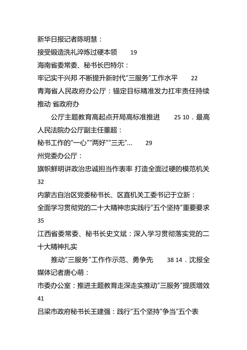 2023年办公厅、办公室“三服务”“五个坚持”素材汇编(24篇)目录1.辽宁省委秘书长张成中:把思想和行动统一到党的二十大精神上高质量做好新时代“三服务”工作12.青海日报本报记者田得乾:党建联盟强引领聚合力“出新出彩”促实干树形象记青海省委政研室党总支、省委办公厅综合一处党支部43.市委常务副秘书长安洪涛:党建引领纵深推进清廉机关建设聚焦主责主业全面提高“三服务”水平74.达洁玉:河南省委办公厅:唯实唯先当好排头兵9云南日报记者陈晓波:省政府办公厅深入开展“四讲”活动坚持典型引领打造模范机关13湖北省应城市委办公室杨乐:践行“五个坚持”书写精彩文章17新华日报记者陈明慧:接受锻造洗礼淬炼过硬本领19海南省委常委、秘书长巴特尔:牢记实干兴邦不断提升新时代“三服务”工作水平22青海省人民政府办公厅:锚定目标精准发力扛牢责任持续推动省政府办公厅主题教育高起点开局高标准推进2510.最高人民法院办公厅副主任董超:秘书工作的“一心”“两好”“三无”…29州党委办公厅:旗帜鲜明讲政治忠诚担当作表率打造全面过硬的模范机关32内蒙古自治区党委秘书长、区直机关工委书记于立新:全面学习贯彻党的二十大精神忠实践行“五个坚持”重要要求35江西省委常委、秘书长史文斌:深入学习贯彻落实党的二十大精神扎实推动“三服务”工作作示范、勇争先3814.沈报全媒体记者唐心萌:市委办公室:推进主题教育走深走实推动“三服务”提质增效41吕梁市政府秘书长王建强:践行“五个坚持”争当“五个表率”推动“三服务”事业高质量发展43中央党校(国家行政学院)办公厅:修炼“五气”练强“三服务”基本功47吉林省委秘书长李伟:以高质量“三服务”工作助力党的二十大精神在吉林厚植生根51乌海市委办公室:以量化考评提升“三服务”效能54青海日报记者郑思哲:以信息服务筑牢党执政为民基石记第四届青海省“人民满意的公务员集体”青海省委办公厅信息处56财政部办公厅:以主题教育扎实成效推动提升“三服务”工作水平60王阳:用实干护航中枢记北京市委办公厅与市政府办公厅保密工作65福建省委副秘书长、办公厅主任周宽奋:用新思想凝心铸魂以“五个坚持”指引航向69江西省委副秘书长、办公厅主任沈谦芳:扎实开展主题教育奋力推进“三服务”事新业发展74兰州日报社全媒体记者刘超:做好“三服务”保障工作切实提升机关工作质效皋兰县高质量推动人大办公室工作开创新局面78把思想和行动统一到党的二十大精神上高质量做好新时代“三服务”工作辽宁省委秘书长张成中党的二十大担负起全党的重托和人民的期待,擘画了未来五年乃至更长时期党和国家事业发展的宏伟蓝图。党办部门要切实把思想和行动统一到党的二十大精神上来,主动谋事,勇于担当,全力提升“三服务”工作水平。深刻领悟“两个确立”的决定性意义,坚决做到“两个维护”。新时代的十年,是党和国家发展进程中极不寻常、极不平凡的十年。正是因为有A总书记掌舵领航,全党才有了“顶梁柱”,14亿多中国人民才有了“主心骨”;正是因为有了A新时代中国特色社会主义思想的科学指引,全党全国各族人民才有了思想上的“定盘星”、行动上的“指南针”。“两个确立”作为党在新时代取得的重大政治成果,是我们战胜一切艰难险阻、应对一切不确定性的最大确定性、最大底气、最大保证。党办部门是政治机关,旗帜鲜明讲政治是第一要求,必须深刻领悟“两个确立”的决定性意义,增强“四个意识”、坚定“四个自信”、做到“两个维护”,把对党绝对忠诚落实在行动中。要在吃透党中央精神的前提下开展工作,办文、办会、办事都要坚持政治标准、考虑政治因素、注重政治效果,协助党委牢牢把好政治关口坚持把A总书记关于东北及辽宁振兴发展的重要讲话和指示批示精神的督办落实作为重要政治任务,建立工作台账明确职责任务,持续跟踪问效,确保落实落地。深刻领会A新时代中国特色社会主义思想的世界观和方法论,自觉做到学习跟进认识跟进行动跟进。党的二十大报告就开辟马克思主义中国化时代化新境界进行了集中阐述,鲜明提出了“六个必须坚持”,这是我们党首次从世界观和方法论的高度深刻阐述了推进理论创新的科学方...