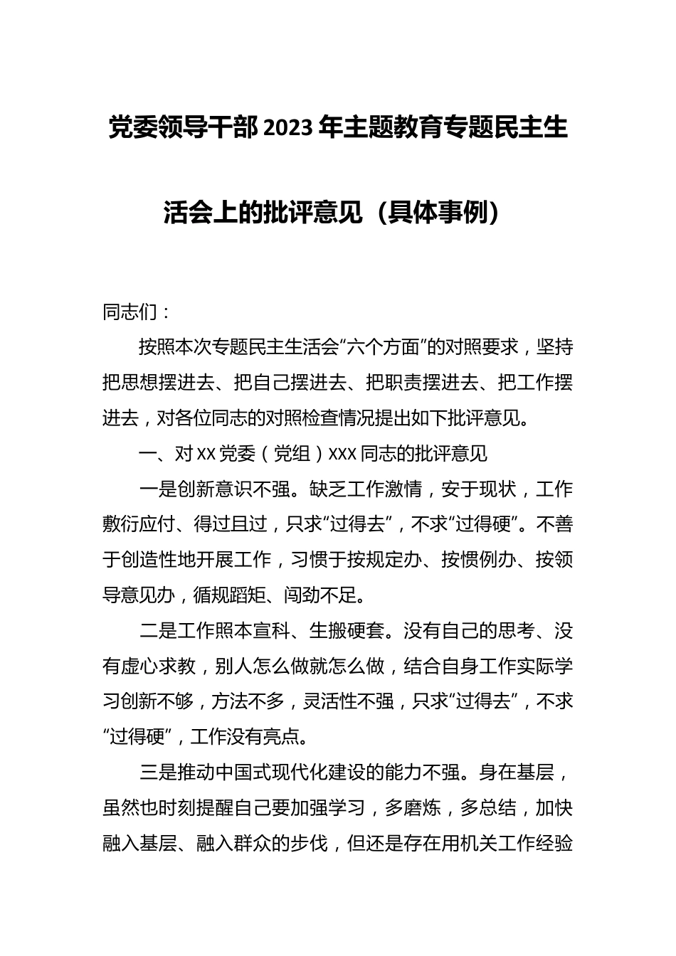 党委领导干部2023年主题教育专题民主生活会上的批评意见(具体事例)同志们:按照本次专题民主生活会“六个方面”的对照要求,坚持把思想摆进去、把自己摆进去、把职责摆进去、把工作摆进去,对各位同志的对照检查情况提出如下批评意见。一、对XX党委(党组)XXX同志的批评意见一是创新意识不强。缺乏工作激情,安于现状,工作敷衍应付、得过且过,只求“过得去”,不求“过得硬”。不善于创造性地开展工作,习惯于按规定办、按惯例办、按领导意见办,循规蹈矩、闯劲不足。二是工作照本宣科、生搬硬套。没有自己的思考、没有虚心求教,别人怎么做就怎么做,结合自身工作实际学习创新不够,方法不多,灵活性不强,只求“过得去”,不求“过得硬”,工作没有亮点。三是推动中国式现代化建设的能力不强。身在基层,虽然也时刻提醒自己要加强学习,多磨炼,多总结,加快融入基层、融入群众的步伐,但还是存在用机关工作经验开展基层工作的情况,存在新形势下基层工作方法、思路不多的情况,导致很多工作达不到预期的效果,归根到底还是工作能力不足。二、对XX党委(党组)XXX同志的批评意见一是个人思想境界标准不高。由于有本领恐慌的担忧因此小成即满、固步自封,大胆创新不足,且往往瞻前顾后,主动性、持续性差。工作热情不足,进取意识淡化,成效不明显。有时候由于工作太多,疲劳应对,会有想松口气、歇一歇、偷偷懒的想法。二是在落实“一岗双责”方面讲得多、问得少。缺少亲力亲为、一抓到底的干劲,指导开展廉政教育活动不够,一些具体工作的落实情况没有及时全面跟踪、教育监督。三、对XX党委(党组)XXX同志的批评意见一是“一岗双责”落实不力。总认为党风廉政建设是纪检监察部门的工作,有专门的分管同志、有专门的部门和人员具体负责,存在着对主体责任和监督责任的理解和重视程度不够、在风险防控、惩防制度等具体工作方面抓得不细、重业务轻党风廉政建设的情况,特别是对“抓好党风廉政建设是本职,不抓党风廉政建设是失职,抓不好党风廉政建设是渎职”的观念认识不全面,把严的要求贯彻到具体工作上还有不足。二是工作中被动作为现象依然存在。主动分担工作压力、主动补台补位意识以及主动关心、过问其他同志的工作做得不够,工作落实上也存在吃苦精神弱化的情况,久而久之产生了“疲劳”和“厌战”情绪,滋生了想歇一歇、偷偷懒的“惰性”;又如,由于岗位设置特殊、工作方式僵化、沟通不到位以及对如何更好发挥XXX作用的潜心打磨、锻造提炼不够等原因,导致工作灵活性、创新性不强,满足于完成任务、平平淡淡,统筹全局的能力确有不足。四、对XX党委(党组)XXX同志的批评意见一是党内政治生活带头落实不严肃。对党内政治生活重要性的认识还不够深刻,以普通党员身份参加XXX党支部的组织生活较少,没有很好地坚持党员领导干部参加党员大会、党小组会,过双重组织生活等制度。二是“四风”问题还一定程度上存在。联系服务群众不深入,到XX、XX了解情况少,习惯于坐在办公室电话指示、不接地气,“四风”问题有所增长,如,到XX(XX)安排工作存在会议落实会议、文件落实文件等形式主义情况,没有很好地研究会议和文件精神、细化分解工作任务。三是工作作风有时稍显急躁。在带XX参加XXX工作中,对迟到的同志批评过重,方式简单粗暴。在平时的待人接物上,由于性格和语言过于直接,大大咧咧,对待同志没有足够的耐心和细心。五、对XX党委(党组)XXX同志的批评意见一是对政治理论学习和思想政治建设抓得不够牢。没有真正把加强党性修养、严肃党内政治生活作为必修课,集体学习多是通过会议或者宣读文件的形式进行学习传达深入研讨的时间较少。二是自我革命的意识有所减弱。在认真贯彻落实中央八项规定精神方面,与A总书记“作风建设永远在路上”的要求相比,仍存在一定差距,满足于自己“不违规、不违纪”的底线。比如,对分管领域身边的同志没有真正做到时刻提醒自觉抵制歪风邪气,甚至发现问题了顾虑重重不敢提醒六、对XX党委(党组)XXX同志的批评意见一是个人自学缺乏足够的韧劲。思想教育、精神激励和灵魂洗礼不够,放松了对党性修养的再锤炼,没有严格按照合格党...