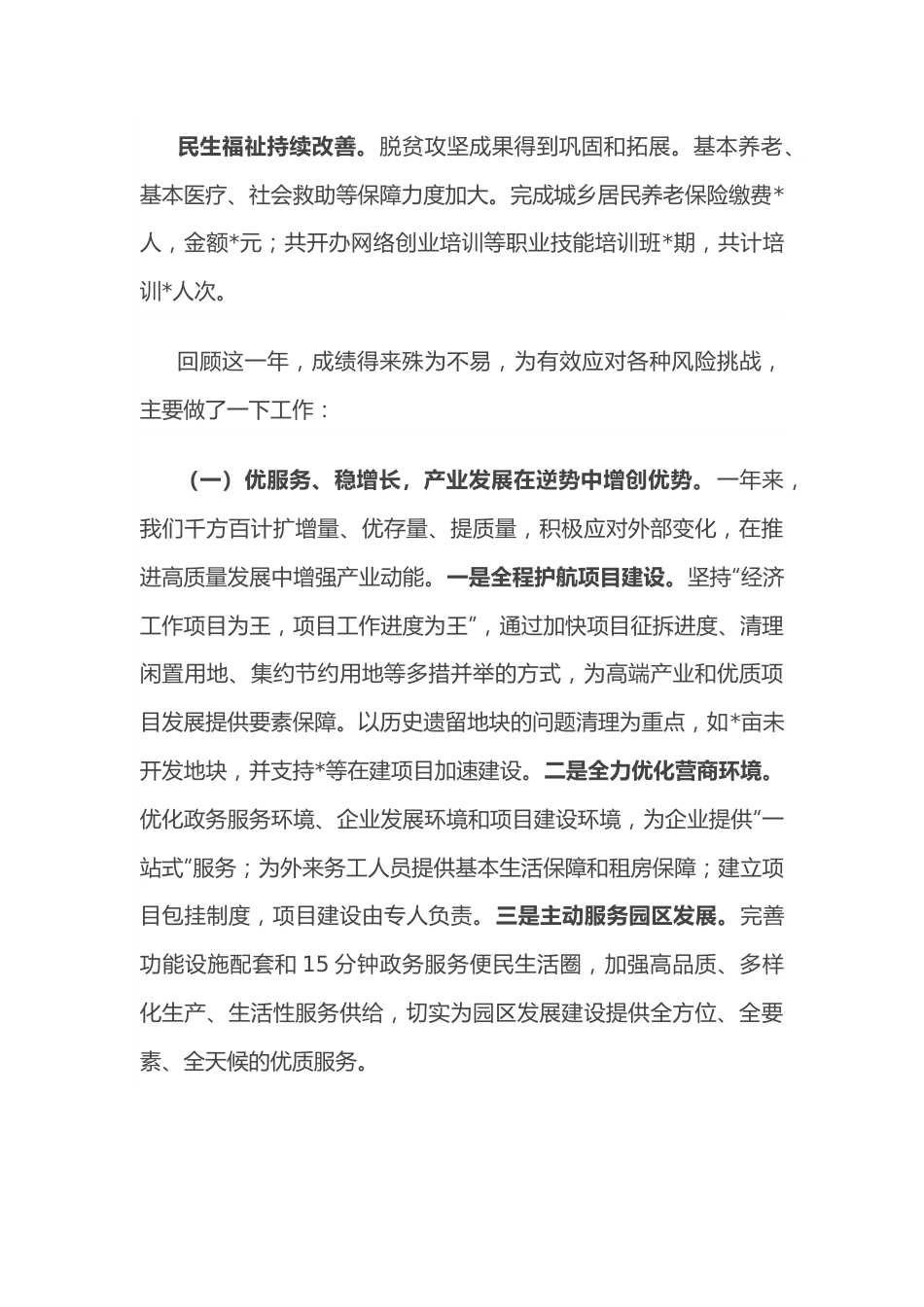 街道办事处2022年工作总结和2023年工作安排一、2022年工作回顾2022年是进入全面建设社会主义现代化国家、向第二个百年奋斗目标进军新征程的重要一年。在区委、区政府和街道党工委的坚强领导下,街道办事处深入贯彻习近平总书记对湖南重要讲话重要指示批示精神,在全力打造产城融合先行区、城市功能拓展区和社会治理示范区上取得新成效。经济发展平稳向好。1-10月,街道完成财税收入*万元,占全年任务的*%。预计完成规模工业产值*亿元,完成进度*%;预计完成固定资产投资*万元,完成进度*%;预计完成其他营利性服务业收入*万元,完成进度*%;完成社会零售品销售额*万元,同比增速*%。同时,完成服务业、商贸业“四上企业”各*家,另有*家规上工业待申报。重点项目稳步推进。1-10月,共计完成交地*亩,拆除*户。2022年滨江北片区共新铺征拆项目*个,预备项目*个,涉及腾地*亩,房屋*余户,现已完成W-*项目“四清交地”。区政府铺排2022年第三批次出让商住用地*宗地,涉及*街道*宗,已完成*宗地征地拆迁,交地*亩,拆除*户房屋。社会治理和谐稳定。申报*市2022年基层治理示范单位创建,指导*申报*市五型、五社示范创建,形成共建、共治、共享的城乡社区治理格局。健全“热线+网格、吹哨+报到”工作机制,1-10月,共办理*工单和雷锋哨工单合计*余件。民生福祉持续改善。脱贫攻坚成果得到巩固和拓展。基本养老、基本医疗、社会救助等保障力度加大。完成城乡居民养老保险缴费*人,金额*元;共开办网络创业培训等职业技能培训班*期,共计培训*人次。回顾这一年,成绩得来殊为不易,为有效应对各种风险挑战,主要做了一下工作:(一)优服务、稳增长,产业发展在逆势中增创优势。一年来,我们千方百计扩增量、优存量、提质量,积极应对外部变化,在推进高质量发展中增强产业动能。一是全程护航项目建设。坚持“经济工作项目为王,项目工作进度为王”,通过加快项目征拆进度、清理闲置用地、集约节约用地等多措并举的方式,为高端产业和优质项目发展提供要素保障。以历史遗留地块的问题清理为重点,如*亩未开发地块,并支持*等在建项目加速建设。二是全力优化营商环境。优化政务服务环境、企业发展环境和项目建设环境,为企业提供“一站式”服务;为外来务工人员提供基本生活保障和租房保障;建立项目包挂制度,项目建设由专人负责。三是主动服务园区发展。完善功能设施配套和15分钟政务服务便民生活圈,加强高品质、多样化生产、生活性服务供给,切实为园区发展建设提供全方位、全要素、全天候的优质服务。(二)强建管、提能级,城乡品质在融合中不断提升。一年来,我们积极主动谋借势、强保障、深对接,在加快城市化转型中实现建管并举。一是完成农安小区提质改造。东马佳园小区提质改造工程全面完成,对地下管网、停车空间等进行了全方位规划,对交通内循环、智慧管理、垃圾分类点、充电桩等进行了优化布局,对雷锋驿站、幼儿园、东马广场等资源进行配套完善。二是推进城市管理科学精细。通过提高城市科学化、精细化、智能化管理水平,让城市管理像“绣花”一样细密。重点在与群众生产生活密切相关、执法发生频率高、多头执法扰民问题突出的领域加强综合行政执法,落实严管重罚,促进长效管理。三是有力有序推进自建房安全隐患排查整治工作。目前隐患房屋已拆除*栋,走代收程序的*栋和整改中的*栋已按要求采取封控措施并同步开展维修加固工作。(三)破难题、探新路,基层治理在改革中迸发活力。一年来,我们持之以恒强弱项、攻重点、克难点,在加强社会治理上把握主动。一是做实“书记工程”。聚焦社会治理赋能升级,街道精心谋划打造“清白铸魂·聚沙成洲”书记工程品牌,坚持以破解治理难题、提升群众幸福感为导向,申报*个党(总)支部“书记工程”课题,初步形成以“蝶变佳园、潮涌腾飞、同心聚力、悦动响堂、善水黄田”为代表的党建品牌矩阵。二是做靓党员“闪亮工程”。坚持党员“亮身份、勇担当、树形象”,深入推进“闪亮工程”,*名农村党员联户*户,搜集民情问题*个,让“五必访五必记”有迹可循;*余名在职党员到社区“双报到双服务”,完成“共产党员户”挂牌及线下见面,...