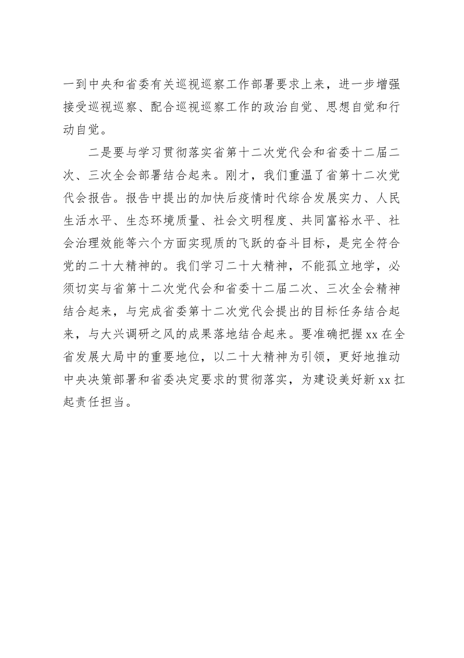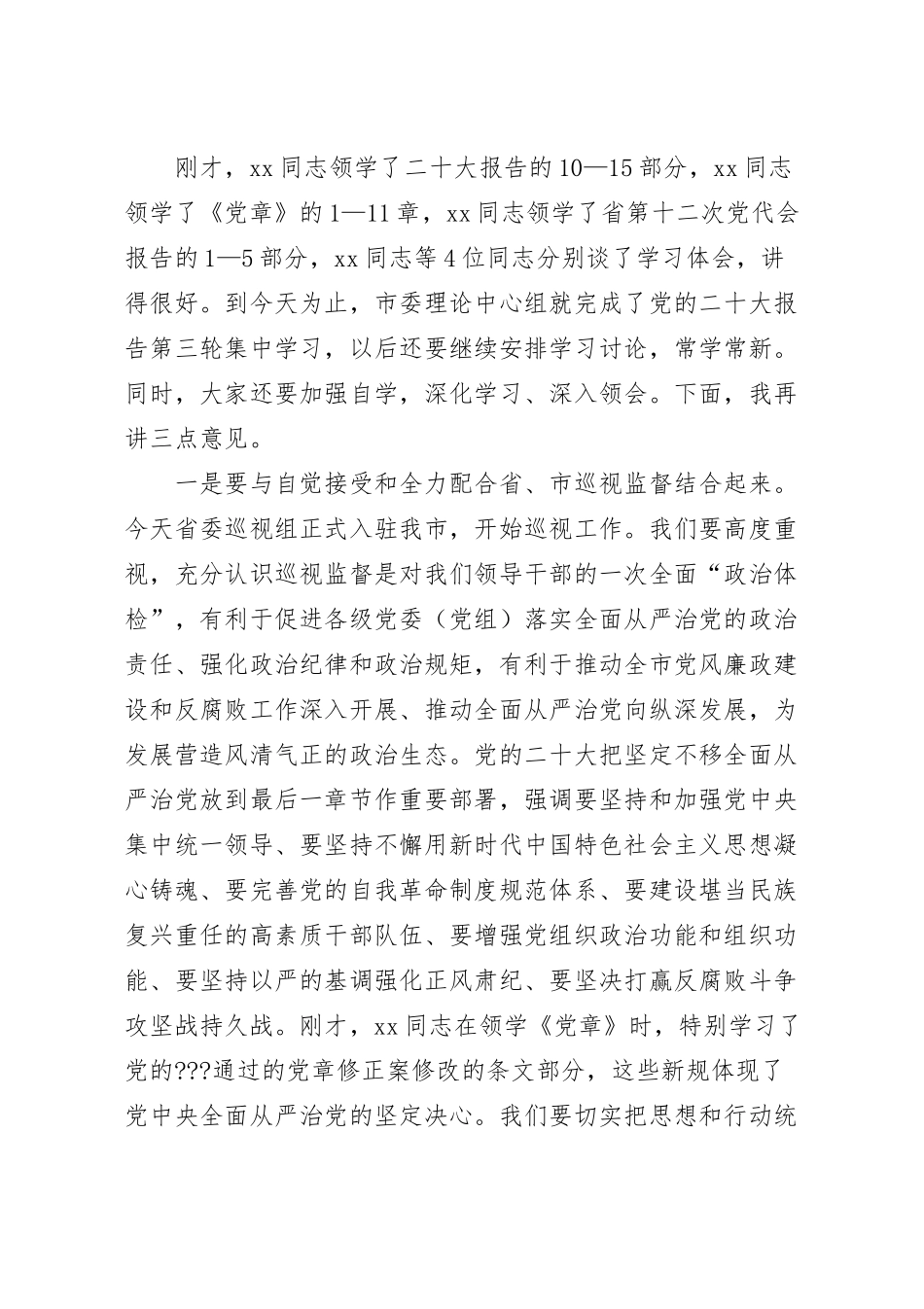在理论中心组学习会上的讲话稿刚才,xx同志领学了二十大报告的10—15部分,xx同志领学了《党章》的1—11章,xx同志领学了省第十二次党代会报告的1—5部分,xx同志等4位同志分别谈了学习体会,讲得很好。到今天为止,市委理论中心组就完成了党的二十大报告第三轮集中学习,以后还要继续安排学习讨论,常学常新。同时,大家还要加强自学,深化学习、深入领会。下面,我再讲三点意见。一是要与自觉接受和全力配合省、市巡视监督结合起来。今天省委巡视组正式入驻我市,开始巡视工作。我们要高度重视,充分认识巡视监督是对我们领导干部的一次全面“政治体检”,有利于促进各级党委(党组)落实全面从严治党的政治责任、强化政治纪律和政治规矩,有利于推动全市党风廉政建设和反腐败工作深入开展、推动全面从严治党向纵深发展,为发展营造风清气正的政治生态。党的二十大把坚定不移全面从严治党放到最后一章节作重要部署,强调要坚持和加强党中央集中统一领导、要坚持不懈用新时代中国特色社会主义思想凝心铸魂、要完善党的自我革命制度规范体系、要建设堪当民族复兴重任的高素质干部队伍、要增强党组织政治功能和组织功能、要坚持以严的基调强化正风肃纪、要坚决打赢反腐败斗争攻坚战持久战。刚才,xx同志在领学《党章》时,特别学习了党的???通过的党章修正案修改的条文部分,这些新规体现了党中央全面从严治党的坚定决心。我们要切实把思想和行动统一到中央和省委有关巡视巡察工作部署要求上来,进一步增强接受巡视巡察、配合巡视巡察工作的政治自觉、思想自觉和行动自觉。二是要与学习贯彻落实省第十二次党代会和省委十二届二次、三次全会部署结合起来。刚才,我们重温了省第十二次党代会报告。报告中提出的加快后疫情时代综合发展实力、人民生活水平、生态环境质量、社会文明程度、共同富裕水平、社会治理效能等六个方面实现质的飞跃的奋斗目标,是完全符合党的二十大精神的。我们学习二十大精神,不能孤立地学,必须切实与省第十二次党代会和省委十二届二次、三次全会精神结合起来,与完成省委第十二次党代会提出的目标任务结合起来,与大兴调研之风的成果落地结合起来。要准确把握xx在全省发展大局中的重要地位,以二十大精神为引领,更好地推动中央决策部署和省委决定要求的贯彻落实,为建设美好新xx扛起责任担当。