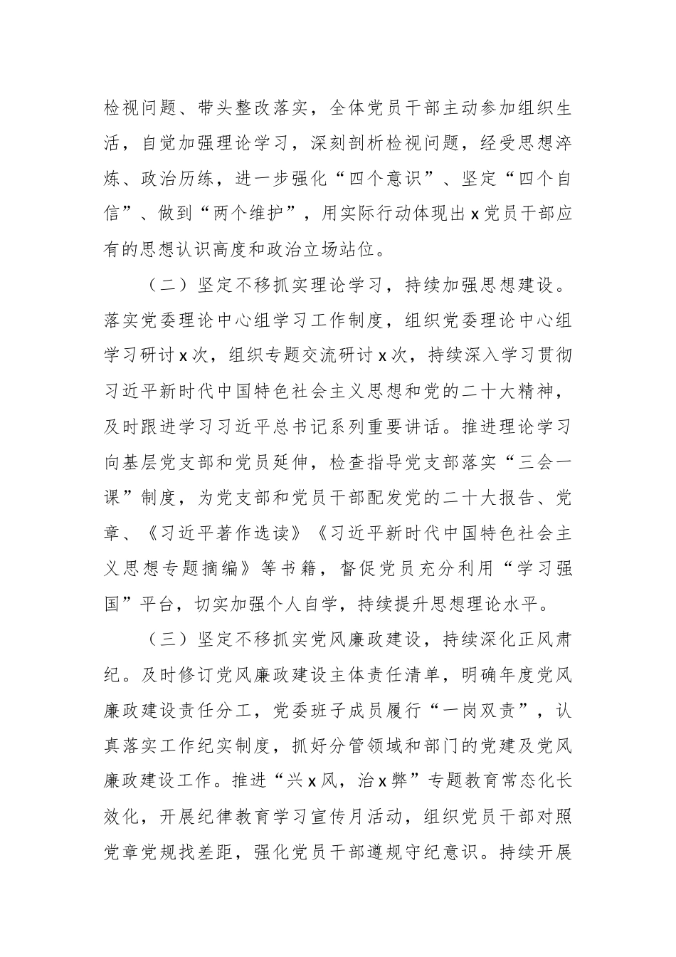 2023年上半年党委履行全面从严治党主体责任报告的工作汇报总结和下半年计划按照工作安排,现将x党委(党组)2023年上半年履行全面从严治党主体责任情况汇报如下。一、上半年工作履职情况上半年,x党委(党组)坚持以习近平新时代中国特色社会主义思想和党的二十大精神为引领,在x党委党组的正确领导下,在x党委班子成员的支持配合下,按照新时代党的建设总要求和省x党委年度党建工作会议部署,紧紧围绕x发展大局,认真履行党建工作第一责任人职责,为x持续、健康、稳定、和谐、高质量发展提供坚强政治、思想、组织、作风、文化保障。(一)坚定不移抓实理想信念引领,持续加强政治建设。结合实际,研究制定学习贯彻习近平新时代中国特色社会主义思想主题教育实施方案,举办为期一周的主题教育学习班,邀请省委党校专家教授作专题辅导1次,围绕“学习习近平新时代中国特色社会主义思想”开展交流研讨x次。深入开展调查研究,明确x个重点调研内容,推动调研成果及时转化为促进x发展的举措。坚持立行立改,开展整改落实“回头看”,持续推进各项整改措施落到实处努力推动主题教育取得实效。党委班子成员在主题教育中带头讲党课、带头检视问题、带头整改落实,全体党员干部主动参加组织生活,自觉加强理论学习,深刻剖析检视问题,经受思想淬炼、政治历练,进一步强化“四个意识”、坚定“四个自信”、做到“两个维护”,用实际行动体现出x党员干部应有的思想认识高度和政治立场站位。(二)坚定不移抓实理论学习,持续加强思想建设。落实党委理论中心组学习工作制度,组织党委理论中心组学习研讨x次,组织专题交流研讨x次,持续深入学习贯彻习近平新时代中国特色社会主义思想和党的二十大精神,及时跟进学习习近平总书记系列重要讲话。推进理论学习向基层党支部和党员延伸,检查指导党支部落实“三会一课”制度,为党支部和党员干部配发党的二十大报告、党章、《习近平著作选读》《习近平新时代中国特色社会主义思想专题摘编》等书籍,督促党员充分利用“学习强国”平台,切实加强个人自学,持续提升思想理论水平。(三)坚定不移抓实党风廉政建设,持续深化正风肃纪。及时修订党风廉政建设主体责任清单,明确年度党风廉政建设责任分工,党委班子成员履行“一岗双责”,认真落实工作纪实制度,抓好分管领域和部门的党建及党风廉政建设工作。推进“兴x风,治x弊”专题教育常态化长效化,开展纪律教育学习宣传月活动,组织党员干部对照党章党规找差距,强化党员干部遵规守纪意识。持续开展集中整治形式主义官僚主义和专项整治领导干部利用名贵特产、特殊资源谋取私利问题等专项工作,党委班子成员带头自查自纠,作出公开承诺,努力推动干部队伍作风建设取得新成效。(四)坚定不移落实意识形态工作责任制,持续加强阵地建设。推进学习型x建设,建立机关职工书屋,组织开展读书活动,教育引导干部职工自觉提升文化素养。严格规范党员干部网络行为,强化对党员干部互联网账号的日常监督管理,加强x网站、微信公众号发布信息审核,做到旗帜鲜明、立场坚定地发声,引领主流思想文化在x生根发芽。报送政务信息x篇,积极宣传展示x形象,为x事业发展营造良好舆论氛围。站在讲政治的高度,协同推进各项重点工作,扎实开展扫黑除恶专项斗争,积极做好宣传和线索征集工作。(五)坚定不移抓实基层组织建设,持续深化固本强基工程。召开年度党建工作会议,制定党建工作要点和工作清单,贯彻执行《中国共产党支部工作条例(试行)》督促各党支部结合实际修订工作制度。与x个党支部书记签订党建目标责任书,召开党建工作压实会,严格落实党支部书记抓党建工作职责。组织党务工作学习培训,安排x名党务干部参加专题研讨班,开展组织生活开放日活动,促进提升党务工作者业务能力。推进基层党支部联学共建基层党支部创先争优意识进一步增强,党建工作质量得到有力提升。继续实施党员积分制管理,加强积分结果在创先评优活动中的运用,持续深化“党员示范岗”创建活动,全年创建党员示范岗x个。严格按程序发展党员,组织预备党员进行入党宣誓,安排发展对象参加集中培训且全部合格毕业,加强入党积极分子...