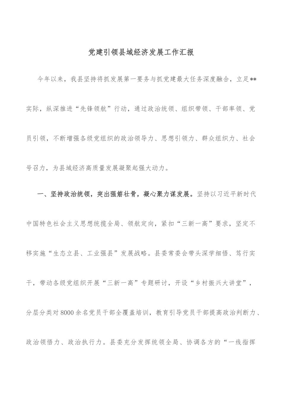 党建引领县域经济发展工作汇报今年以来,我县坚持将抓发展第一要务与抓党建最大任务深度融合,立足**实际,纵深推进“先锋领航”行动,通过政治统领、组织带领、干部率领、党员引领,不断增强各级党组织的政治领导力、思想引领力、群众组织力、社会号召力,为县域经济高质量发展凝聚起强大动力。一、坚持政治统领,突出强筋壮骨,凝心聚力谋发展。坚持以习近平新时代中国特色社会主义思想统揽全局、领航定向,紧扣“三新一高”要求,坚定不移实施“生态立县、工业强县”发展战略。县委常委会带头深学细悟、笃行实干,带动各级党组织开展“三新一高”专题研讨,开设“乡村振兴大讲堂”,分层分类对8000余名党员干部全覆盖培训,教育引导党员干部提高政治判断力、政治领悟力、政治执行力。县委充分发挥统领全局、协调各方的“一线指挥部”作用,研究制定县委全会、县委常委会工作规则,细化完善县委、县政府“三重一大”事项清单,定期听取人大常委会党组、政府党组、政协党组及其他党委(党组)工作情况汇报,全面推行县委常委分管部门党组、县级领导分组包抓乡镇的工作机制,高效协同推进落实县委确定的目标任务。二、坚持组织带领,突出强基固本,齐心勠力促发展。坚持以组织体系建设为重点,着力打造引领高质量发展的坚强战斗堡垒。立足建强乡村振兴“一线堡垒”,以开展强村拢心、富民舒心、为民暖心、文化润心、善治安心的“五心聚力建新村”活动为抓手,优化完善“一核多元”组织体系,全面推行“五链”建设模式,成立合作社党支部39个,划分产业党小组78个,扶持103名能人党员领办合作社,推动建成戈壁生态农业2万亩、特色产业60万亩,75个村集体经济收入超过5万元。立足打造工业强县“红色引擎”,在招商引资和项目建设一线,跟进成立党支部、组建党员突击队、划分党员责任区,选派92名党建工作指导员深入企业帮助指导党建工作。立足激活基层治理“红色动能”,深化拓展党建引领“三治融合”模式,将75个行政村划分为552个网格并设立党小组,组织750名乡村干部、28支驻村帮扶工作队、1368户党员中心户下沉网格,并大力实施城市基层党建“经纬连心线”工程,纵向构建五级联动“经线”,横向构建整合资源“纬线”,切实为高质量发展营造和谐稳定的社会环境。三、坚持干部率领,突出担当作为,尽心竭力抓发展。坚持把锻造坚强有力的骨干队伍作为高质量发展的关键来抓,突出领导带头、以上率下,组织36名县级领导干部带头包村攻坚、包户解忧、包企解困、包才聚智,帮助理思路、谋举措、解难题。树牢“为发展配干部、凭实绩用干部”的选人用人导向,从乡村振兴、招商引资、项目建设和疫情防控等一线提拔重用干部占比超过60%,对一些因各种问题不适宜担任领导职务的干部进行了调整,推动形成能者上、优者奖、庸者下、劣者汰的鲜明导向。精心组织实施年轻干部“蹲苗”计划,选派97名优秀干部到村挂职,组织36名干部到招商引资一线实践锻炼,实现历练干部和服务发展双促进、双提升。着眼打造引领发展“排头兵”,深入实施“人才兴县”战略,研究制定以《实施“人才兴县”战略的若干措施》为主的“1+4”政策体系,创新推出“十个一”引才育才惜才政策,招引高层次、高学历人才65名,选拔领军人才和乡土拔尖人才48名,建成人才公寓230套,为两地分居干部及时办理调动手续,全面激发人才创新创业的激情和活力。四、坚持党员引领,突出先锋示范,众心同力快发展。紧扣发展所需、群众所盼,持续激发党员队伍活力。聚焦农村党员争创“致富带富先锋”,积极探索“三化三评”分类管理模式,党员在产加销全产业链认领先锋岗8615个,作出服务承诺1.2万个,结成“1+N”帮扶对子2430个。聚焦社区党员争创“惠民和谐先锋”,创新探索“双向报到、双向服务”机制,组织1856名在职党员主动认领岗位,整合组建“五色服务先锋队”25支,带领党员群众高效协同实施城市更新行动,着力破解老旧小区改造、物业管理等热点难点问题。聚焦机关党员争创“为民服务先锋”,在为民服务一线创建党员先锋岗585个、党员示范窗口113个,引导机关党员在深化“放管服”改革中主动作为,群众的认可度和满意度显著提升。...