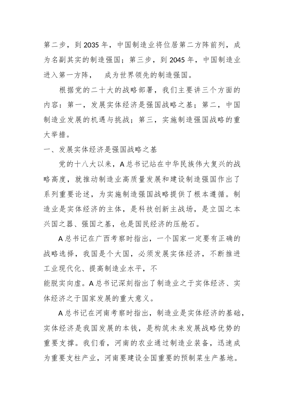 关于加快建设制造强国夯实实体经济基础中共中央党校(国家行政学院)经济学教研部副主任许正中(2023年8月22日)党的二十大深刻阐释了中国式现代化理论,为全面建设社会主义现代化国家指明了战略方向,提供了行动指南中国式现代化拓展了发展中国家走向现代化的途径,给世界上那些既希望加快发展又希望保持自身独立性的国家和民族提供了全新选择。中国共产党以人民情怀、天下胸怀团结带领中国人民在实践中开创中国式现代化,彰显出中国智慧,展现出世界价值,创造了人类文明新形态。党的二十大明确提出,坚持把发展经济的着力点放在实体经济上,推进新型工业化,加快建设制造强国、质量强国、航天强国、交通强国、网络强国、数字中国。2014年5月,A总书记在河南考察时提出,推动中国制造向中国创造转变、中国速度向中国质量转变、中国产品向中国品牌转变。制造业是实体经济的主体,是国民经济的支柱,是人民幸福安康的物质基础,也是今后我国经济“创新驱动,转型升级”的主战场。立足国情、立足现实我国确定了“三步走”的制造强国战略部署:第一步,到2025年,中国制造业进入制造强国第二方阵,迈入制造强国行列;第二步,到2035年,中国制造业将位居第二方阵前列,成为名副其实的制造强国;第三步,到2045年,中国制造业进入第一方阵,成为世界领先的制造强国。根据党的二十大的战略部署,我们主要讲三个方面的内容:第一,发展实体经济是强国战略之基;第二,中国制造业发展的机遇与挑战;第三,实施制造强国战略的重大举措。一、发展实体经济是强国战略之基党的十八大以来,A总书记站在中华民族伟大复兴的战略高度,就推动制造业高质量发展和建设制造强国作出了系列重要论述,为实施制造强国战略提供了根本遵循。制造业是实体经济的主体,是科技创新主战场,是立国之本兴国之器、强国之基,也是国民经济的压舱石。A总书记在广西考察时指出,一个国家一定要有正确的战略选择,我国是个大国,必须发展实体经济,不断推进工业现代化、提高制造业水平,不能脱实向虚。A总书记深刻指出了制造业之于实体经济、实体经济之于国家发展的重大意义。A总书记在河南考察时指出,制造业是实体经济的基础,实体经济是我国发展的本钱,是构筑未来发展战略优势的重要支撑。我们看,河南的农业通过制造业装备,迅速成为重要支柱产业,河南要建设全国重要的预制菜生产基地。现在,世界主要发达经济体逐步形成了共识,赢得全球竞争制高点仍然离不开制造业。全球产业竞争格局正发生前所未有的重大调整,特别是国际金融危机发生后,发达国家纷纷实施“再工业化”战略,力图重振制造业。如美国发布《重振美国制造业框架》,德国推出《德国工业4.0战略》,英国颁布《英国工业2050战略》,日本实施“产业振兴”战略,等等。什么是“制造强国”?“制造强国”的内涵包括规模和效益并举、科技创新能力强、在国际分工中处于附加值相对较高的地位、发展潜力大、产业链供应链稳定可靠等方面。从这个意义上看,全球制造业国家可以大致分为四个梯队:第一梯队是具备全球制造业科技创新中心地位的国家;第二梯队是在高端制造业领域能够具有显著竞争优势的国家;第三梯队是中低端制造具有成本优势的新兴和发展中国家;第四梯队主要是为制造业提供各种基础资源的国家。从发展客观实际来看,当前我国制造业正从第三梯队向第二梯队跃升。我们回顾一下工业革命发展历程。第一次工业革命,机械化生产蒸汽驱动,即工业1.0。18世纪60年代至19世纪中期,通过水力和蒸汽机实现的工厂机械化可称为工业1.0。这次工业革命的结果是机械生产代替了手工劳动,经济社会从以农业、手工业为基础转型到了以工业以及机械制造带动经济发展的模式。我们来看18世纪60年代发生的三件事:一是瓦特改造出第一台有实用价值的蒸汽机;二是亚当·斯密的《国富论》首次出版;三是美国独立战争爆发。第二次工业革命,批量流水线生产电力驱动,即工业2.0。19世纪后半期至20世纪初,在劳动分工的基础上采用电力驱动产品的大规模生产可称为工业2.0。这次工业革命,通过零部件生产与产品装配的成功分离,开创了产品批量生产的新模式。第三次工业革命,...