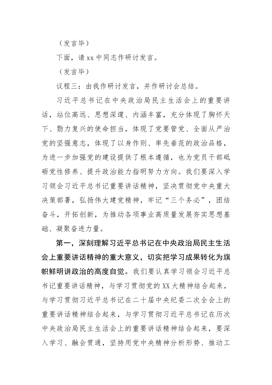2022年度民主生活会会前学习暨2023年理论学习中心组集中学习研讨会发言同志们:今天组织大家召开会议是开展理论中心组2023年集中学习研讨,同时也是2022年度民主生活会会前学习研讨。会前,大家对重点学习内容进行了认真研读,稍后将进行学习心得交流发言。本次会议是民主生活会会前学习研讨,是高质量开好民主生活会的基础,大家务必高度重视。今天会议的主题是,深刻领悟“两个确立”决定性意义,增强“四个意识”、坚定“四个自信”、做到“两个维护”,团结带领党员干部群众以奋发有为的精神贯彻落实党的XX大作出的重大决策部署,为开好编办领导班子专题民主生活会打牢思想基础。今天会议共有三项议程,一是分别由xx、xx、xx中同志领学本次研讨会重点学习内容;二是请在家班子成员依次进行研讨交流发言;三是由我作研讨发言,并作研讨会总结。下面,我们依次进行。议程一:由xx、xx、xx中同志领学本次研讨会重点学习内容;(学习毕)议程二:请编办中心组成员依次围绕研讨主题作发言;首先,请XX同志作研讨发言;(发言毕)下面,请xx同志作研讨发言;(发言毕)下面,请xx中同志作研讨发言。(发言毕)议程三:由我作研讨发言,并作研讨会总结。习近平总书记在中央政治局民主生活会上的重要讲话,站位高远、思想深邃、内涵丰富,充分体现了胸怀天下、勠力复兴的使命担当,体现了党要管党、全面从严治党的坚强意志,体现了以身作则、率先垂范的政治品格,为进一步加强党的建设提供了根本遵循,也为党员干部砥砺党性修养、提升政治能力指明努力方向。我们要深入学习领会习近平总书记重要讲话精神,坚决贯彻党中央重大决策部署,弘扬伟大建党精神,牢记“三个务必”,团结奋斗,开拓创新,为推动各项事业高质量发展夯实思想基础、凝聚奋进力量。第一,深刻理解习近平总书记在中央政治局民主生活会上重要讲话精神的重大意义,切实把学习成果转化为旗帜鲜明讲政治的高度自觉。我们要认真学习领会习近平总书记重要讲话精神,与学习贯彻党的XX大精神结合起来,与学习贯彻习近平总书记在二十届中央纪委二次全会上的重要讲话精神结合起来,与学习贯彻习近平总书记在历次中央政治局民主生活会上的重要讲话精神结合起来,要深入学习、融会贯通,坚持用党中央精神分析形势、推动工作,始终同党中央保持高度一致。第二,持续加深对习近平总书记重要讲话精神的理解把握,提高政治站位,增强查找问题、开展批评、整改落实的针对性,为高质量开好民主生活会奠定思想和理论基础。认真领悟党的XX大提出的新思想新论断、作出的新部署新要求,用实际行动坚定捍卫“两个确立”、坚决做到“两个维护”,不断提高政治判断力、政治领悟力、政治执行力,切实把思想和行动统一到党中央精神上来,打牢开好2022年度民主生活会的思想基础。要严格按民主生活的程序和要求,采取个别谈话、集体座谈、随机交流等多种形式,深入开展谈心谈话,要坚持问题导向,聚焦2022年度民主生活会的主题,对照党的XX大精神和党章党规党纪,重点围绕“带头深刻领悟‘两个确立’的决定性意义,增强‘四个意识’、坚定‘四个自信’、做到‘两个维护’”等6个方面问题,高标准严要求开好2022年度民主生活会。第三,切实把思想和行动统一到总书记重要讲话精神上来,始终心怀“国之大者”,带头担当作为,弘扬“严快细实”的工作作风,推动中央和X各项决策部署落地见效。2023年是全面贯彻落实党的XX大精神的开局之年,做好经济社会发展工作意义重大。我们要要牢牢坚持党对机构编制工作的绝对领导,自觉将各项工作置于经济社会发展的具体实践中。着力提升政治能力,不断提高政治判断力、政治领悟力、政治执行力,牢记“国之大者”,善谋国之大计、党之大计,切实增强推动高质量发展本领、服务群众本领、防范化解风险本领,不折不扣贯彻落实中央八项规定及其实施细则精神,重点纠治形式主义、官僚主义顽疾。最后,为确保高质量开好民主生活会,我再强调一下,希望班子成员深入学习、精心准备,认真对照、深刻剖析,撰写好个人剖析材料,要把习近平总书记重要讲话精神贯穿到开好2022年度民主生活会中,主动全面对标对表,确保民主生活...