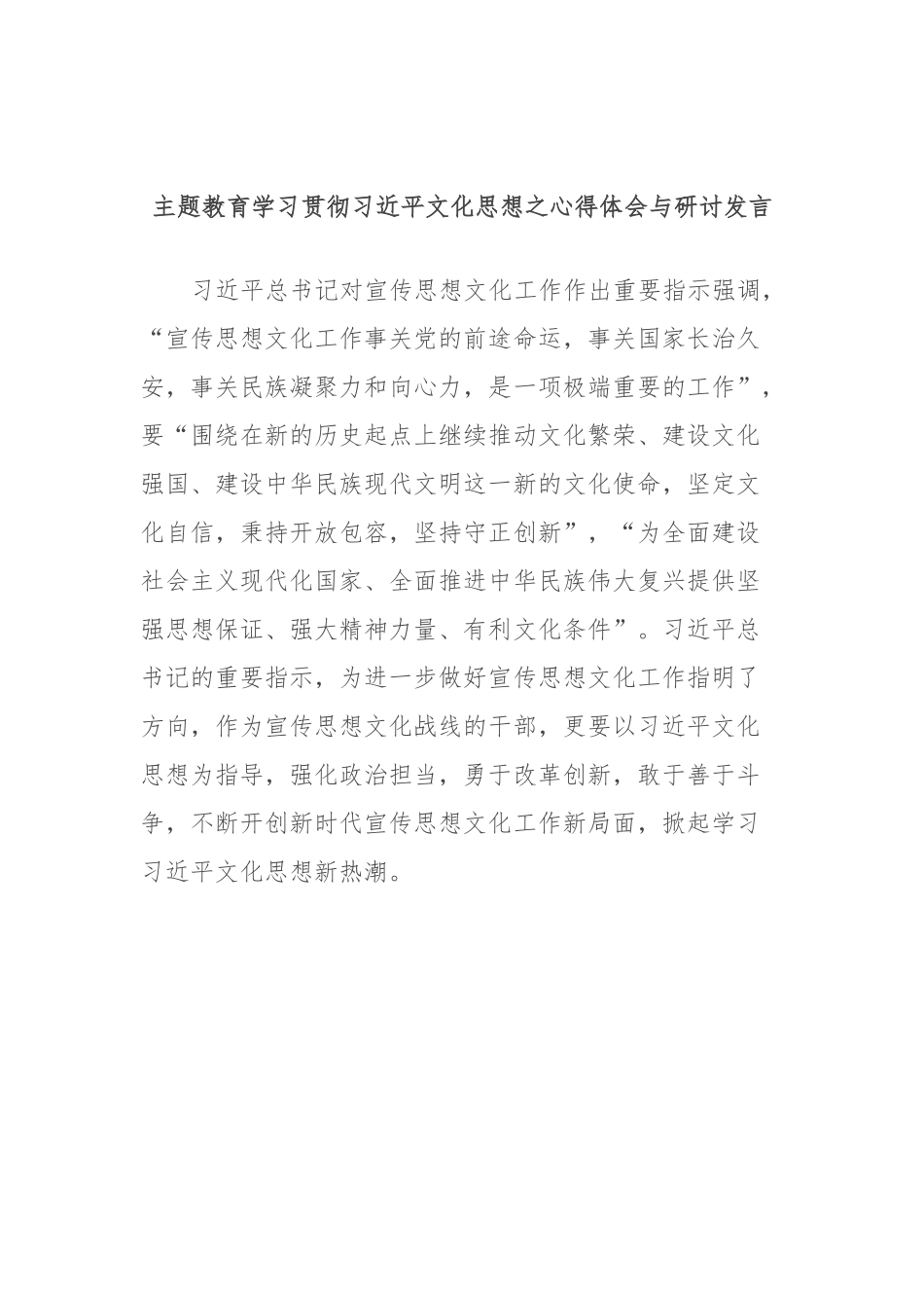 主题教育学习贯彻习近平文化思想之心得体会与研讨发言习近平总书记对宣传思想文化工作作出重要指示强调,“宣传思想文化工作事关党的前途命运,事关国家长治久安,事关民族凝聚力和向心力,是一项极端重要的工作”,要“围绕在新的历史起点上继续推动文化繁荣、建设文化强国、建设中华民族现代文明这一新的文化使命,坚定文化自信,秉持开放包容,坚持守正创新”,“为全面建设社会主义现代化国家、全面推进中华民族伟大复兴提供坚强思想保证、强大精神力量、有利文化条件”。习近平总书记的重要指示,为进一步做好宣传思想文化工作指明了方向,作为宣传思想文化战线的干部,更要以习近平文化思想为指导,强化政治担当,勇于改革创新,敢于善于斗争,不断开创新时代宣传思想文化工作新局面,掀起学习习近平文化思想新热潮。一要坚持不懈用习近平新时代中国特色社会主义思想凝心铸魂。坚持马克思主义在意识形态领域指导地位,第一位的要求就是推动全党全社会认真学习贯彻习近平新时代中国特色社会主义思想。我们要着力加强党对宣传思想文化工作的领导,深刻领悟“两个确立”的决定性意义,增强“四个意识”、坚定“四个自信”、做到“两个维护”,持续加强对习近平文化思想的学习、研究、阐释,并自觉将其贯彻落实到宣传思想文化工作各方面和全过程,推进理论学习更加制度化、规范化,通过各种学习载体和方法,不断增强自身政治判断力、政治领悟力和政治执行力,始终坚持正确的政治方向和舆论导向,运用融媒体创新手段和载体,不断加强党的创新理论宣传,通过第一议题、头条工程,推进习近平文化思想在石城大地落地见效。二要夯实基础增强理论学习成效。习近平新时代中国特色社会主义思想是我们武装头脑的科学武器,是党员干部开展工作的理论指导,也是做好工作的必行之道。其中的习近平文化思想内容全面、内涵丰富,从回望历史到展望未来,既有政治上的高瞻远瞩和理论上的深邃思考,也有目标上的科学设定和工作上的战略部署。只有制定好学习方案,带着“是什么、干什么、怎么干”的问题,认真参悟,用心体会原文;联系党章、党的XX大报告、重要讲话和相关文件一起系统全面学;完整、准确、全面领会习近平关于宣传思想文化工作的重要论述,持续从所学所得中汲取所信所用的源动力,才能为开展好宣传思想文化工作打下坚实、有力的基础,让广大党员干部学有所思、学有所得、学有所变。三要深入群众聚焦基层急难愁盼。理论的价值在于指导实践。要聚焦用党的创新理论武装全党、教育人民这个首要政治任务,紧紧围绕学习贯彻习近平文化思想,围绕贯彻党的XX大关于文化建设的战略部署,切实增强做好新时代新征程宣传思想文化工作的责任感使命感。在开展理论宣传宣讲的过程中,广大理论宣讲员要主动深入群众,把握好民意、民忧、民心。多听“民意”,宣讲员要悉心汲取民意,耐心倾听民声,找准群众喜闻乐见的宣讲形式、宣讲语言;多解“民忧”,将议大事与解难事融合在理论宣讲中,推动为群众办实事、解难事、做好事;多暖“民心”,用好各个交流平台,广泛开展理论宣讲、全民教育等活动,掀起习近平文化思想学习宣传热潮。四要唱响主旋律坚定举旗定向。宣传思想文化工作本质上是政治工作,是要巩固马克思主义在意识形态领域的指导地位,巩固全党全国各族人民团结奋斗的共同思想基础的一项极端重要的工作。“念念不忘,必有回响。”共产党人的“念”,就是对马克思主义的信仰、对社会主义和共产主义的信念。在理论教育和理论宣讲中,我们要“讲的对”,高举马克思主义旗帜,始终同以习近平同志为核心的党中央保持高度一致,踩准“节拍”、跟上“节奏”。要“抓得紧”,将讲政治守规矩贯穿到宣传思想文化工作全过程,牢牢抓紧党性原则这个“定海神针”,把握正确舆论导向,在重大方向性、原则性问题上要态度明朗、毫不含糊,使主旋律更加高昂、正气歌更加响亮、正能量更加充沛。
