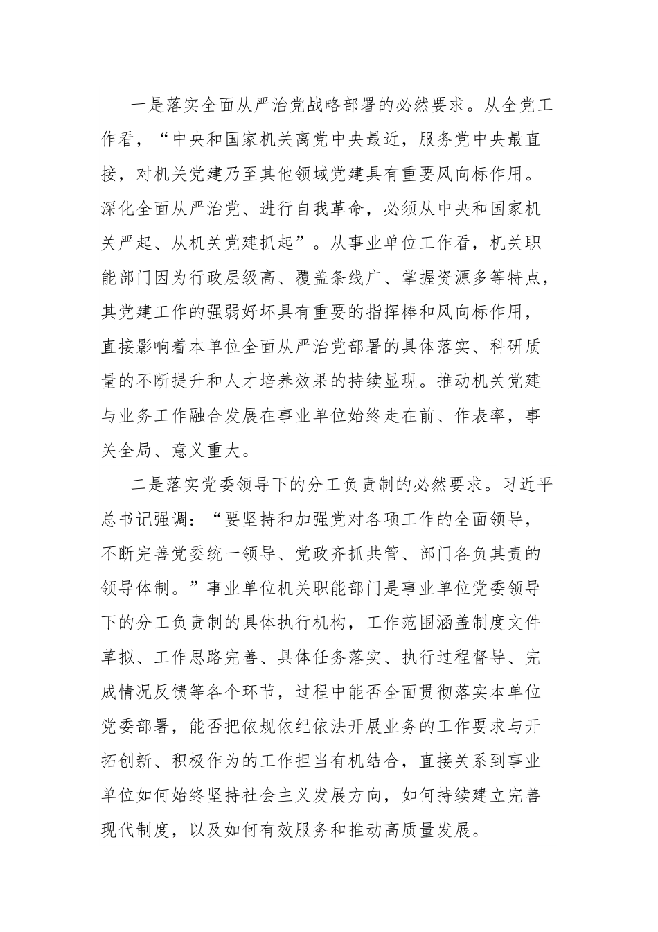 创建“四强党支部”专题党课讲稿:党建业务相融合合力开创新局面同志们:根据计划安排,今天我围绕“党建业务相融合合力开创发展新局面”为题给大家上一次党课。党的二十大报告强调要全面提高机关党建质量。习近平总书记强调要坚持党的建设与人才培养、科学研究、社会服务、文化传承创新、国际交流合作等深度融合,为促进改革发展稳定、完成党和国家重大战略任务提供思想保证、政治保证、组织保证。当前关于事业单位基层党建与业务工作融合发展的研究中,机关党建相对薄弱。实际上,有效破解事业单位机关党建与业务工作“两张皮”问题,持续深化两者的融合发展,意义重大。一、要充分认清强化事业单位机关党建与业务工作融合发展的价值与意义一是落实全面从严治党战略部署的必然要求。从全党工作看,“中央和国家机关离党中央最近,服务党中央最直接,对机关党建乃至其他领域党建具有重要风向标作用。深化全面从严治党、进行自我革命,必须从中央和国家机关严起、从机关党建抓起”。从事业单位工作看,机关职能部门因为行政层级高、覆盖条线广、掌握资源多等特点,其党建工作的强弱好坏具有重要的指挥棒和风向标作用,直接影响着本单位全面从严治党部署的具体落实、科研质量的不断提升和人才培养效果的持续显现。推动机关党建与业务工作融合发展在事业单位始终走在前、作表率,事关全局、意义重大。二是落实党委领导下的分工负责制的必然要求。习近平总书记强调:“要坚持和加强党对各项工作的全面领导,不断完善党委统一领导、党政齐抓共管、部门各负其责的领导体制。”事业单位机关职能部门是事业单位党委领导下的分工负责制的具体执行机构,工作范围涵盖制度文件草拟、工作思路完善、具体任务落实、执行过程督导、完成情况反馈等各个环节,过程中能否全面贯彻落实本单位党委部署,能否把依规依纪依法开展业务的工作要求与开拓创新、积极作为的工作担当有机结合,直接关系到事业单位如何始终坚持社会主义发展方向,如何持续建立完善现代制度,以及如何有效服务和推动高质量发展。三是落实促进发展根本任务的必然要求。事业单位的立身之本在于促进发展,机关职能部门是事业单位的综合性管理和统筹性协调机构,起着把本单位党政部署具体落实、把资源配置统筹优化、把条线工作汇总推动、把握互动梳理联结的组织实施与起承转合作用,是本单位促进发展工作环节中的关键枢纽,这中间的大量工作需要多部门紧密协作、互相融通,以保证既能方向不偏、又能有效推进,既能面上铺开、又能突出重点。优化提升事业单位机关党建与业务工作融合发展的工作效能,推动机关不断塑造风清气正的工作氛围,职能部门持续提升改革发展的能力水平,是事业单位必须大力夯实的促进发展根本之基。二、要树积极解决深化事业单位机关党建与业务工作融合发展的突出问题要坚持并不断拓展实践创新与品牌创建的工作视野,积极发挥特色党建品牌的引领作用和示范效应,改变事业单位党建与业务工作融合发展不够甚至是“两张皮”现象。一方面,要明确机关党建与业务工作融合发展并非机关党建工作业务化或者业务工作党务化,而是既互有侧重、又互相促进;另一方面,更要明确机关党建与业务工作融合发展并不是阶段性任务,而是服务于机关党建“围绕中心、建设队伍、服务群众”共性要求,以及事业单位履行五大职能和贯彻落实促进发展根本任务的基础性需要,坚定不移把推动机关党建与业务工作同步前行作为基础立足点、重要出发点和关键着力点。机关党建“要推进理念思路创新、方式手段创新、基层工作创新,创造性开展工作”,既要着力树立先进标杆、构筑载体平台,强化实践创新与品牌创建的具体可见性;又要着力营造浓厚氛围、凸显工作活力,强化实践创新与品牌创建的面上示范性;还要着力健全工作机制、完善规划蓝图,强化实践创新与品牌创建的文化引领性,从而真正实现围绕中心抓党建、抓好党建促业务,坚持党建工作和业务工作一起谋划、一起部署、一起落实、一起检查,使各项举措在部署上相互配合、在实施中相互促进,推动机关党建与业务工作同步前行。三、要掌握深化事业单位机关党建与业务工作融合发展的方式方法深化事...