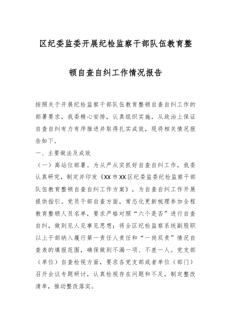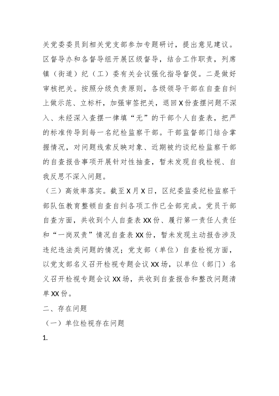 区纪委监委开展纪检监察干部队伍教育整顿自查自纠工作情况报告按照关于开展纪检监察干部队伍教育整顿自查自纠工作的部署要求,我委精心安排,认真组织实施,从政治上保证自查自纠有力有序推进并取得扎实成效,现将相关情况报告如下。一、主要做法及成效(一)高站位部署。为从严从实抓好自查自纠工作,我委认真研究,制定并印发《XX市XX区纪委监委纪检监察干部队伍教育整顿自查自纠工作方案》,为自查自纠工作开展提供指引。党员干部自查方面,常态化更新梳理参加全程教育整顿人员名单,要求严格对照“六个是否”进行自查自纠,做到见人见事见思想;将全区纪检监察系统副股职以上干部纳入履行第一责任人责任和“一岗双责”情况自查表的填报范围,确保做到不漏一项、不差一人。党支部(单位)自查检视方面,要求各党支部或者单位(部门)召开会议专题研讨,认真检视存在问题和不足,制定整改清单,推动整改落实。(二)高标准推进。一是加强严督实导。区纪委监委机关党委从严从实指导各党支部开展好自查检视工作,做好对各党支部会议召开时间、内容的谋划和审核把关。邀请市纪委监委第二督导组列席第一、第二党支部自查检视会议指派机关党委委员到相关党支部参加专题研讨,提出意见建议。区督导办和各督导组开展区级督导,结合工作职责,列席镇(街道)纪(工)委有关会议强化指导督促。二是做好审核把关。按照分级负责原则,各级领导干部在自查自纠上做示范、立标杆,加强审签把关,退回X份查摆问题不深入、未经深入查摆一律填“无”的干部个人自查表,把严的标准传导到每一名纪检监察干部。干部监督部门结合掌握情况,对问题线索反映对象、近期被约谈纪检监察干部的自查报告事项开展针对性抽查,暂未发现自我检视、自我反思不深入问题。(三)高效率落实。截至X月X日,区纪委监委纪检监察干部队伍教育整顿自查自纠各项工作已全部完成。党员干部自查方面,共收到个人自查表XX份、履行第一责任人责任和“一岗双责”情况自查表XX份,暂未发现主动报告涉及违纪违法类问题的情况;党支部(单位)自查检视方面,以党支部名义召开检视专题会议XX场,以单位(部门)名义召开检视专题会议XX场,共收到自查报告和整改问题清单XX份。二、存在问题(一)单位检视存在问题1.理论学习方面。一是政治学习有待加强。虽然严格落实“第一议题”制度,常态化传达学习习近平总书记重要讲话精神和党中央最新部署要求,也结合实际提出了贯彻落实意见,但学习的深度和广度还有所欠缺,运用XX指导纪检监察工作实践的能力还有待提高。二是学习形式不够丰富。日常开展政治理论学习多以传达文件、学习讲话精神为主,创新开展理论学习的方式还不够多,对党员干部开展政治理论学习的吸引力还不够强。三是压力传导有待提升。对政治理论学习抓得不够严,党员干部学习效果参差不齐。比如有的年轻干部对“应知应会”掌握不全;有的干部学习以应付为主,学习缺乏全面性、系统性,对党的创新理论背后蕴含的历史逻辑、理论逻辑的理解和把握不够深入透彻。2.政治素质方面。一是对政治监督的理解把握不够到位。有的派驻机构在增强“四个意识”、坚定“四个自信”、做到“两个维护”方面对标对表、看齐跟上抓的不够实,对党中央重大决策部署的理解不够透彻,对被监督单位贯彻执行党的路线方针政策的监督检查力度不足,方式方法单一,围绕中心服务大局的政治监督效果未能充分体现。二是“政治家办案”意识树得不够牢。有的镇街纪委片面追求立案数,对偶发的农村榕树头下赌博几十元的普通党员也立案审查导致撤案,导致社会效果不佳,精准查处、精准施治的能力还不够强。三是引导干部锤炼过硬政治品格上举措还不够多。日常工作中较多强调和依赖“以干代训”,在提升干部政治觉悟思想意识上方式方法不够多,党员干部政治判断力、政治领悟力、政治执行力仍需提高。3.能力本领方面。一是干部培训质效有待加强。虽然依托“清风讲坛”常态化开展全员培训,但培训方式、主题、内容还不够丰富,在深化分层分类培训、全面提升纪检监察干部综合能力水平方面思考不够深入。此外,对镇(街道)纪(工)委的培训指导做的不足。二是派驻机...