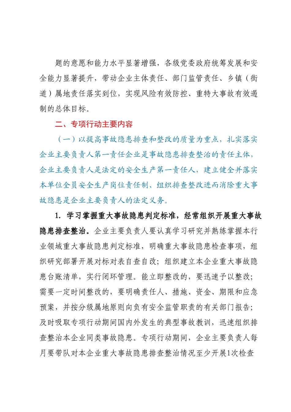 xx市重大事故隐患专项排查整治行动实施方案按照xx文件要求,根据市委、市政府工作安排,从即日起在全市开展重大事故隐患专项排查整治(以下简称“专项行动”)工作方案如下:一、总体要求(一)工作思路。认真学习贯彻党的XX大精神和习近平总关于安全生产重要论述、来陕考察重要讲话重要指示,结合彻习近平新时代中国特色社会主义思想主题教育,坚持人民至上、生命至上,坚持安全第一、预防为主,牢固树立安全生产红线意识和底线思维,严格落实国务院安全生产15条硬措施、省、xx市xx条措施要求及我市xx条具体措施,突出道路交通运输、建筑施工(含隧道施工)、危险化学品、消防、燃气、工贸等重点行业领域及旅游、特种设备、烟花爆竹、电力、校园、医疗卫生等其他行业领域,聚焦新业态新领域重大事故隐患,开展专项排查整治建立健全责任倒查机制,推动安全生产治理模式向事前预防转型为谱写我市高质量发展新篇章创造安全稳定环境。(二)工作目标。通过专项行动,全面摸清并动态掌握重大事故隐患底数,全面管控并彻底完成重大事故隐患整改,全面完善并落实重大事故隐患治理机制;推动企业排查整改重大事故隐患的质量显著提高,乡镇(街道)、行业部门发现问题和解决问题的意愿和能力水平显著增强,各级党委政府统筹发展和安全能力显著提升,带动企业主体责任、部门监管责任、乡镇(街道)属地责任落实到位,实现风险有效防控、重特大事故有效遏制的总体目标。二、专项行动主要内容(一)以提高事故隐患排查和整改的质量为重点,扎实落实企业主要负责人第一责任企业是事故隐患排查整治的责任主体,企业主要负责人是法定的安全生产第一责任人,建立健全并落实本单位全员安全生产岗位责任制、组织排查整改进而消除重大事故隐患是企业主要负责人的法定义务。1.学习掌握重大事故隐患判定标准,经常组织开展重大事故隐患排查整治。企业主要负责人要认真学习研究并熟练掌握本行业领域重大事故隐患判定标准,明确重大事故隐患检查事项,组织研究部署开展对标对表自查自改;组织建立本企业重大事故隐患台账清单,实行闭环管理。能立即整改的,要迅速予以整改;需要一定时间整改的,要明确责任人、措施、资金、期限和应急预案,并按分级属地原则向负有安全监管职责的有关部门报告;及时吸取专项行动期间国内外发生的典型事故教训,迅速组织排查整治本企业同类事故隐患。专项行动期间,企业主要负责人每月要带队对本企业重大事故隐患排查整治情况至少开展1次检查2.充分发挥管理团队和安全专家作用,全面落实企业全员安全生产岗位责任。企业主要负责人要强化管理团队安全责任落实,组织制定企业各分管负责人安全生产职责清单和本次专项行动工作清单;按规定设置安全生产管理机构或者配备专兼职安全生产管理人员;根据需要聘请行业领域安全生产专家强化技术指导,精准查找、科学治理,提高重大事故隐患排查和整改的质量。要建立健全全员安全生产岗位责任制,明确从主要负责人到一线从业人员(包括劳务派遣人员、实习生等)的安全生产岗位责任,确保人人讲安全、时时抓安全、处处有安全。3.全过程排查电焊切割等施工作业,彻底整治各类火灾事故隐患。企业主要负责人要深刻吸取近期违规动火引发的重特大事故教训,专项行动期间,每季度至少组织开展1次全员消防安全警示教育活动;要严格履行电气焊等动火作业审批手续,督促作业人员自觉遵守消防安全操作规程,明确现场监护人员,严格落实消防安全措施检查和作业过程监督。要组织对各生产经营单位的电气焊设备进行全面安全检查,严禁带病作业,不得使用淘汰或危及安全的电气焊设备。坚持举一反三组织对动火等危险作业人员以及易产生重大事故隐患的其他关键岗位人员落实岗位责任情况每季度至少进行1次全面排查,严禁聘用和招请未经安全培训合格、未取得相关证书的人员在特种作业岗位上岗作业、明确“谁招请无证人员谁负责任”的管理制度。4.全面排查外包外租等生产经营活动,坚决整治安全责任悬空等违法行为。专项行动期间,企业主要负责人要针对本企业生产经营项目和场所外包外租(包括委托、合作等类似方式)情况,每季度至少组织开展1次全面排...