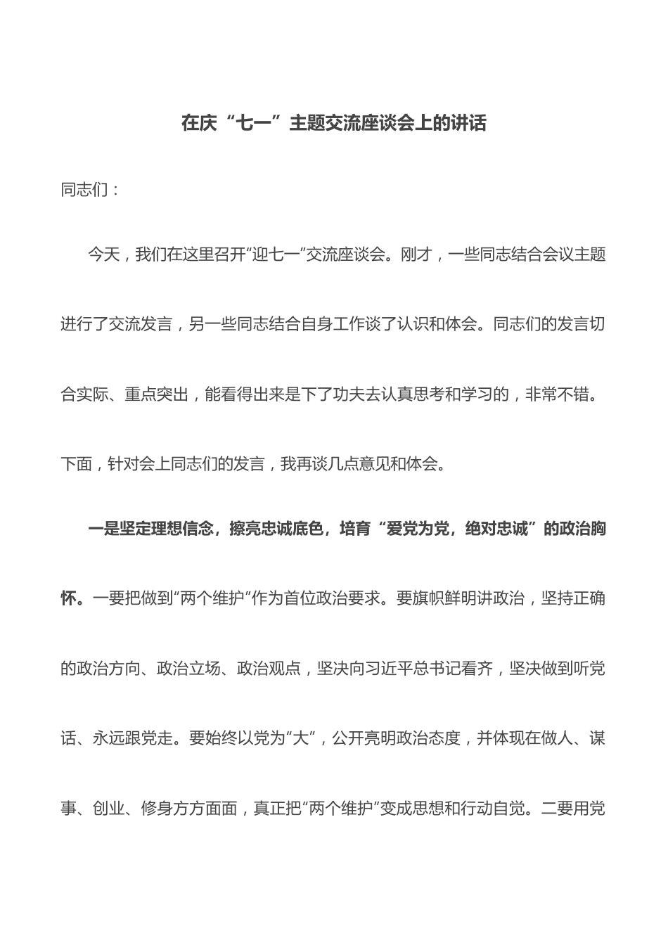 在庆“七一”主题交流座谈会上的讲话同志们:今天,我们在这里召开“迎七一”交流座谈会。刚才,一些同志结合会议主题进行了交流发言,另一些同志结合自身工作谈了认识和体会。同志们的发言切合实际、重点突出,能看得出来是下了功夫去认真思考和学习的,非常不错。下面,针对会上同志们的发言,我再谈几点意见和体会。一是坚定理想信念,擦亮忠诚底色,培育“爱党为党,绝对忠诚”的政治胸怀。一要把做到“两个维护”作为首位政治要求。要旗帜鲜明讲政治,坚持正确的政治方向、政治立场、政治观点,坚决向习近平总书记看齐,坚决做到听党话、永远跟党走。要始终以党为“大”,公开亮明政治态度,并体现在做人、谋事、创业、修身方方面面,真正把“两个维护”变成思想和行动自觉。二要用党的创新理论成果武装头脑。严格落实“第一议题”制度,深入学习习近平新时代中国特色社会主义思想,全面贯彻习近平总书记重要批示指示精神,不断提升思想政治课堂的时代性、原则性和战斗性,进一步增强广大干部的政治理论水平。三要弘扬光荣革命传统和英模精神。要将弘扬革命传统、英模精神与党史学习有机结合起来,注重依托“学习强国”等新媒体平台,利用身边的红色资源,广泛开展学习英烈事迹、英模精神活动,引导干部铭记革命历史、传承革命精神。二是坚持人民至上,牢记根本宗旨,培育“我将无我,不负人民”的爱民胸怀。一要树牢人民至上的爱民情怀。要坚持以人民为中心,带着“老百姓是我们的衣食父母”的深厚感情,立足辖区群众对安全、法治、服务等方面的新期待新需求,拓展思维、转变观念、创新方法,更高起点、更高标准地满足辖区群众对美好生活的向往,始终保持党同人民群众的血肉联系,抒写新时代新篇章。二要尊重人民群众的首创精神。我们的工作做得好不好,群众最有发言权。要集群众之智、汇群众之力,把群众工作作为重要抓手,走进企业、学校、社区、村组和群众家中,察民情、听民意、解民忧,争取群众支持我们的工作,邀请群众监督我们的工作,主动让群众评判我们的工作,借助群众力量推动各项工作高质量发展。三要真心实意为群众办实事。要紧盯群众的揪心事、烦心事、闹心事和关注的急难愁盼问题,深化各项便民利企措施落实落地,创新推出一批服务新措施,化解一批矛盾纠纷,整治一批安全隐患,真正实现让群众办事“最多跑一次”,让群众的获得感、幸福感、安全感更加充实、更有保障、更可持续。三是强化纪律作风,全面从严管党,培育“能力过硬、作风优良”的职业胸怀。一要坚持以上率下。各单位“一把手”作为第一责任人,要当好“领路人”“掌舵手”,发挥好“头雁效应”,切实担起全面从严管党的政治责任,管好“自家人”、种好“责任田”,工作部署亲自谋划、方案计划亲自把关、重点问题亲自过问,坚决不做“甩手掌柜”。二要打牢主体责任。各单位要坚持抓好各自领域的党风廉政建设工作,落实好“一岗双责”,做到书记“不甩手”、其他成员“不松手”,合力推进全面从严管党主体责任落实。三要强化执纪问责。充分运用监督执纪“四种形态”,对干部队伍中违纪违法问题,坚持有案必查、有纪必执、有腐必肃,坚持“零容忍”,做到惩戒一个,警醒一片,坚决杜绝违纪违法问题发生。我就讲这么多,谢谢大家。