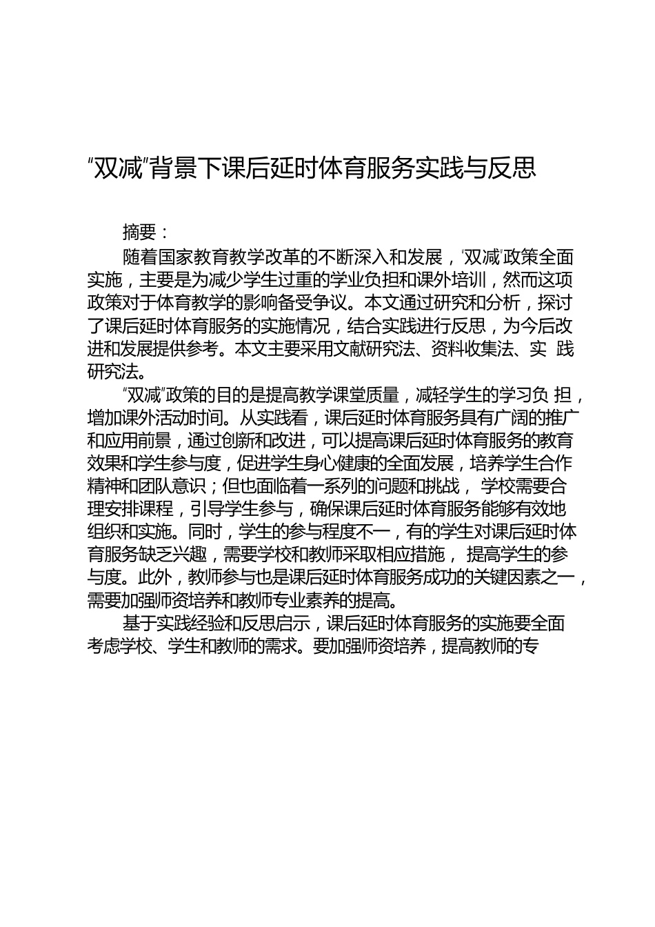 “双减”背景下课后延时体育服务实践与反思摘要:随着国家教育教学改革的不断深入和发展,“双减”政策全面实施,主要是为减少学生过重的学业负担和课外培训,然而这项政策对于体育教学的影响备受争议。本文通过研究和分析,探讨了课后延时体育服务的实施情况,结合实践进行反思,为今后改进和发展提供参考。本文主要采用文献研究法、资料收集法、实践研究法。“双减”政策的目的是提高教学课堂质量,减轻学生的学习负担,增加课外活动时间。从实践看,课后延时体育服务具有广阔的推广和应用前景,通过创新和改进,可以提高课后延时体育服务的教育效果和学生参与度,促进学生身心健康的全面发展,培养学生合作精神和团队意识;但也面临着一系列的问题和挑战,学校需要合理安排课程,引导学生参与,确保课后延时体育服务能够有效地组织和实施。同时,学生的参与程度不一,有的学生对课后延时体育服务缺乏兴趣,需要学校和教师采取相应措施,提高学生的参与度。此外,教师参与也是课后延时体育服务成功的关键因素之一,需要加强师资培养和教师专业素养的提高。基于实践经验和反思启示,课后延时体育服务的实施要全面考虑学校、学生和教师的需求。要加强师资培养,提高教师的专业素养和教学质量。要加强相关政策的制定和执行力度,确保体育课程在课后延时中得到合理安排和充分发展。综上所述,“双减”政策背景下的课后延时体育服务实践面临着诸多挑战和问题,但也蕴含着广阔的发展前景,通过课后延时体育服务的开展,学校可以为学生提供更多的体育锻炼和运动训练机会,培养学生的兴趣爱好和团队合作精神。需要通过反思和调整,进一步改进课后延时体育服务,促进学生全面发展。在实施过程中,要注意加强学校、学生和教师的合作,提高相关人员的理解和参与度,持续优化体育教学体系,才能够更好地落实“双减”政策要求,更好地促进学生的身心健康。关键词:双减政策、课后延时体育服务、实践、反思、效果评估、改进措施、展望1.研究目的“双减”政策的实施背景下,本研究旨在通过对课后延时体育服务的实践反思,研究其对体育教育的影响和面临的挑战,从而为教育改革提供可行性建议。研究目的主要是分析“双减”政策对体育课的影响。实施“双减”政策目标是减轻学生的学业负担和校外培训压力,减少课程数量和限制超纲培训,给予学生更多的自主学习时间,提高他们的综合素质和兴趣发展。然而,“双减”政策也对体育课提出了要求和限制,如学校、家长对体育课的轻视和体育师资缺口大,这对体育课的教学质量和学生身体健康发展产生了一定的冲击。因此,本研究通过分析“双减”政策对体育课的影响,为教育部门制定政策措施提供参考建议。其次,本研究意在总结课后延时体育服务的实践,针对性进行剖析反思。课后延时体育服务的引入旨在弥补课堂体育课时间的不足,并为学生提供更多的体育锻炼机会。在实施过程中,是否能够真正实现课程的延时和提高学生的参与度成为一个需要考虑和解决的问题。本研究通过对课后延时体育服务的实践情况进行分析,总结实践中的问题和挑战,并提出相应的改进措施和建议,以促进课后延时体育服务的有效实施。最后,本研究的意义还体现在为未来的体育教育改革提供思路和借鉴。“双减”政策的实施是近段时间教育改革和发展的重要内容,而体育教育对学生全面发展意义重大。通过深入分析“双减”政策对体育课的影响以及课后延时体育服务的实践反思,我们可以得到宝贵的教训和经验,为未来的体育教育改革提供参考和借鉴,更好地培养学生兴趣爱好和提升综合素质。2.研究方法2.1文献研究法主要通过公共图书馆、中国知网、互联网搜索工具等渠道查询大量的书籍、文献资料,并仔细研究国家“双减”政策和主管部门关于课后延时服务的最新要求,及延时体育服务实施面临的诸多现实问题、困难挑战和解决办法的论述,为本论文的研究提供了非常重要的理论支持。2.2资料收集法主动到任教班级内部,对全体学生的体育课程学习现状、兴趣爱好等信息进行收集,全面了解学生的学习情况、身体情况,充分征求学生延时体育服务程意愿,并结合学生特点设计出契合新时代新背景下延时体育服务特...