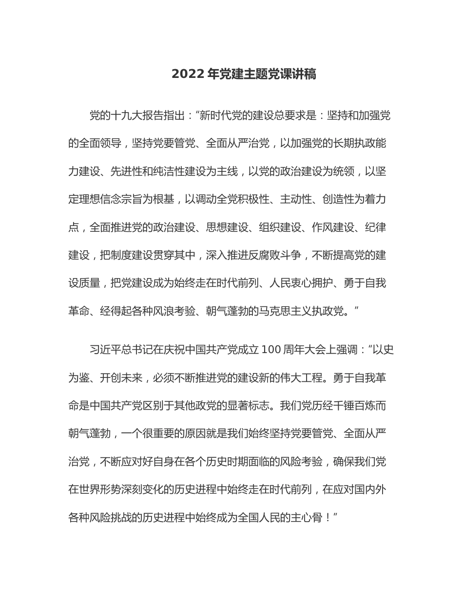 2022年党建主题党课讲稿党的十九大报告指出:“新时代党的建设总要求是:坚持和加强党的全面领导,坚持党要管党、全面从严治党,以加强党的长期执政能力建设、先进性和纯洁性建设为主线,以党的政治建设为统领,以坚定理想信念宗旨为根基,以调动全党积极性、主动性、创造性为着力点,全面推进党的政治建设、思想建设、组织建设、作风建设、纪律建设,把制度建设贯穿其中,深入推进反腐败斗争,不断提高党的建设质量,把党建设成为始终走在时代前列、人民衷心拥护、勇于自我革命、经得起各种风浪考验、朝气蓬勃的马克思主义执政党。”习近平总书记在庆祝中国共产党成立100周年大会上强调:“以史为鉴、开创未来,必须不断推进党的建设新的伟大工程。勇于自我革命是中国共产党区别于其他政党的显著标志。我们党历经千锤百炼而朝气蓬勃,一个很重要的原因就是我们始终坚持党要管党、全面从严治党,不断应对好自身在各个历史时期面临的风险考验,确保我们党在世界形势深刻变化的历史进程中始终走在时代前列,在应对国内外各种风险挑战的历史进程中始终成为全国人民的主心骨!”以上两段话,明确了新时代党的建设新的伟大工程的目标、方针和重点任务。一、加强新时代党的建设的必要性和重要性新时代,我们要高度重视和继续推进党的建设新的伟大工程。新时代党和国家的发展是一项伟大而艰巨的任务。新中国成立以来,中国共产党团结带领中国人民创造了社会主义革命和建设的伟大成就,创造了改革开放和社会主义现代化建设的伟大成就,创造了新时代中国特色社会主义的伟大成就。这些伟大成就,使我国综合国力不断增强。在经济上,2021年,我国经济总量达114.4万亿元,突破110万亿元,按年平均汇率折算达17.7万亿美元,稳居世界第二。人均国内生产总值80976元,按年平均汇率折算达12551万元,突破了1.2万美元。可以说,新中国成立以来,经过艰苦奋斗,我国的经济发展水平和人民生活水平均得到了极大提高,社会各项事业也取得了极大进步。当前,我们已经全面建成了小康社会,历史性地解决了绝对贫困问题,正在意气风发向着全面建成社会主义现代化强国的第二个百年奋斗目标迈进。《中共中央关于制定国民经济和社会发展第十四个五年规划和二〇三五年远景目标的建议》指出:“党的十九大对实现第二个百年奋斗目标作出分两个阶段推进的战略安排,即到二〇三五年基本实现社会主义现代化,到本世纪中叶把我国建成富强民主文明和谐美丽的社会主义现代化强国。”我们知道,20世纪80年代,我们的目标是,到21世纪中叶,达到中等发达国家水平。《中共中央关于制定国民经济和社会发展第十四个五年规划和二〇三五年远景目标的建议》提到,在2035年我国“人均国内生产总值达到中等发达国家水平”。这也就是说,我们达到“中等发达国家水平”这一目标的时间提前了。那么,我们到本世纪中叶的目标是什么呢?是到本世纪中叶把我国建成富强民主文明和谐美丽的社会主义现代化强国。社会主义现代化强国的标准是什么?党的十九大报告指出:“从二〇三五年到本世纪中叶,在基本实现现代化的基础上,再奋斗十五年,把我国建成富强民主文明和谐美丽的社会主义现代化强国。到那时,我国物质文明、政治文明、精神文明、社会文明、生态文明将全面提升,实现国家治理体系和治理能力现代化,成为综合国力和国际影响力领先的国家,全体人民共同富裕基本实现,我国人民将享有更加幸福安康的生活,中华民族将以更加昂扬的姿态屹立于世界民族之林。”这是我们的第二个百年奋斗目标。这个奋斗目标是振奋人心的,但要达到这个目标,我们的任务也十分繁重。2022年全国两会期间,习近平总书记深刻洞察时代发展大势,准确把握历史发展趋势,深入分析我国发展优势,从统筹中华民族伟大复兴战略全局和世界百年未有之大变局的高度,作出我国发展具有“五个战略性有利条件”的重大论断,即“有中国共产党的坚强领导”“有中国特色社会主义制度的显著优势”“有持续快速发展积累的坚实基础”“有长期稳定的社会环境”“有自信自强的精神力量”。从“有持续快速发展积累的坚实基础”这个有利条件可以看出,如果我们没有强大的物质基础做支...