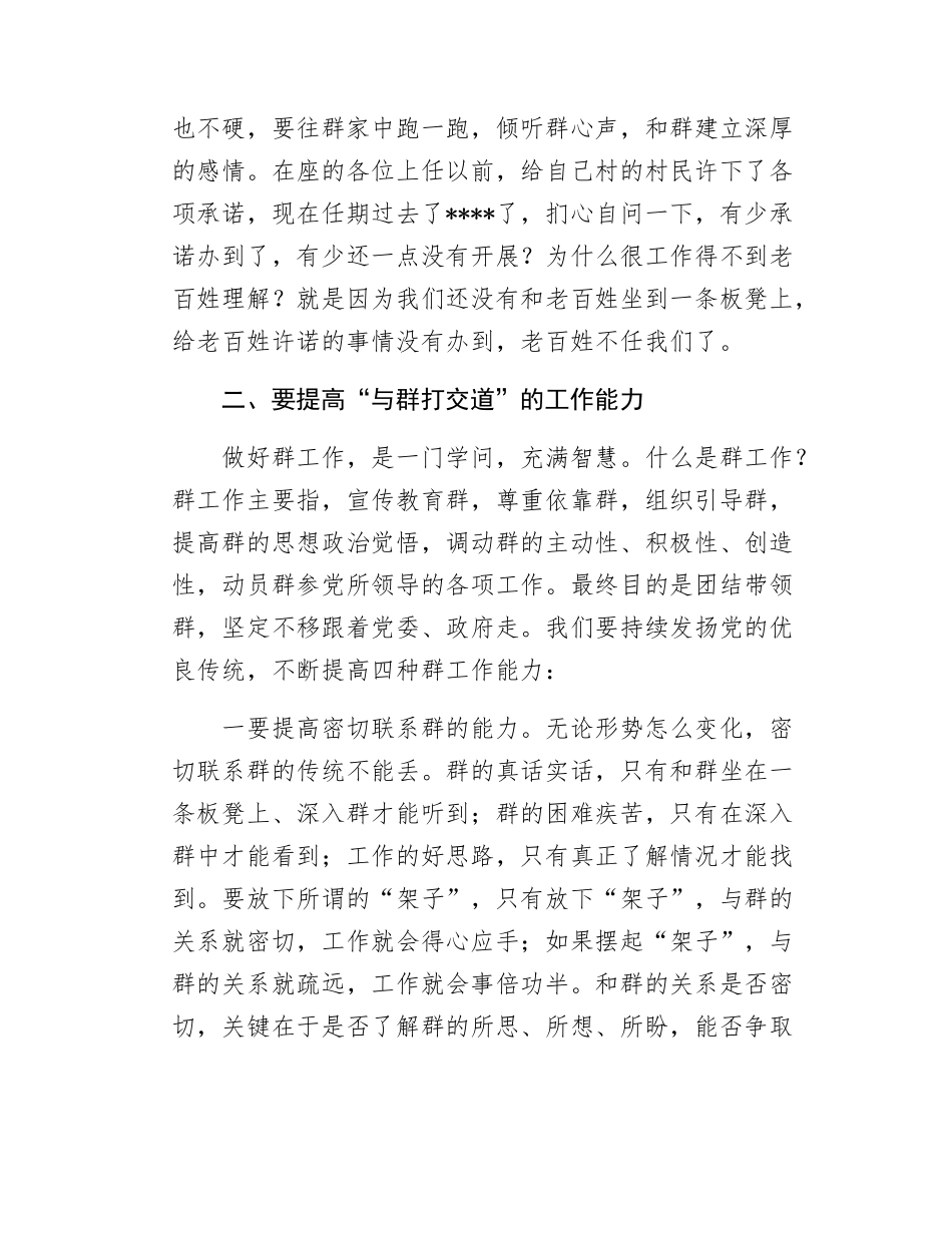 党支部书记讲党课讲稿:强作风建设锤炼过硬能力同志们:今天把大家召集起来,主要是给大家统一思想,为总结今年工作和谋划明年工作做好准备。今天我以“强作风建设,锤炼过硬能力”为主题,给大家讲讲怎么联系群,怎么落实好党委交给我们的工作。我们党靠群工作起家,同样要靠群工作实现长期执政。要把群工作作为各项工作的基础,注重提高群工作能力,走好新时代党的群路线,以实际行动赢得群支持和认可,始终与群保持鱼水关系、血肉联系。一、要涵养“把群当亲人”的为民情怀心无百姓莫为官。我们只有把群放在心上,群才会把我们记在心里。脚下沾了少泥土,心中就会沉淀少真情;我们对群有亲,群就把我们看得有重。一是要把自己当作群的一员。习近平总书记曾念过一副对联:得一官不荣,失一官不辱,勿说一官无用,地方全靠一官;穿百姓之衣,吃百姓之饭,莫道百姓可欺,自己也是百姓。总书记说,对联以浅显的语言揭示了官民关系,封建时代官吏尚且有这样的认识,今天我们共产党人应该比这个境界高得。做到“一日三省吾身”比较难,但是至少过段时间要问问自己:过去的一个周干了哪些工作、干得对不对?是否对得住自己拿的这份薪水?是否对得住自己的职务和岗位?总书记讲:“我将无我,不负人民。”中国共产党是有纯洁性、先进性和时代性的,共产党人是有情怀的。如果连为民情怀都没有,那还是合格的共产党员吗?要把群当成自己的父母、自己的兄弟姐妹、自己的亲人和家人,与群融为一体、打成一片,问政于民、问需于民、问计于民。二是要把群的事当成自己的事。办好群的事,需要党员干部换位思考、将心比心。每一位干部都应该这样想,自己的事,自己会不会很努力,自己想不想办好。所以说,只要把群的事当自己的事,就没有办不好的事。群的事,对于我们来讲可能是小事,是容易办的事,但是对于群可能就是大事、难事。群缺少了解政策的渠道,对很办事流程不清楚,向我们咨询时,要一份耐心,问一句,指一下,威自然就树立起来了。对于群反映的问题、提出的诉求,必须马上办、马上干、马上落实、马上解决,决不拖沓延误、决不推诿扯皮。三是要和群坐在一条板凳上。什么是坐在一条板凳上?就是不高高在上,这其中体现的是一种平等谦逊的态度和一份真挚的民生情怀。我们不用特意摆低姿态,因为自己本身就是群,生来就是和群坐在一条板凳上的,板凳不矮、也不硬,要往群家中跑一跑,倾听群心声,和群建立深厚的感情。在座的各位上任以前,给自己村的村民许下了各项承诺,现在任期过去了****了,扪心自问一下,有少承诺办到了,有少还一点没有开展?为什么很工作得不到老百姓理解?就是因为我们还没有和老百姓坐到一条板凳上,给老百姓许诺的事情没有办到,老百姓不任我们了。二、要提高“与群打交道”的工作能力做好群工作,是一门学问,充满智慧。什么是群工作?群工作主要指,宣传教育群,尊重依靠群,组织引导群,提高群的思想政治觉悟,调动群的主动性、积极性、创造性,动员群参党所领导的各项工作。最终目的是团结带领群,坚定不移跟着党委、政府走。我们要持续发扬党的优良传统,不断提高四种群工作能力:一要提高密切联系群的能力。无论形势怎么变化,密切联系群的传统不能丢。群的真话实话,只有和群坐在一条板凳上、深入群才能听到;群的困难疾苦,只有在深入群中才能看到;工作的好思路,只有真正了解情况才能找到。要放下所谓的“架子”,只有放下“架子”,与群的关系就密切,工作就会得心应手;如果摆起“架子”,与群的关系就疏远,工作就会事倍功半。和群的关系是否密切,关键在于是否了解群的所思、所想、所盼,能否争取群对我们工作的支持。如果群不理解、不支持,就要深刻反思方式方法和工作作风是否出现了问题。二要提高教育引导群的能力。教育引导群,关键要做好耐心细致的思想政治工作。只有把群的思想工作做通了,群心悦诚服了,才会在行动上支持我们。有些问题群一时想不通,做一遍工作不行就做两遍,两遍不行就遍,人一之我十之、人十之我百之,只要我们用群语言、少打官腔,晓之以理、动之以情,群最终会理解我们、支持我们。只要把群工作做到家,让群明白、...