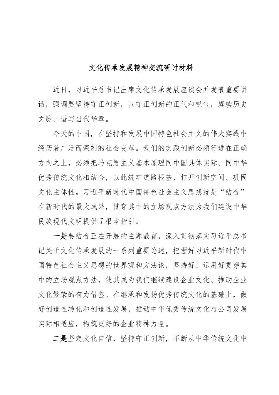 文化传承发展精神交流研讨材料近日,习近平总书记出席文化传承发展座谈会并发表重要讲话,强调要坚持守正创新,以守正创新的正气和锐气,赓续历史文脉、谱写当代华章。今天的中国,在坚持和发展中国特色社会主义的伟大实践中经历着广泛而深刻的社会变革。我们的实践创新必须行进在正确方向之上,必须把马克思主义基本原理同中国具体实际、同中华优秀传统文化相结合,以此筑牢道路根基、打开创新空间、巩固文化主体性。习近平新时代中国特色社会主义思想就是“结合”在新时代的最大成果,贯穿其中的立场观点方法为我们建设中华民族现代文明提供了根本指引。一是要结合正在开展的主题教育,深入贯彻落实习近平总书记关于文化传承发展的一系列重要论述,把握好习近平新时代中国特色社会主义思想的世界观和方法论,坚持好、运用好贯穿其中的立场观点方法,使其成为我们继续建设企业文化、推动企业文化繁荣的有力借鉴。在继承和发扬优秀传统文化的基础上,做好创造性转化和创造性发展,推动中华优秀传统文化与公司发展实际相适应,构筑更好的企业精神力量。二是坚定文化自信,坚持守正创新,不断从中华传统文化中汲取智慧和力量,充分运用中华民族优秀传统文化的宝贵资源,探索面向未来的理论和制度创新。坚持解放思想,面对当前复杂的市场环境形势,深刻认识产生的各种新问题,针对今年财务工作中出现的新情况、新问题,深入分析,运用好中华文明发展规律中蕴含的宝贵历史经验和政治理论成果,抓管理促改革,不断提升财务工作。三是继承和发扬艰苦奋斗精神,自觉用中华优秀传统文化培根铸魂、启润心智,凝聚起万众一心加油干、越是艰险越向前的精神力量。作为班子一员,要不断提升管理和领导能力,切实履行好岗位职责,强化督导检查。要发挥好参谋助手作用,把宾馆要求与工作实际、员工需求有机结合。要有使命职责在肩,艰苦奋斗有我的血性担当,以守正创新的正气和锐气,实现服务大局服务宾馆、服务员工群众三统一,推动各项工作再上新台阶。
