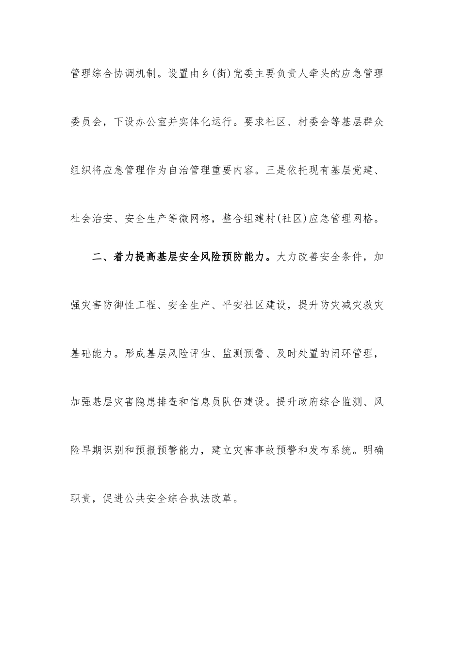 “加强基层应急管理能力建设”专题研讨发言提纲(7篇)“加强基层应急管理能力建设”专题研讨发言1党的十八大以来,以同志为核心的党中央高度重视应急管理体系和能力建设,总书记亲自部署谋划,推动应急管理体制改革,“全灾种、大应急”的中国特色大国应急管理体系已基本形成。就加强基层应急管理能力建设,谈四点意见:一、加快推进基层应急管理体制改革。通过加强顶层设计,理顺各级各部门应急管理职责分工,特别是明确县级应急部门和相关部门的重点工作和目标任务,建立乡(街)应急管理机构设置标准和工作机制:一是国家出台基层应急管理机构设置的指导性规则,制定基层应急管理人员编制和装备配备指导性标准。二是调整优化应急管理综合协调机制。设置由乡(街)党委主要负责人牵头的应急管理委员会,下设办公室并实体化运行。要求社区、村委会等基层群众组织将应急管理作为自治管理重要内容。三是依托现有基层党建、社会治安、安全生产等微网格,整合组建村(社区)应急管理网格。二、着力提高基层安全风险预防能力。大力改善安全条件,加强灾害防御性工程、安全生产、平安社区建设,提升防灾减灾救灾基础能力。形成基层风险评估、监测预警、及时处置的闭环管理,加强基层灾害隐患排查和信息员队伍建设。提升政府综合监测、风险早期识别和预报预警能力,建立灾害事故预警和发布系统。明确职责,促进公共安全综合执法改革。三、切实加强基层应急救援力量体系建设。立足“全灾种、大应急、综合性”要求,重构县、乡(街)、村(社区)综合性应急救援力量体系。一是建立县级应急救援力量体系,在每个县建成一支综合应急救援队伍基础上,设立以重点乡(街)为核心、辐射周边的区域应急救援中心。在乡(街)、有条件的村(社区)构建“一专多能”基层应急救援队伍。二是建立约束和激励机制,在规范发展的同时,通过多种方式支持引导辖区应急社会力量发展,把他们纳入基层应急救援力量体系。三是建立符合应急管理职业特点的待遇保障政策。四、大力普及安全应急宣传教育。加强教育培训,提升党员干部应急处置能力和全社会的认知度参与度。一是以社区、乡村、学校、企业等基层组织和单位为重点,推进建立政府主导和社会参与相结合,全民动员、协调联动的应急管理宣传教育培训工作格局。二是将应急管理相关法律法规和政策规定纳入基层干部考核评价和教育培训。三是加快建立完整应急教育体系,加快应急管理类大学、专业院校及职业学院建设,鼓励综合性大学建设应急管理二级学科;把安全素质教育纳入国民教育体系,把应急自救能力培养列为中小学生安全教育必修课。四是广泛开展应急管理“五进五有”(进企业、进农村、进社区、进学校、进家庭;有机构、有预案、有队伍、有后勤保障、有科普宣教)活动,常态化组织群众开展应急疏散和紧急避险演练,推动群众从“要我安全”到“我要安全、我会安全、我能安全”的转变。“加强基层应急管理能力建设”专题研讨发言2基层应急管理是国家治理能力的重要组成部分。从调研情况看,存在的问题是:应急管理机构改革尚待进一步向基层延伸;应急管理工作机制尚不够健全;基层在监管执法能力、综合保障能力、风险防范能力等方面普遍偏弱发展不平衡,应急管理投入差别较大,总体看尚有不足。建议如下:一、中央层面出台相关文件,把思想认识行动统一到总书记的重要指示精神上来。充分认识乡镇街道应急管理能力在国家治理体系和治理能力中的重要地位和作用,充分认识我国正处于长期积累的安全隐患集中显现期,安全形势严峻。必须增强紧迫感,时不我待,加大基层应急管理投入,补齐短板。建议以中办、国办名义出台进一步提升基层应急管理能力的意见,统一思想认识,解决基层应急管理急需解决的突出问题。二、进一步厘清县区与乡镇街道应急管理职责定位。包括日常安全监管、应急响应、风险评估、指挥调度、物资储备和战时保障、应急救援队伍建设等,既不要乡镇街道承担无限责任,也不要由县区包办。把应急预案、工作机构、住文但陪在建边计拉好三、落实依法赋予乡镇街道的综合管理权和应急处置权。落实属地管理责任,加强统筹,实现平时协同监管,战时统一指挥,拉得动,打得赢。建议在...