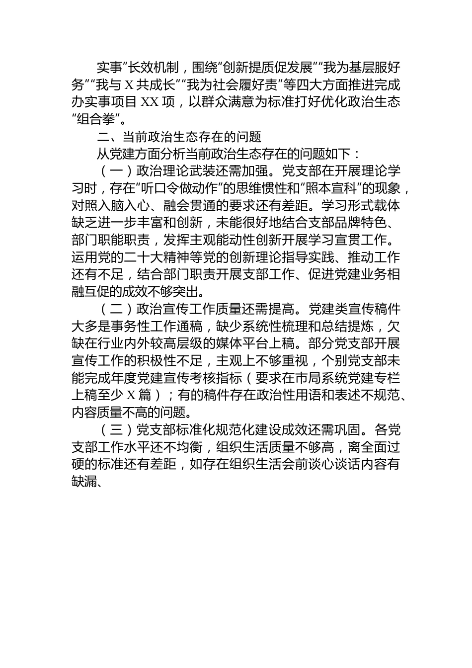 市局2022年度政治生态情况分析研判报告2022年度,市局坚持以习近平新时代中国特色社会主义思想为指导,全面贯彻党的二十大、十九届六中全会精神,围绕中心大局,立足职能职责,全面推进党的建设各项工作提质增效,不断推动政治生态持续向好。现将2022年度政治生态情况分析研判如下:一、2022年度主要工作开展情况(一)以更高站位加强党的政治建设。坚持以党的政治建设为统领,把“两个维护”作为最根本的政治纪律和政治规矩,落实到抓党建工作具体实践上。深抓政治思想引领,严格落实“第一议题”制度,发挥党组示范领学作用,通过党委会、中心组学习、党支部“三会一课”等形式,跟进学习习近平总书记最新重要讲话和重要指示批示精神,不断增强“四个意识”、坚定“四个自信”、做到“两个维护”。全年开展中心组集中学习XX天,研讨交流XX场;召开党委会XX次。严抓党建责任落实,制定年度党建要点、列出党建任务清单,每季度召开领导小组会议统筹推进工作;重点抓好党建工作日常指导、述职评议、考核督查等工作,不断夯实一级抓一级、层层抓落实的责任体系。常抓意识形态工作,开展专题学习研讨,定期分析研判全局意识形态工作,牢牢掌握党对意识形态工作的领导权。(二)以更大力度深化理想信念教育。把学习宣传贯彻党的二十大精神作为首要政治任务,制定工作方案,开展专题学习研讨、专家辅导、读书班、线上考学、青年宣讲等活动,掀起学习二十大、奋进新征程的热潮。建立党史学习教育常态化长效化机制,通过教育培训、党性锤炼微党课竞赛、“月读一书”、过“政治生日”、课题研究、微团课开发等多种形式,把学党史、强信念作为必修课融入日常,涌现出“十佳微党课”、《青春的XX》等一批优质课程,不断增强党员政治信仰和理想信念,凝聚推动高质量发展的奋进力量。(三)以更严机制规范党内政治生活。以“提升党建引领基层治理效能”为主题,推动实施《加强党的基层组织建设三年工作实施方案》,持续夯实党的基层组织建设基础全面落实党支部标准化规范化建设评价体系,开展专题培训X场次、全覆盖检查督导XX场次、全方位考核验收X场次,有效推动支部建设提质增效。严肃开展党内组织生活,编印工作指引,高标准完成民主生活会、组织生活会等重点工作,督促各党支部规范开展“三会一课”、主题党日、补选委员、发展党员等工作。发挥考核“指挥棒”作用,把党建工作考核拓展延伸到各单位,各党支部制定落实党业融合措施,推动党支部建设全面进步。(四)以更实举措推动发挥“两个作用”。开展年度“两优一先”评选表彰活动,评选出优秀共产党员X名、优秀党务工作者X名、先进基层党组织X个,引导各党支部和党员对标先进、创先争优。扎实推进学习型、创新型、攻坚型、服务型模范机关先进单位和先进个人创建工作,以工作业绩检验创建成效。坚持党的群众路线,建立健全“我为群众办实事”长效机制,围绕“创新提质促发展”“我为基层服好务”“我与X共成长”“我为社会履好责”等四大方面推进完成办实事项目XX项,以群众满意为标准打好优化政治生态“组合拳”。二、当前政治生态存在的问题从党建方面分析当前政治生态存在的问题如下:(一)政治理论武装还需加强。党支部在开展理论学习时,存在“听口令做动作”的思维惯性和“照本宣科”的现象,对照入脑入心、融会贯通的要求还有差距。学习形式载体缺乏进一步丰富和创新,未能很好地结合支部品牌特色、部门职能职责,发挥主观能动性创新开展学习宣贯工作。运用党的二十大精神等党的创新理论指导实践、推动工作还有不足,结合部门职责开展支部工作、促进党建业务相融互促的成效不够突出。(二)政治宣传工作质量还需提高。党建类宣传稿件大多是事务性工作通稿,缺少系统性梳理和总结提炼,欠缺在行业内外较高层级的媒体平台上稿。部分党支部开展宣传工作的积极性不足,主观上不够重视,个别党支部未能完成年度党建宣传考核指标(要求在市局系统党建专栏上稿至少X篇);有的稿件存在政治性用语和表述不规范、内容质量不高的问题。(三)党支部标准化规范化建设成效还需巩固。各党支部工作水平还不均衡,组织生活质量不够高,离全面过...
