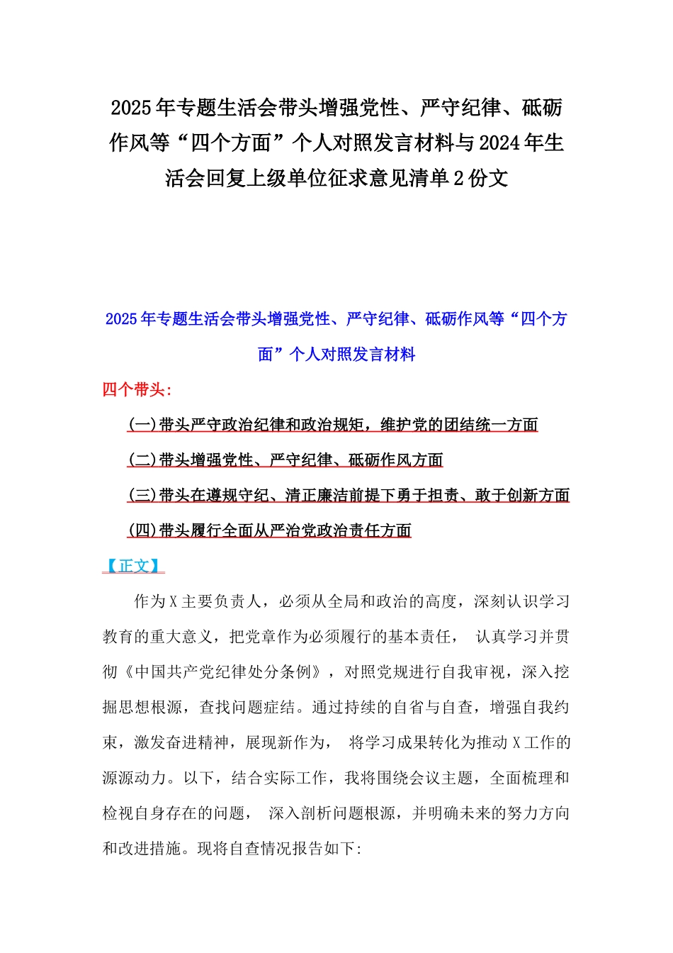 2025年专题生活会带头增强党性、严守纪律、砥砺作风等“四个方面”个人对照发言材料与2024年生活会回复上级单位征求意见清单2份文2025年专题生活会带头增强党性、严守纪律、砥砺作风等“四个方面”个人对照发言材料四个带头:(一)带头严守政治纪律和政治规矩,维护党的团结统一方面(二)带头增强党性、严守纪律、砥砺作风方面(三)带头在遵规守纪、清正廉洁前提下勇于担责、敢于创新方面(四)带头履行全面从严治党政治责任方面【正文】作为X主要负责人,必须从全局和政治的高度,深刻认识学习教育的重大意义,把党章作为必须履行的基本责任,认真学习并贯彻《中国共产党纪律处分条例》,对照党规进行自我审视,深入挖掘思想根源,查找问题症结。通过持续的自省与自查,增强自我约束,激发奋进精神,展现新作为,将学习成果转化为推动X工作的源源动力。以下,结合实际工作,我将围绕会议主题,全面梳理和检视自身存在的问题,深入剖析问题根源,并明确未来的努力方向和改进措施。现将自查情况报告如下:一、存在问题(一)带头严守政治规矩和政治纪律方面在严守政治规矩和政治纪律方面,由于对其深刻内涵和实践要求理解不够透彻,导致在具体工作中存在一定的疏漏。尽管能够遵循表面的纪律要求,但在处理一些复杂问题时,缺乏足够的敏感性和细致入微的觉悟。有时会因为日常工作压力较大,过于关注工作的执行和推进,而忽视了细节上的纪律把控。这种不足造成了在某些情况下,党内决策部署的落实不够迅速和到位,影响了党组织的执行力和纪律性。同时,面对一些复杂的政治局面,缺乏足够的政治敏感度和应对策略,未能及时向党组织报告一些潜在的政治风险,导致在思想认识上出现偏差,未能充分发挥学习教育的警示作用。尽管我在理论学习上保持持续关注,但对政治规矩的遵守有时仍显得不够深入和全面,未能完全做到从根本上落实到实际工作中。今后,我将进一步加强纪律和规矩的学习和思考,增强政治敏感性,做到在任何决策和执行过程中都能严格遵守政治纪律和规矩,确保从根本上提高工作效率和党组织的凝聚力。(二)带头增强党性,严守纪律,砥砺作风方面在增强党性、严守纪律、砥砺作风方面,我始终保持着对党忠诚的政治信念,但有时在自我约束和行为规范上有所欠缺。具体来说,虽然日常生活中能够严格要求自己,但在实际工作中,对纪律和作风的执行力还不够坚决。在面对工作压力和外部挑战时,偶尔会出现执行不到位的现象,尤其是在团结协作、作风建设方面,有时未能及时提醒自己从党性角度审视问题,导致团队管理中作风建设不够扎实,团队的凝聚力有所削弱。此外,对于学习教育的学习不够系统和深入,尤其是对党性修养的实际运用有时显得不够灵活。尽管自己自觉地参与党性学习,但未能在思想上真正做到深刻反思和自我超越,未能完全通过党性学习教育提升自己处理工作和生活中的复杂问题的能力。因此,我认识到自己在这方面的努力还不够充分,今后需要通过更高标准的自我要求,不断加强党性教育,从思想上做到不折不扣地严守纪律,砥砺作风,改进工作作风和方法。(三)带头在遵规守纪、清正廉洁前提下勇于担责,敢于创新方面在遵规守纪、清正廉洁的前提下,我始终要求自己保持清正廉洁的工作作风,然而,在创新和敢于担当方面,自己仍然存在一定的不足。具体表现在,尽管在一些工作中勇于提出自己的见解,但在具体推进过程中,仍显得谨小慎微,缺乏足够的创新精神和风险承担意识。这种态度虽然避免了某些失误,但也影响了工作的效率和创新的步伐。此外,在面对复杂问题时,有时过于注重遵循已有的规则和流程,缺乏足够的灵活性和创新性。这种态度使得工作中出现了“创新不足”的问题,无法有效突破瓶颈,推动更大范围的改革和创新。尽管在廉洁自律方面没有出现问题,但在创新意识上却存在一定的局限,未能很好地激发团队成员的创新热情。未来,我将更加注重鼓励创新,强化责任担当,同时,在确保遵规守纪的前提下,敢于担当、勇于创新,推动工作的新突破。(四)带头履行全面从严治党政治责任方面在履行全面从严治党政治责任方面,尽管我在工作中始终将党风廉政建设摆在重要位置,但在落实过程中,...